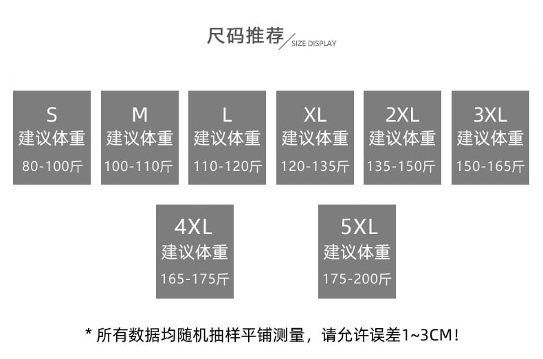 サイズ:Sコード(80~95斤),Mコード(95-108キャティ),Lコード(108~118斤),XLコード(118~128斤),2XLコード(128-140キャティ),3XLコード(140~160斤),4XLコード(160~180斤),5XLコード(180-200キャティ)