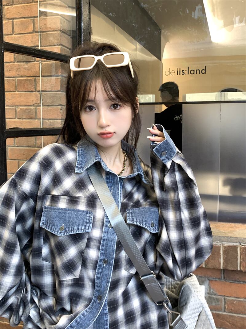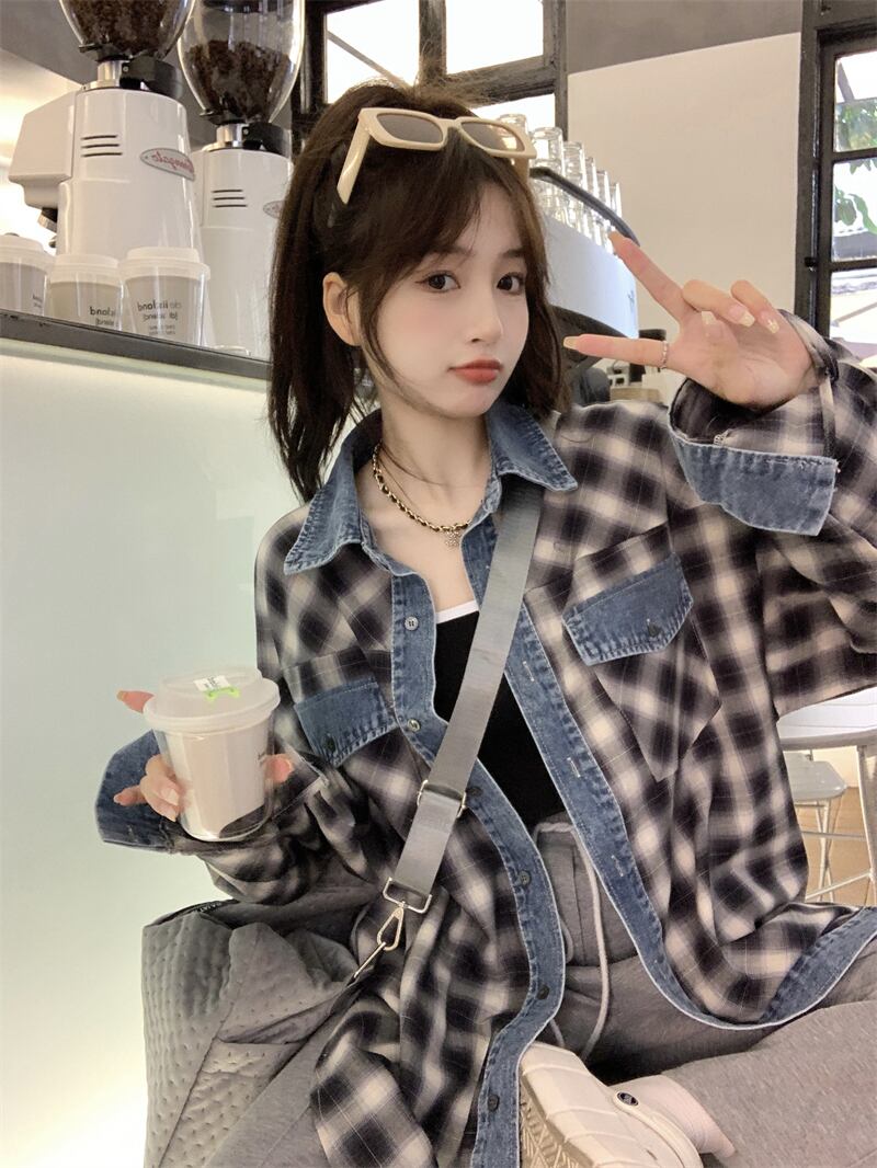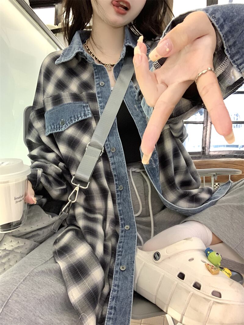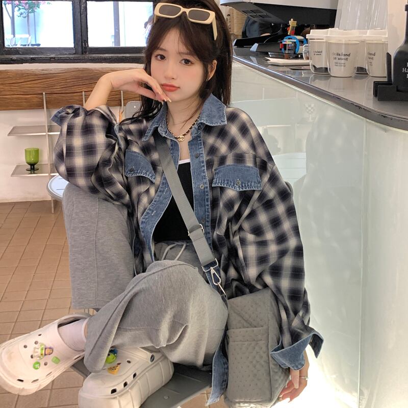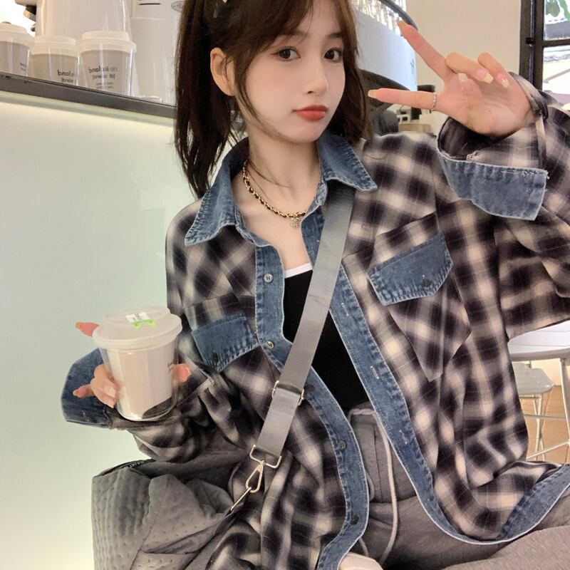 大きいサイズの婦人服 2023 春服脂肪姉妹新しいデニムスプライシング格子縞のシャツルーズカジュアルアウターシャツ 大きめサイズ スプリング 春物 8884181023146826