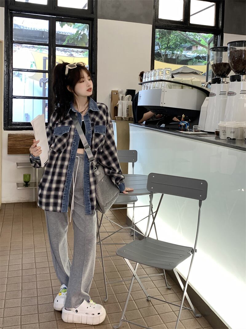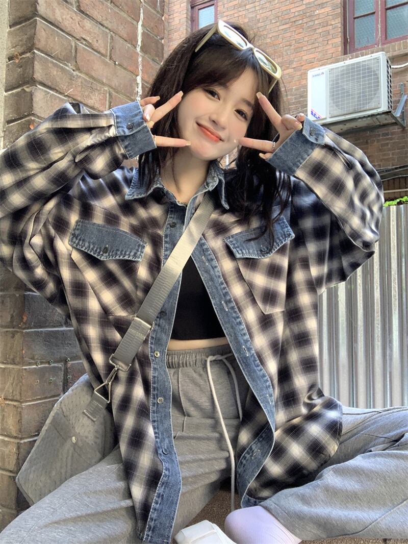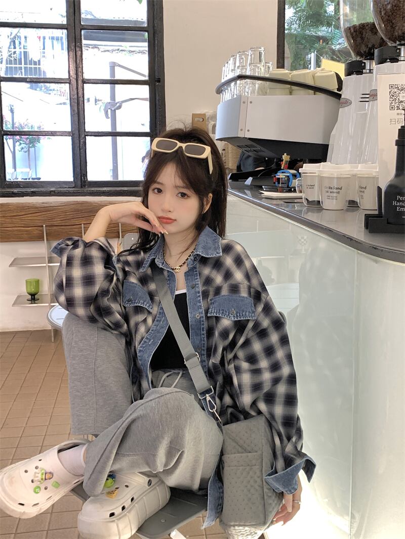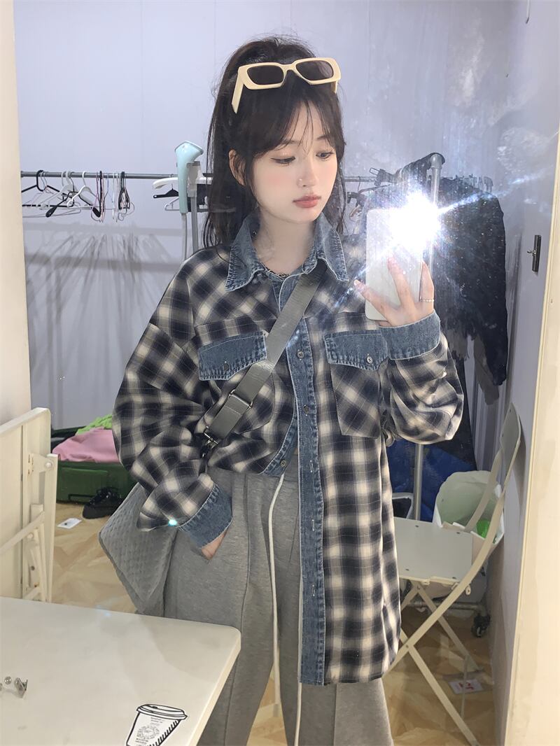 大きいサイズの婦人服 2023 春服脂肪姉妹新しいデニムスプライシング格子縞のシャツルーズカジュアルアウターシャツ 大きめサイズ スプリング 春物 8884181023146826