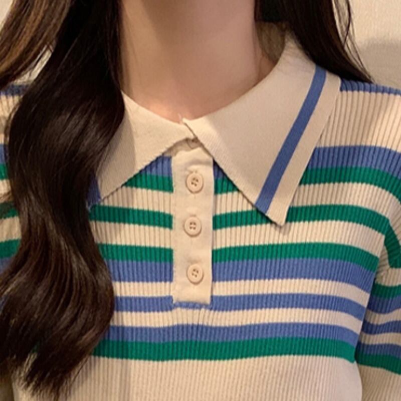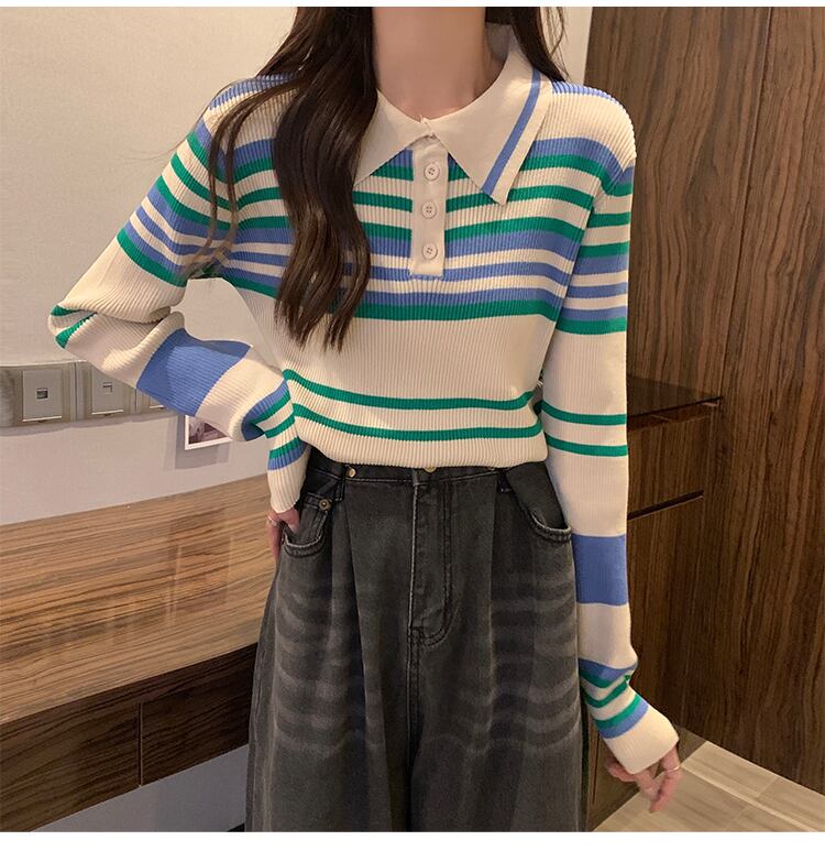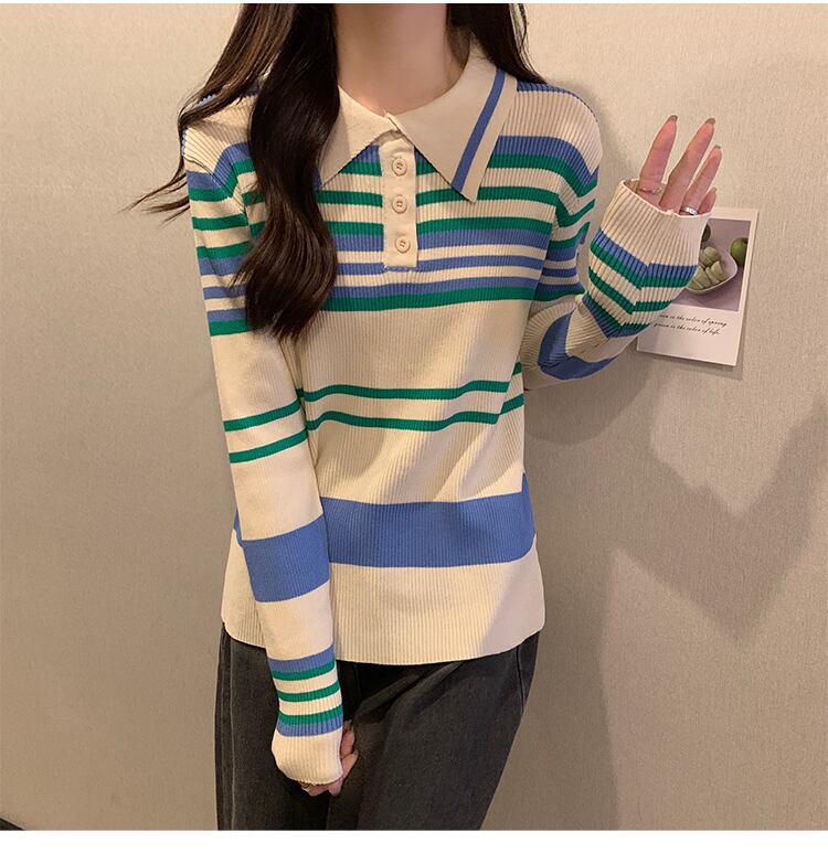 大きいサイズの婦人服 2023 春の新しいスタイルの太った姉妹年齢削減スリム ニッチ長袖ポロ襟ストライプ シックなトップ ロング 大きめサイズ スプリング 春物 8884183211654404