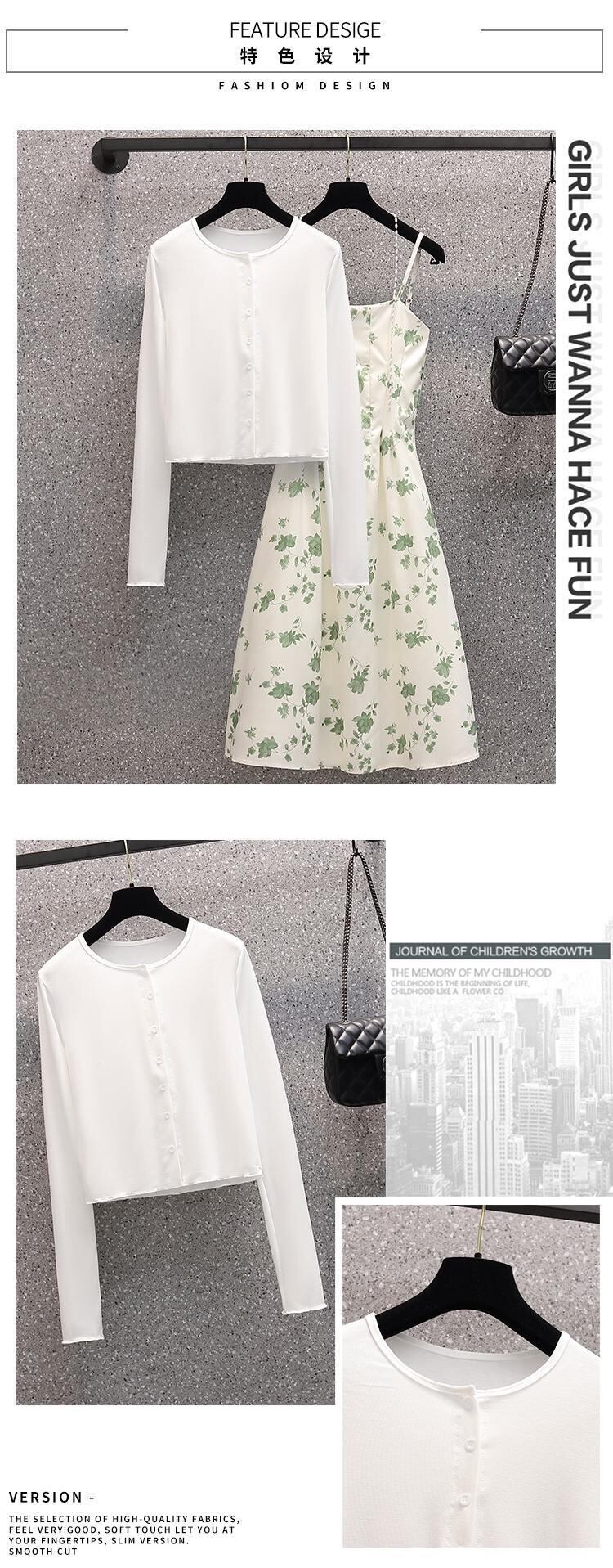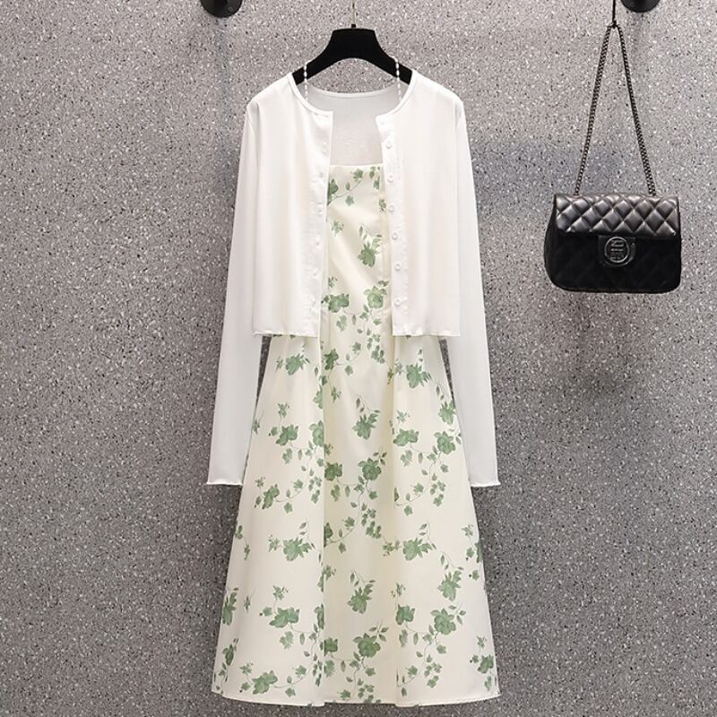 プラスサイズの婦人服 2023 夏新脂肪姉妹無地カーディガンシャツ花柄サスペンダードレス 2 点セット 大きめサイズ サマー 夏物 ソリッドカラー 8884119412236832