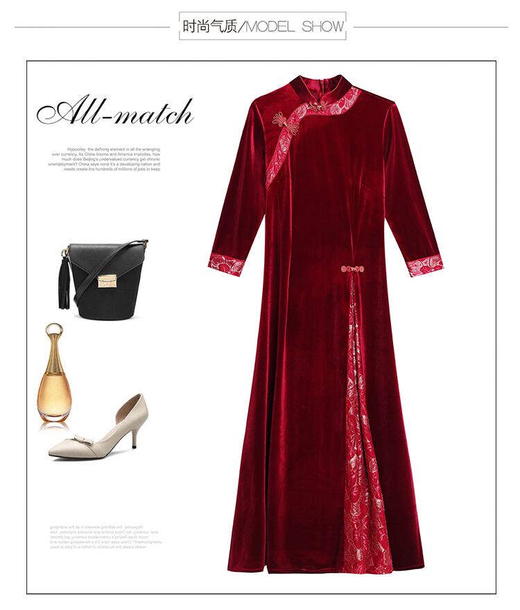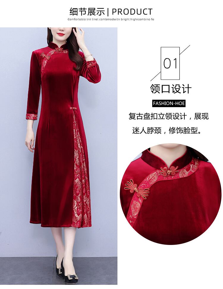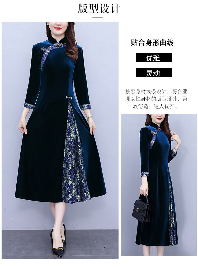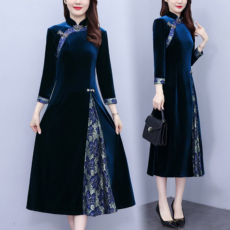 プラスサイズの婦人服 2023 春服脂肪姉妹新しいレトロな金のベルベットのチャイナドレススリムファッション長袖ドレス ロング 大きめサイズ スプリング 春物 8884184207761055