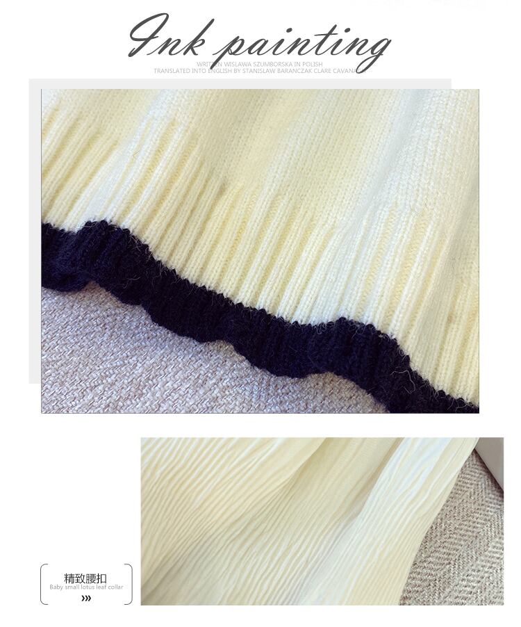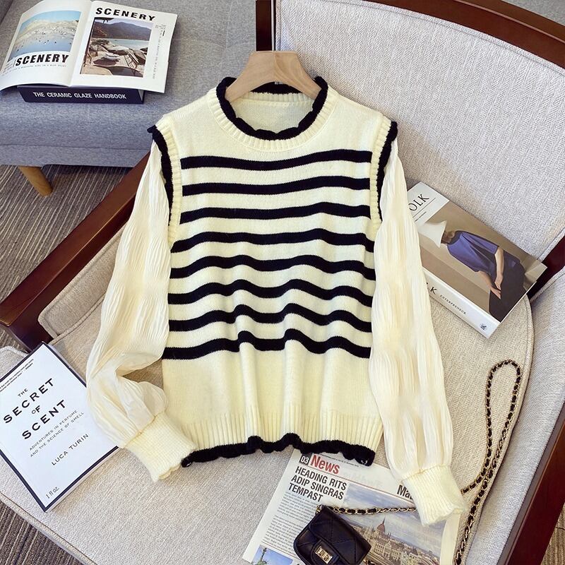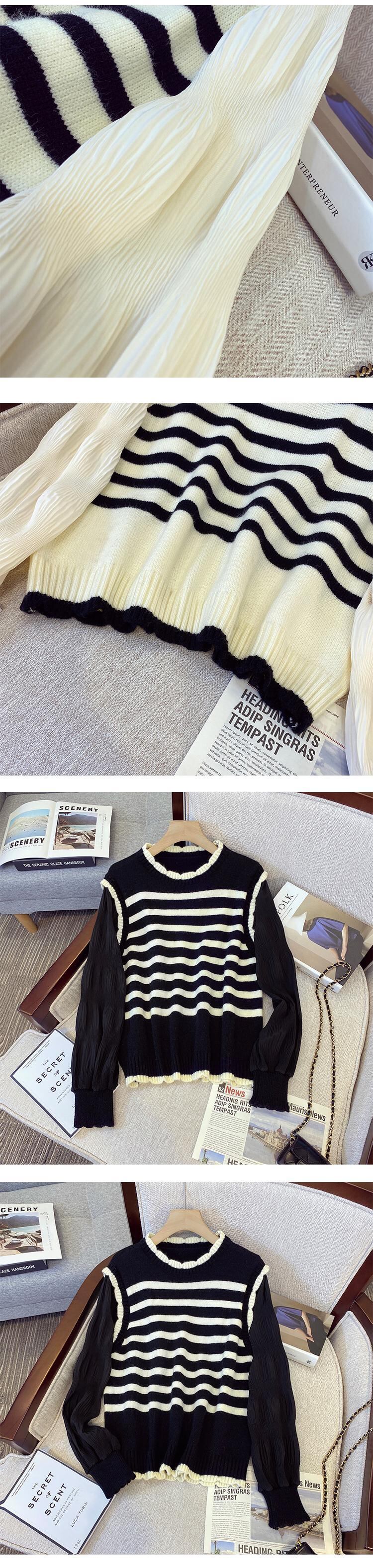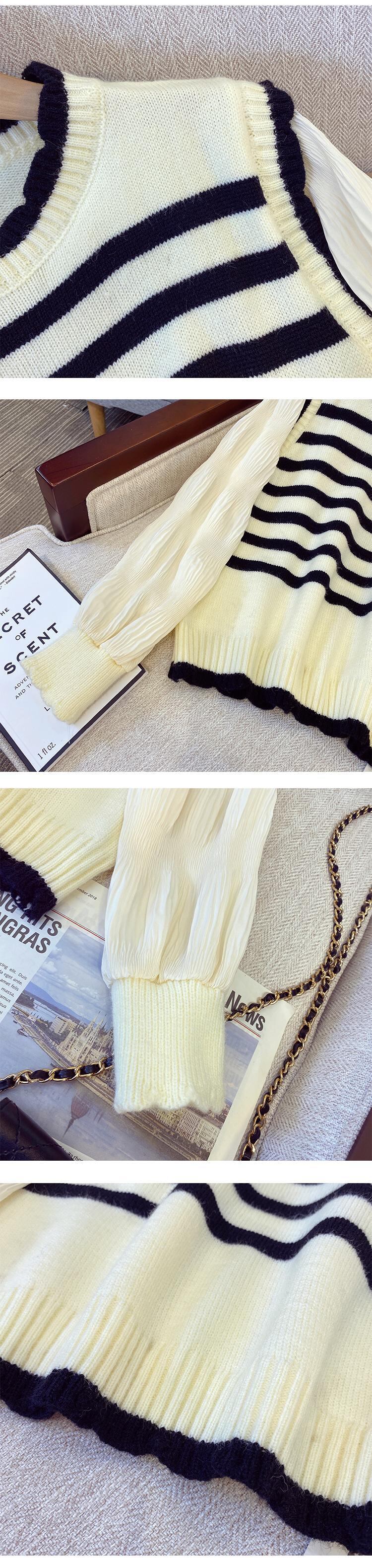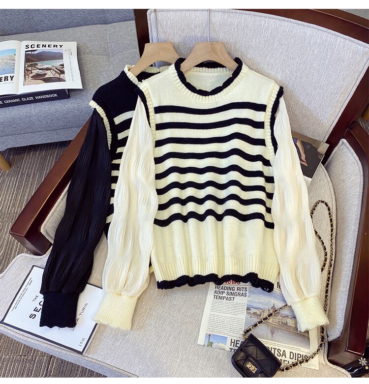 大きいサイズの婦人服 2023 春の新しいファット シスター シックなスプライシング フェイク ツーピース ストライプ ラウンド ネック カジュアル ニットウェア 大きめサイズ スプリング 春物 Oネック 88841705867568