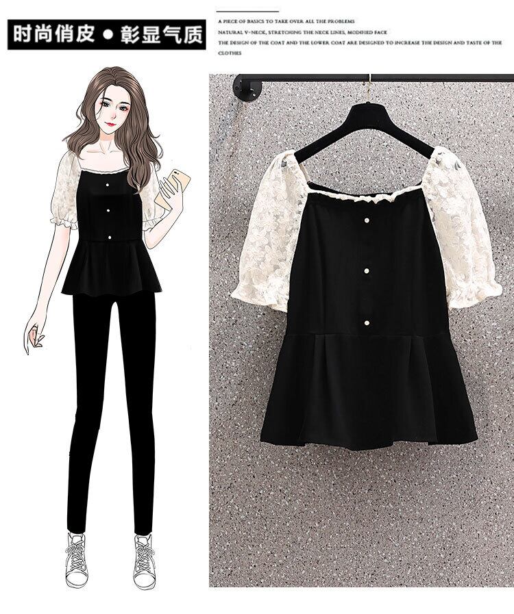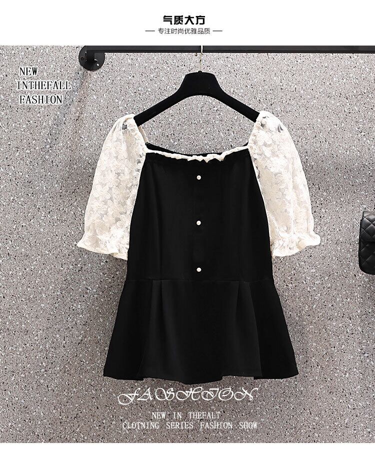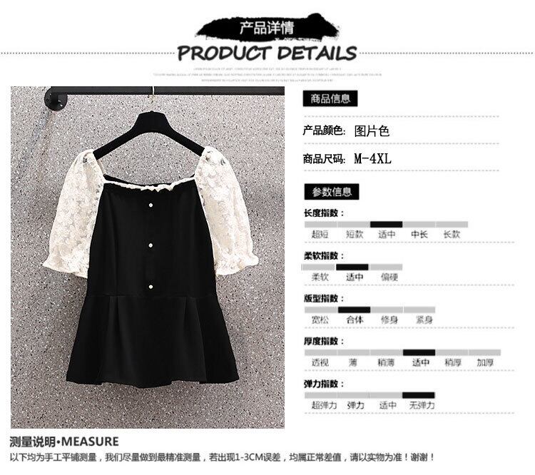 大きいサイズの婦人服 2023 夏の新しいスタイルの脂肪姉妹気質スプライシングレーススクエアカラースリムカジュアルシャツ 大きめサイズ サマー 夏物 スクウェア 8884179082195563
