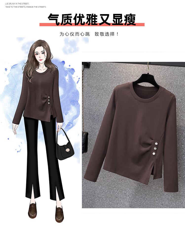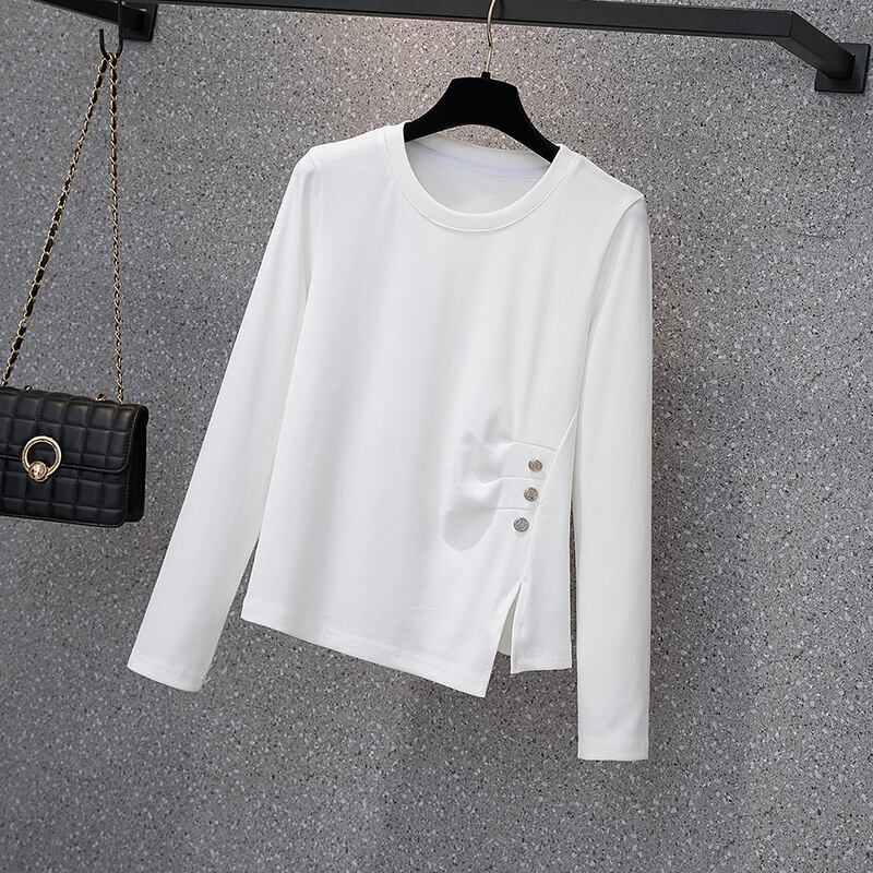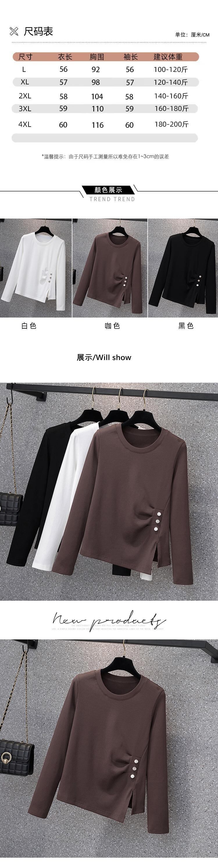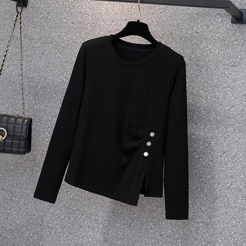 大きいサイズの婦人服 2023 春の新しいファット シスター デザイン センス ニッチ 無地 オールマッチ プリーツ ラウンド ネック ボトムス シャツ 大きめサイズ スプリング 春物 Oネック ソリッドカラー 888411938793103