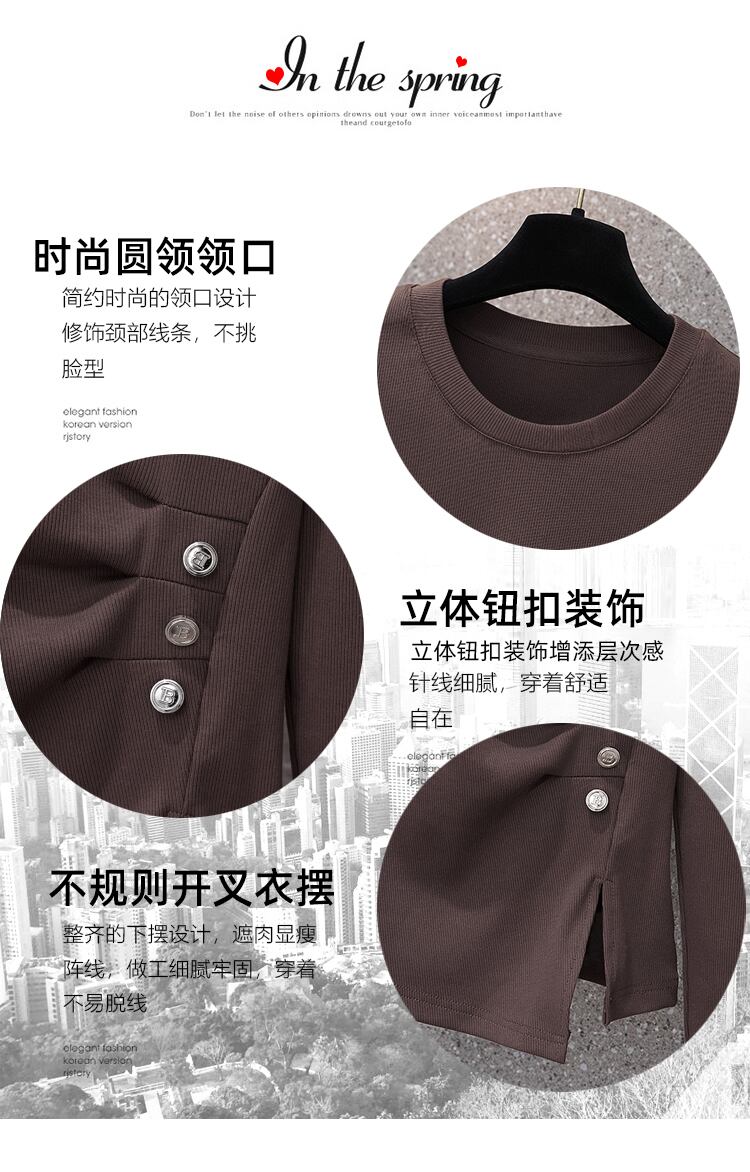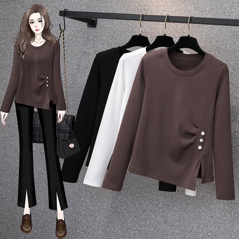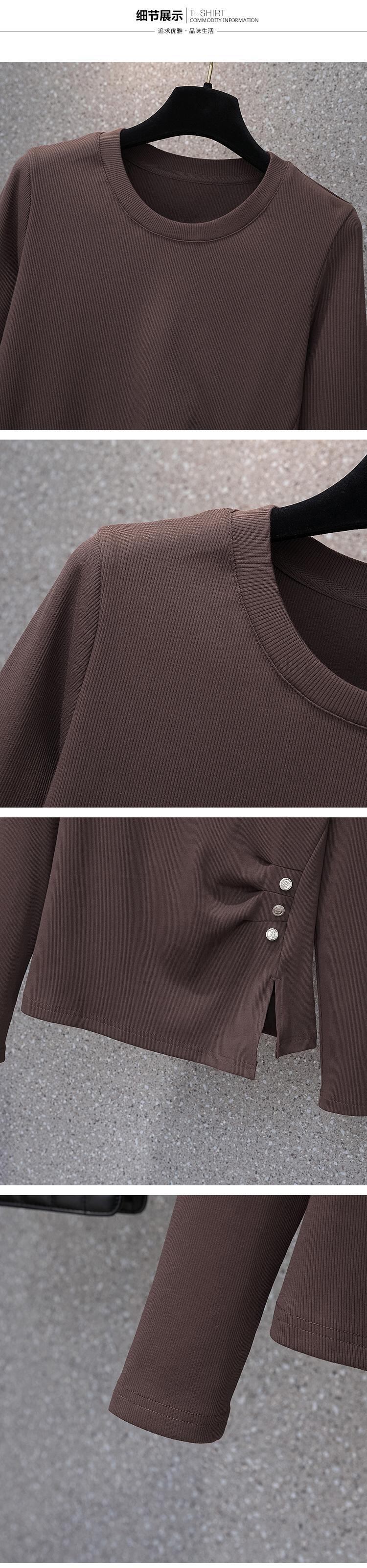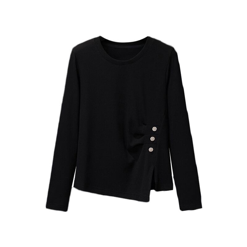 大きいサイズの婦人服 2023 春の新しいファット シスター デザイン センス ニッチ 無地 オールマッチ プリーツ ラウンド ネック ボトムス シャツ 大きめサイズ スプリング 春物 Oネック ソリッドカラー 888411938793103