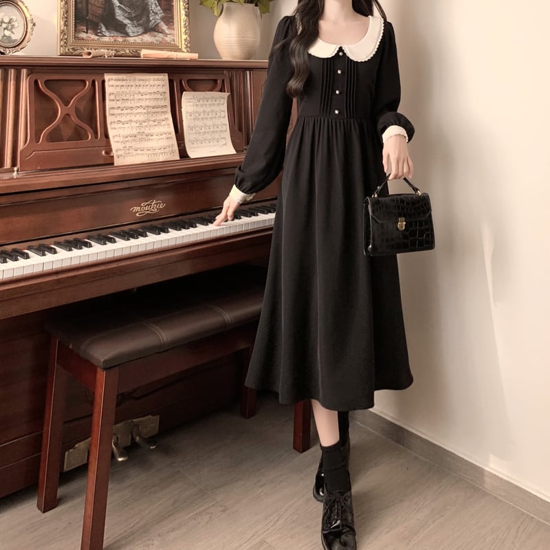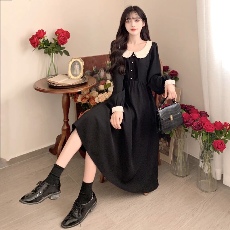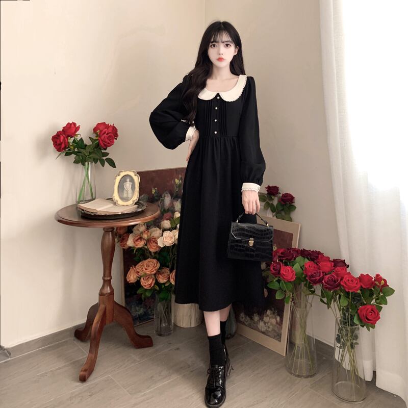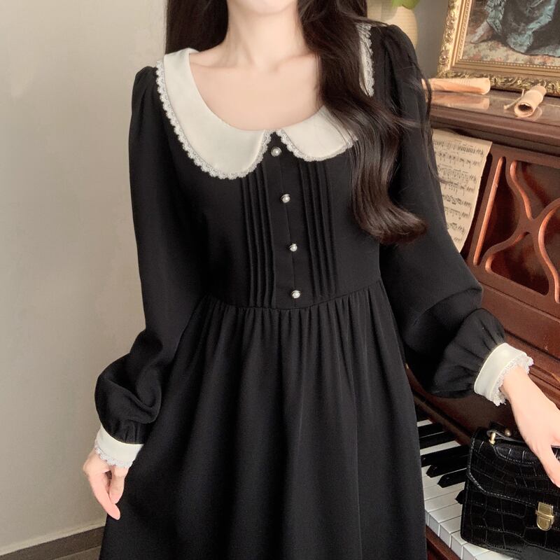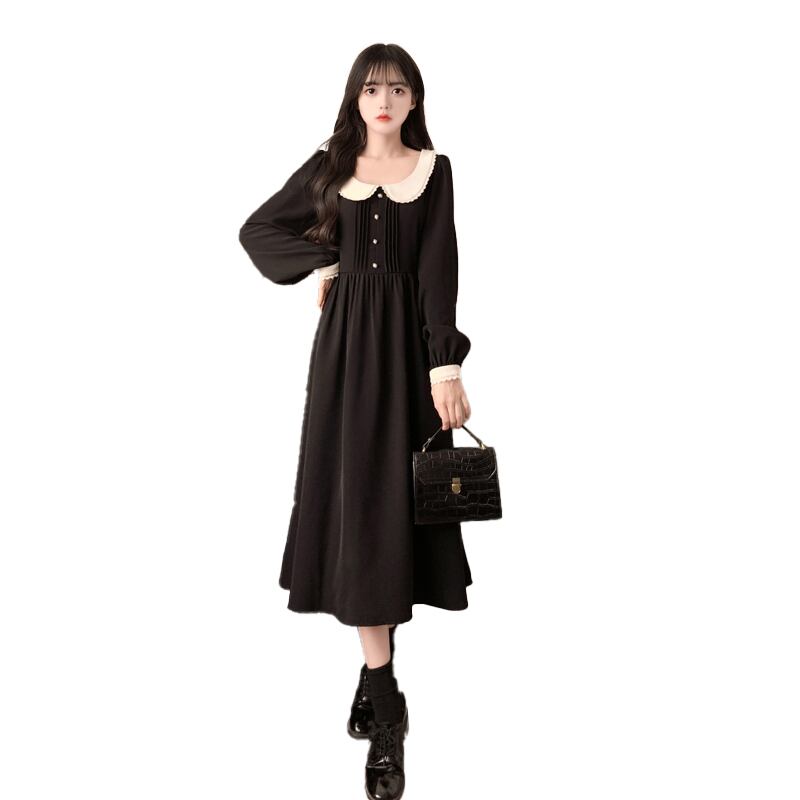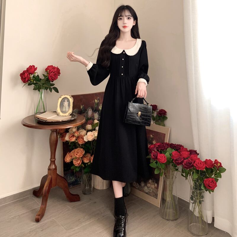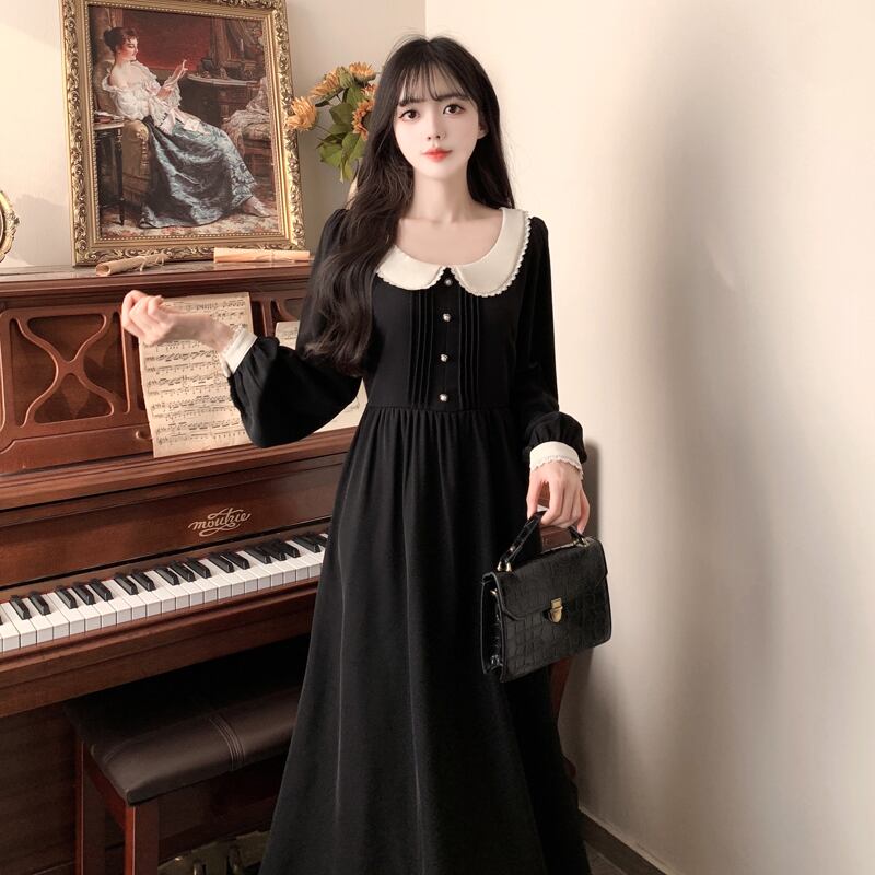 大きいサイズの婦人服 2023 春服脂肪姉妹新しいフランスの年齢を減らすロング スカート黒スリム人形の襟のドレス ブラック 大きめサイズ スプリング 春物 8884150467174081