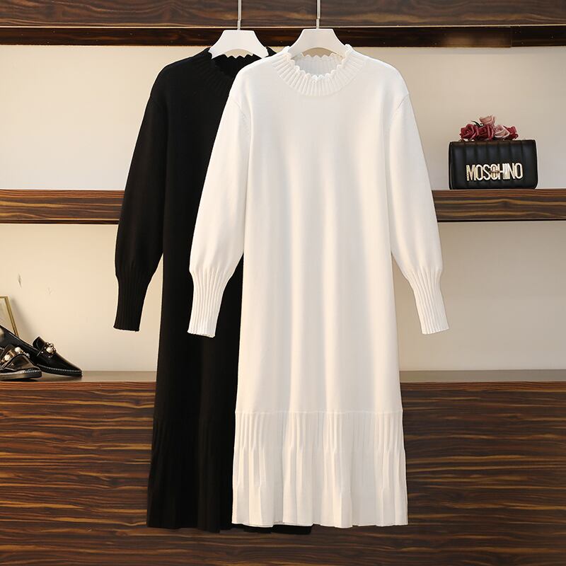プラスサイズの婦人服 2023 トレンディな女性の春の新しい太った姉妹無地の気質のハーフハイカラーの年齢を減らすゆるいニットのドレス 大きめサイズ スプリング 春物 ソリッドカラー 8884153331368405