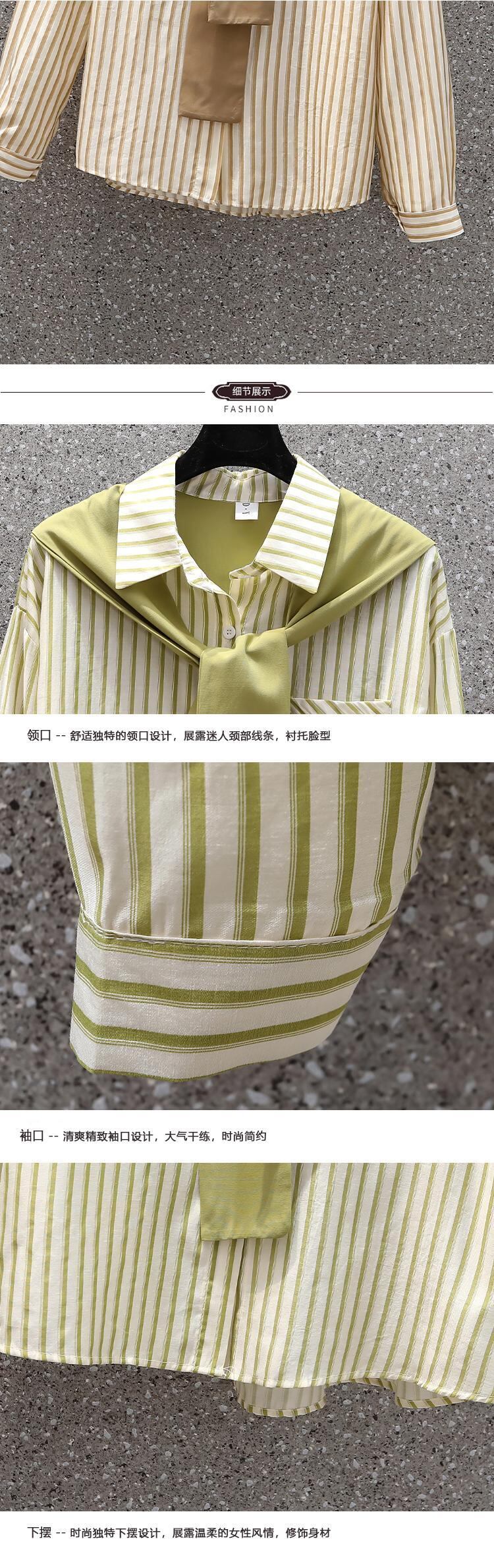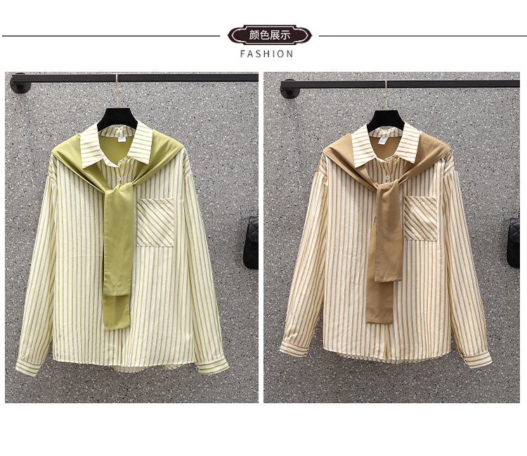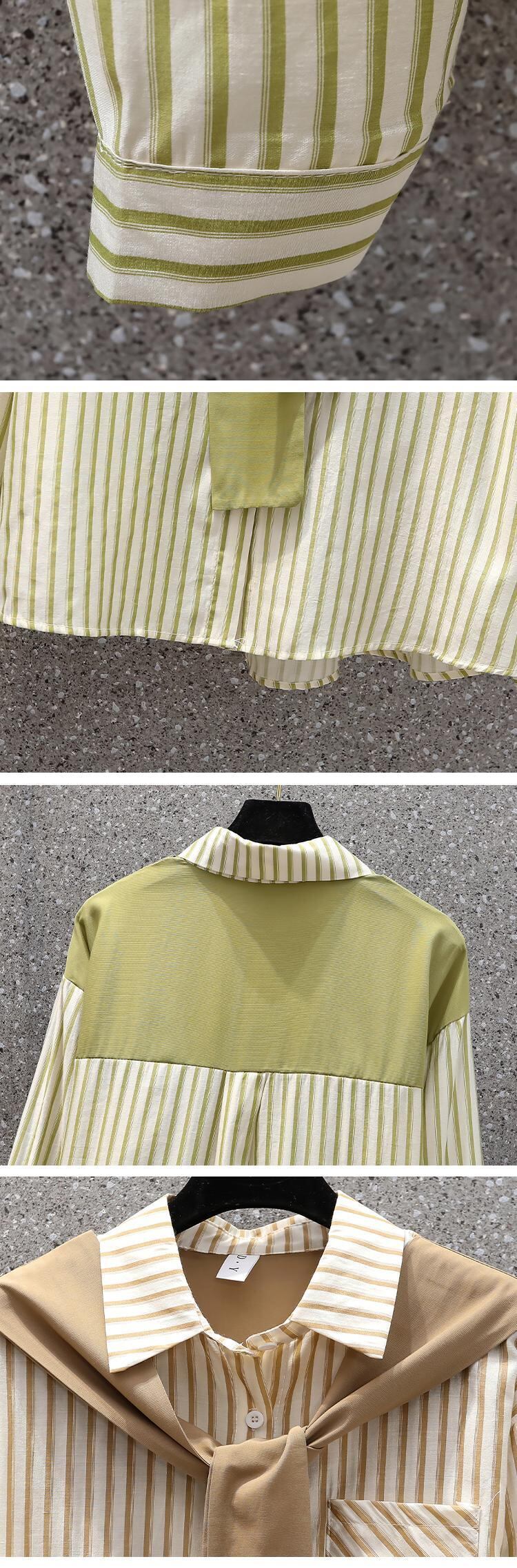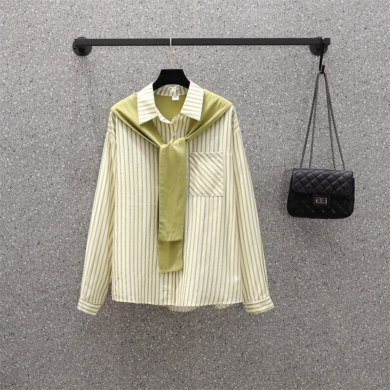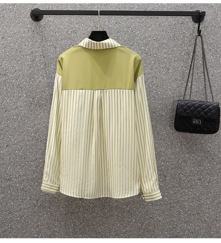 プラスサイズの婦人服 2023 春の新しいスタイルの太った姉妹オールマッチ気質スプライシングショールストライプデザイン長袖シャツ ロング 大きめサイズ スプリング 春物 8884131331605444