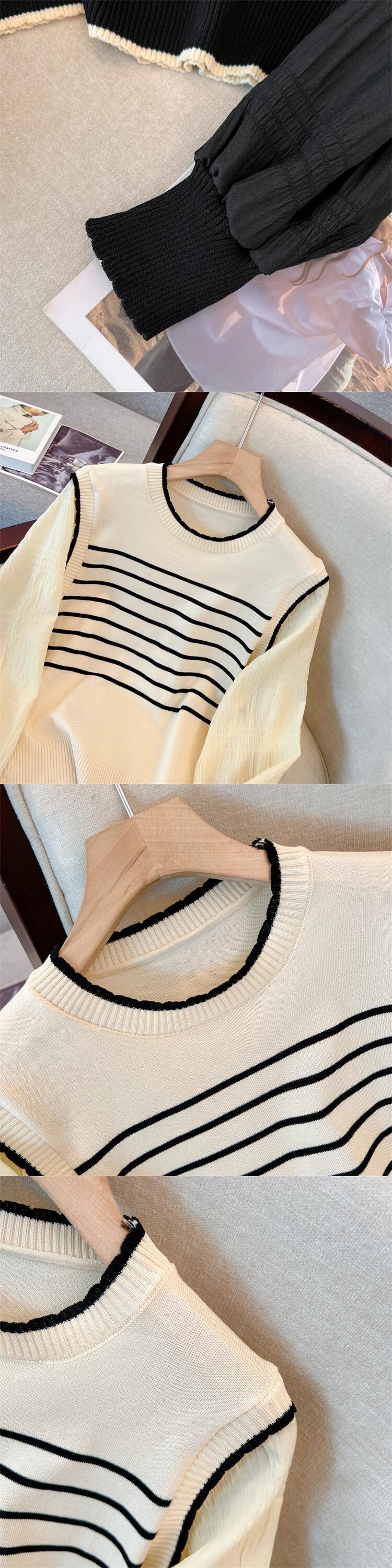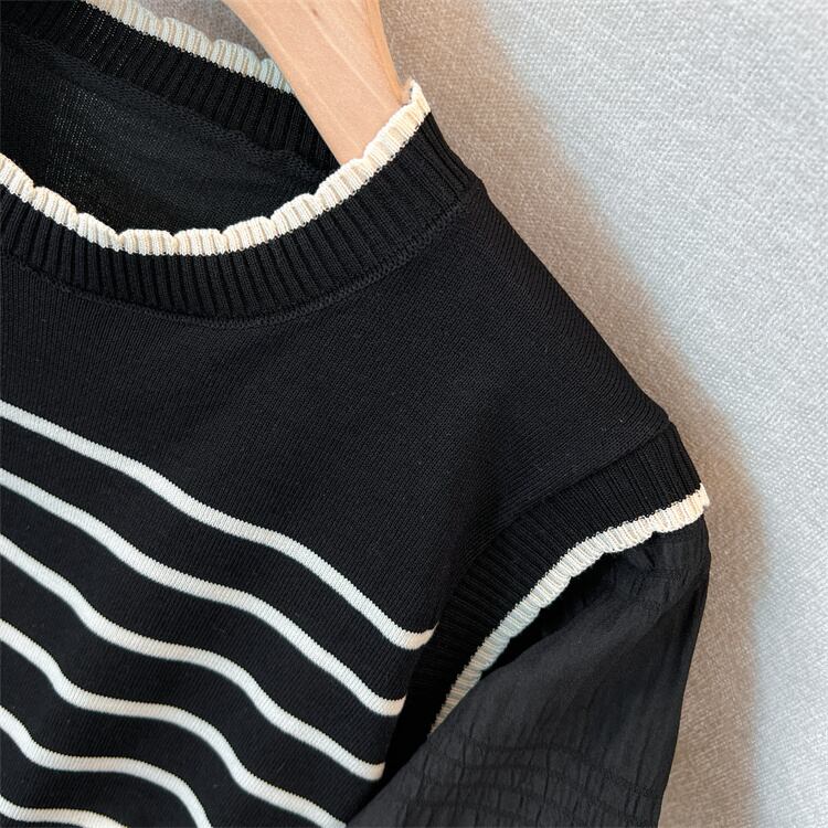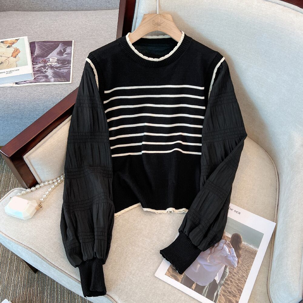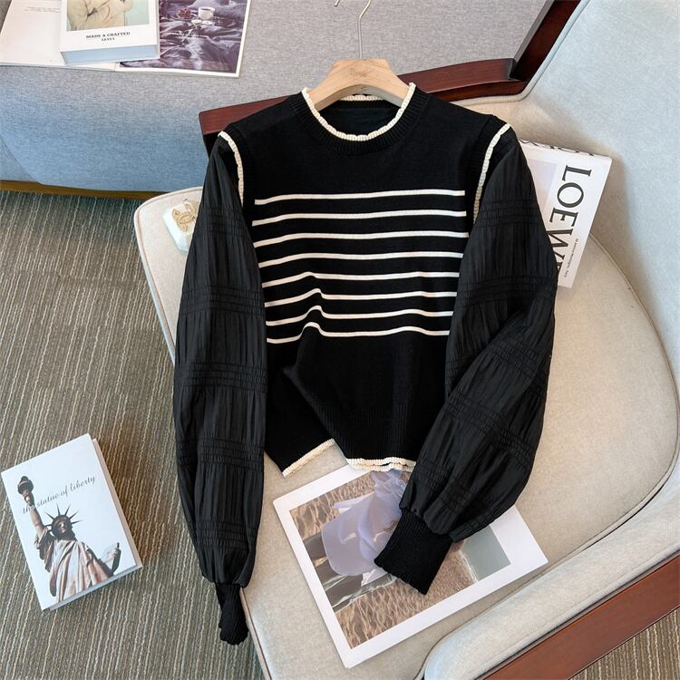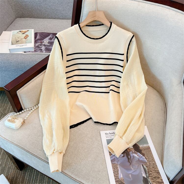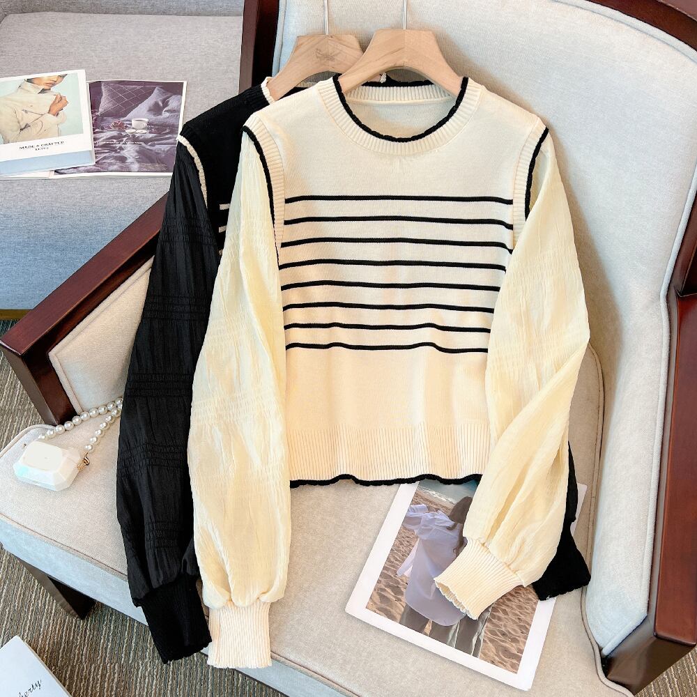 大きいサイズの婦人服 2023 春の新しいファット シスター スプライシング フェイク ツーピース長袖シックなストライプの薄いセーター ロング 大きめサイズ スプリング 春物 8884164585643443