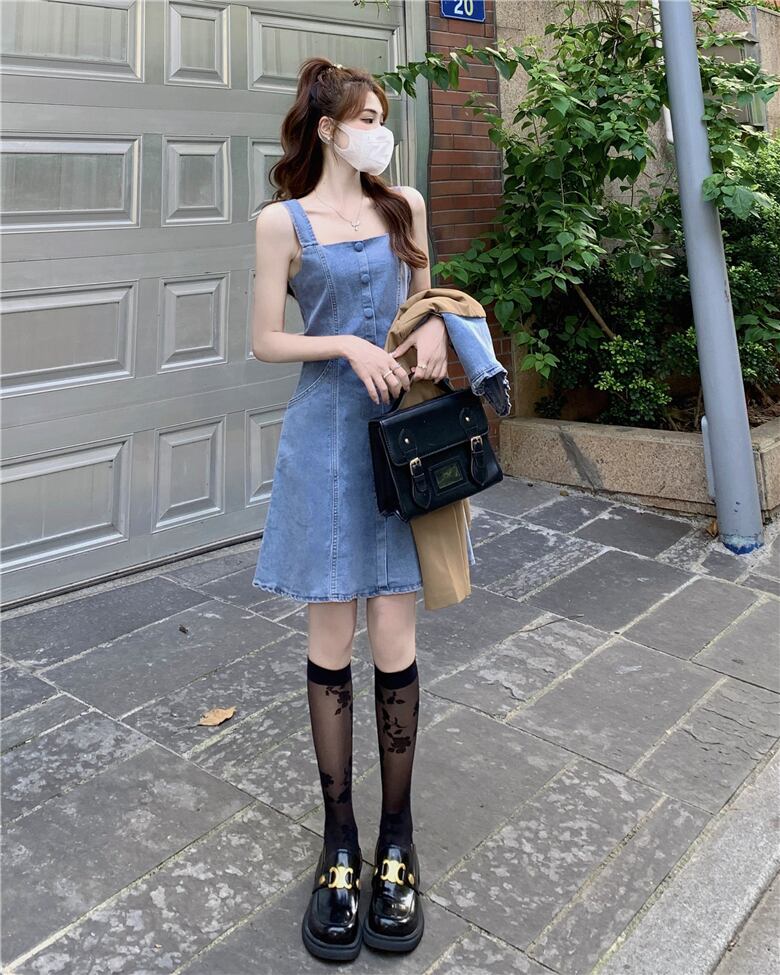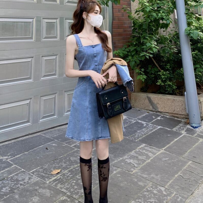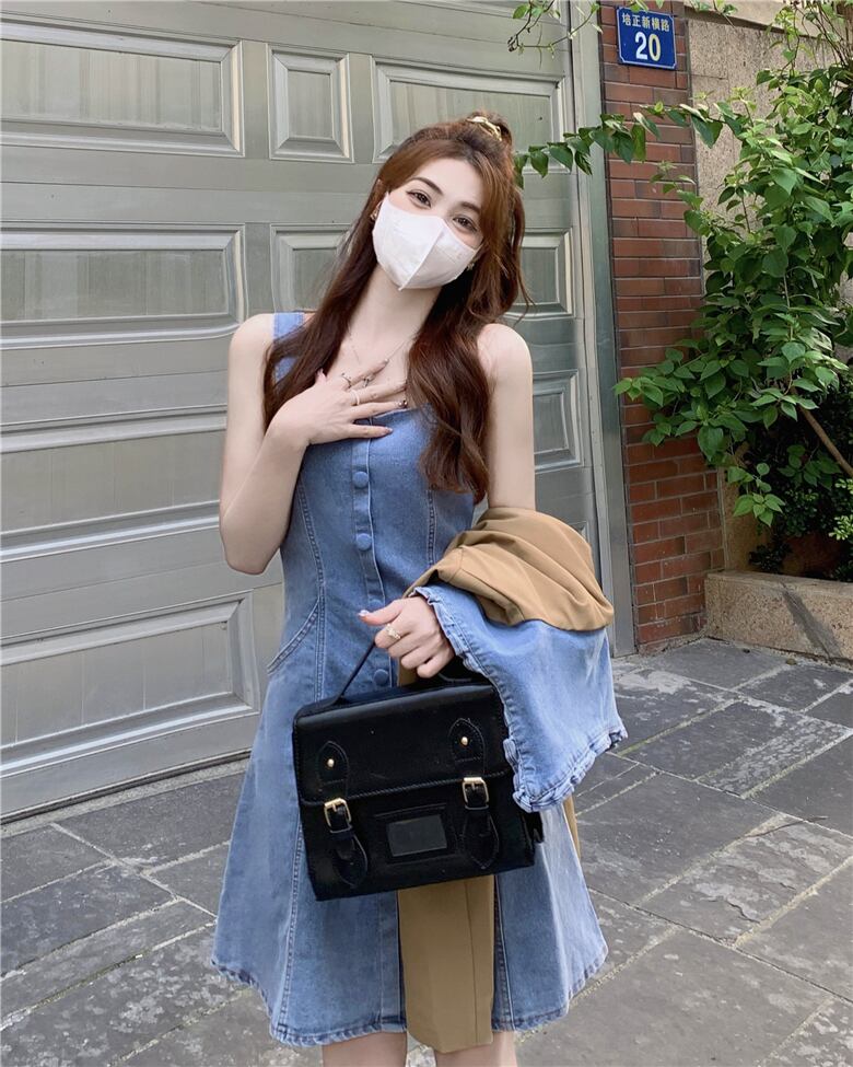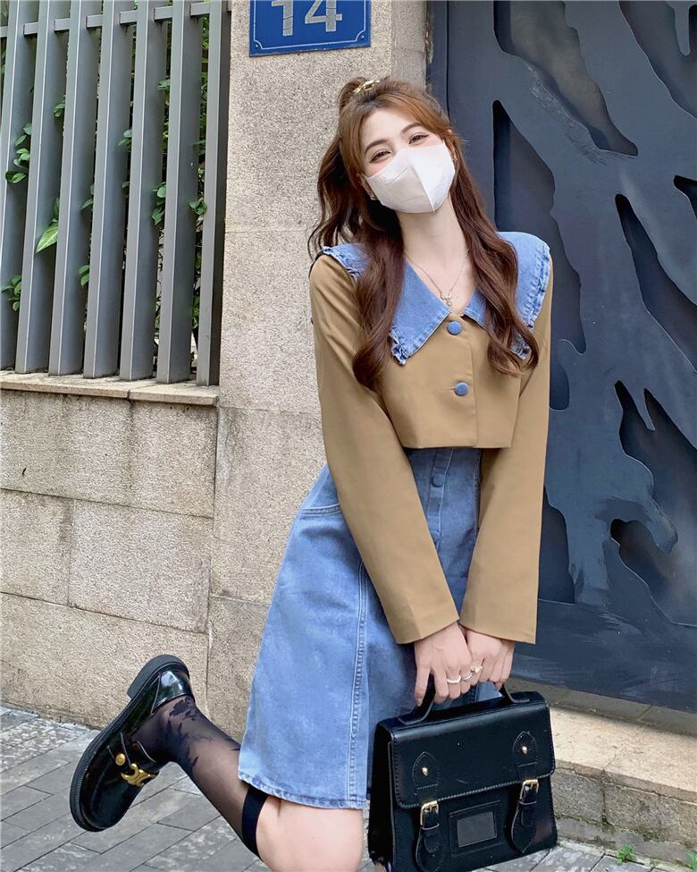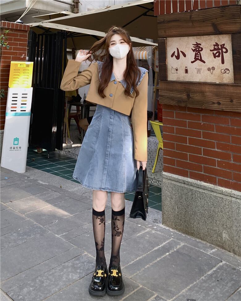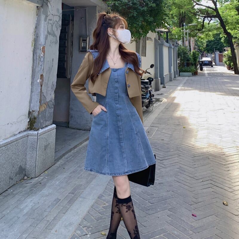 プラスサイズの婦人服 2023 春の新しい脂肪姉妹レトロなスプライシング ジャケット デニム サスペンダー ドレス 2 点セット 大きめサイズ スプリング 春物 8884115536422333