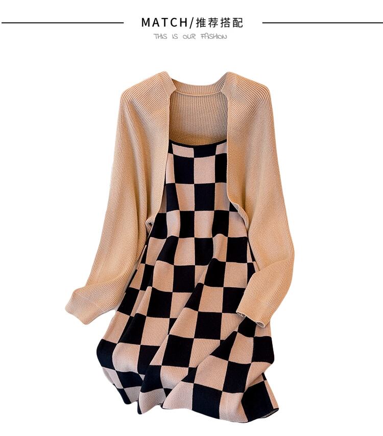 大きいサイズの婦人服 2023 春服ファット シスターズ新しいチェック柄ニット サスペンダー スカート ニット カーディガン ジャケット 2 枚 大きめサイズ スプリング 春物 8884123815173684