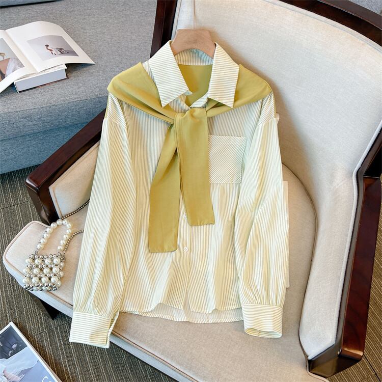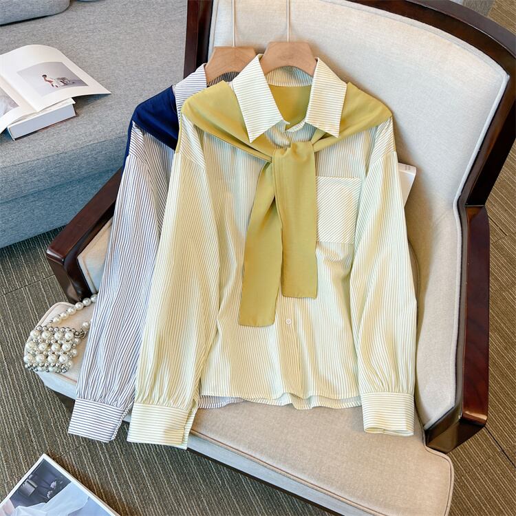 プラスサイズの婦人服 2023 春の新しいファットシスターシックなデザインのストライプショールフェイクツーピースファッションシャツ 大きめサイズ スプリング 春物 8884114818077925