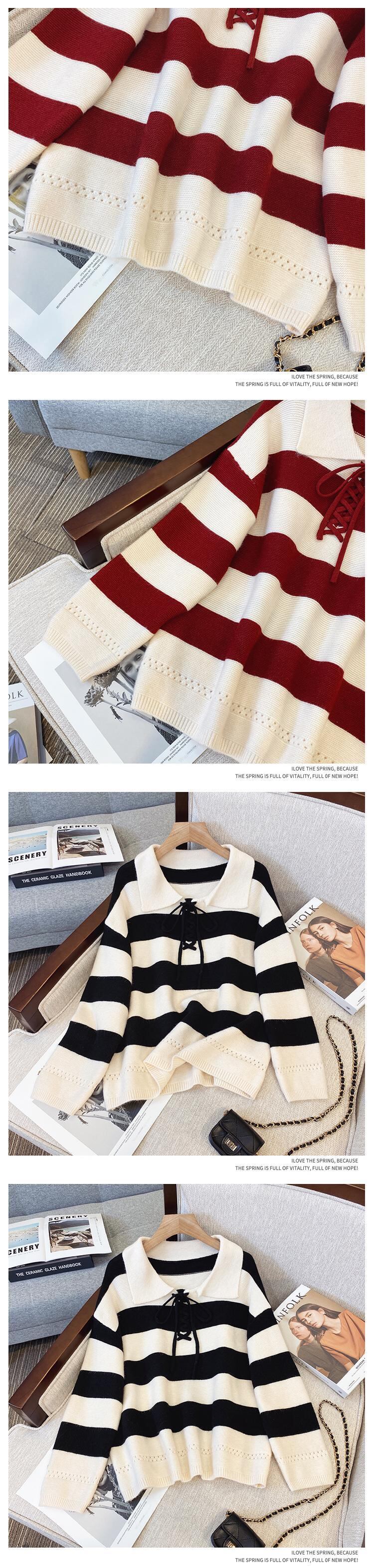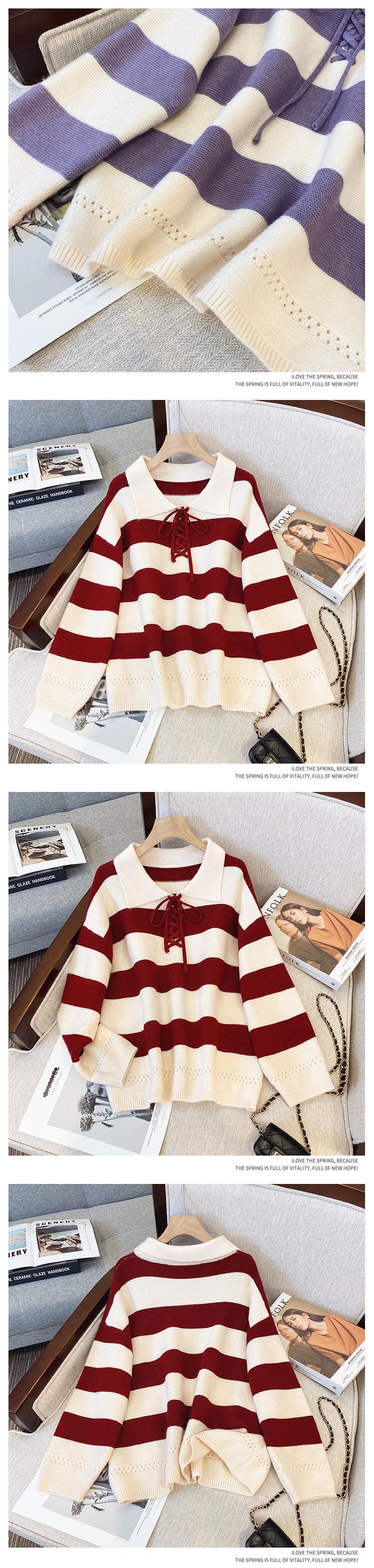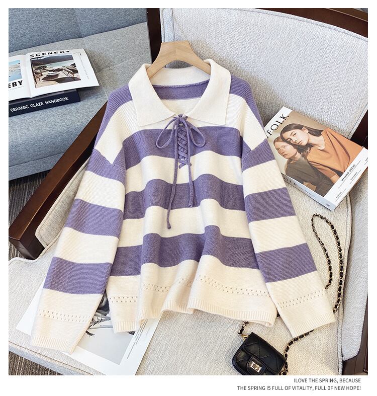 プラスサイズの婦人服 2023 春の新スタイル脂肪姉妹縛ら襟ストライプカラーマッチングデザインカジュアルニットセーター女性 大きめサイズ スプリング 春物 8884131771681578