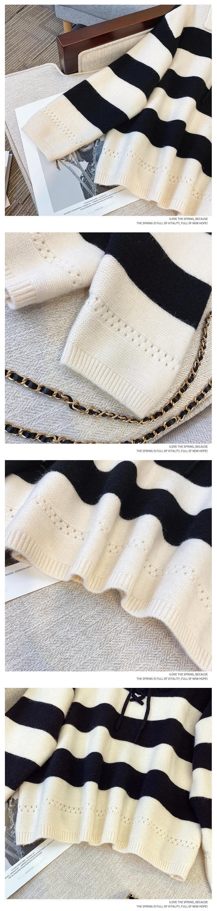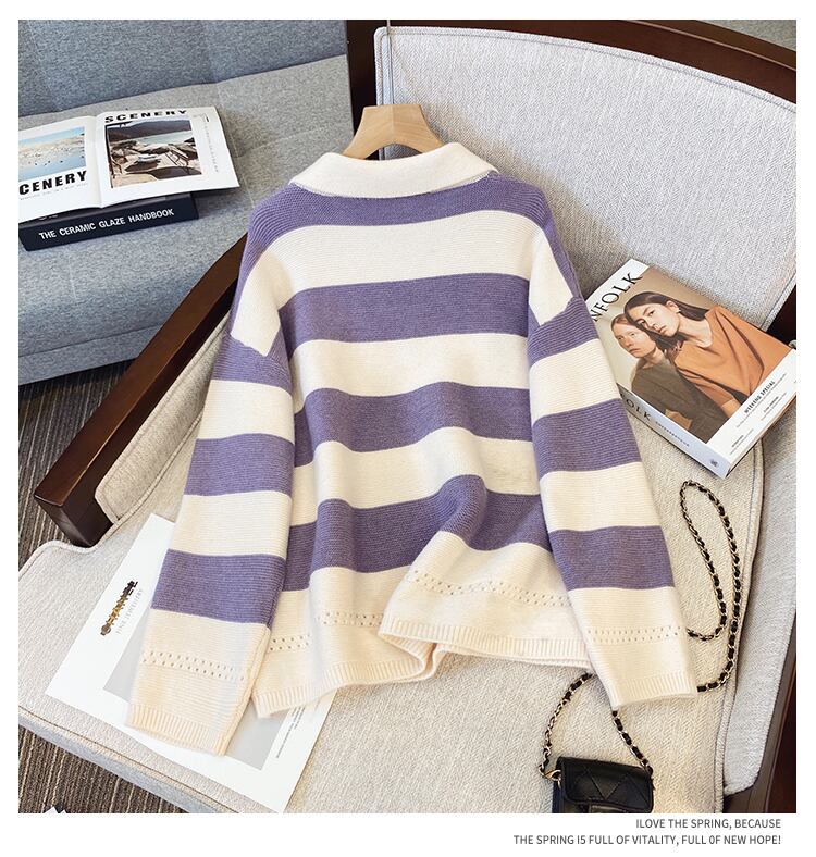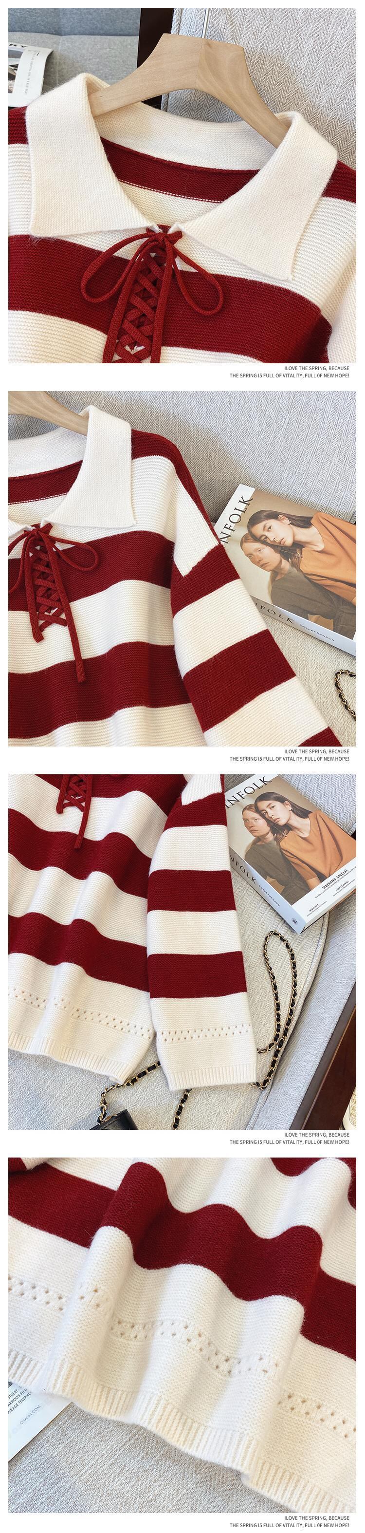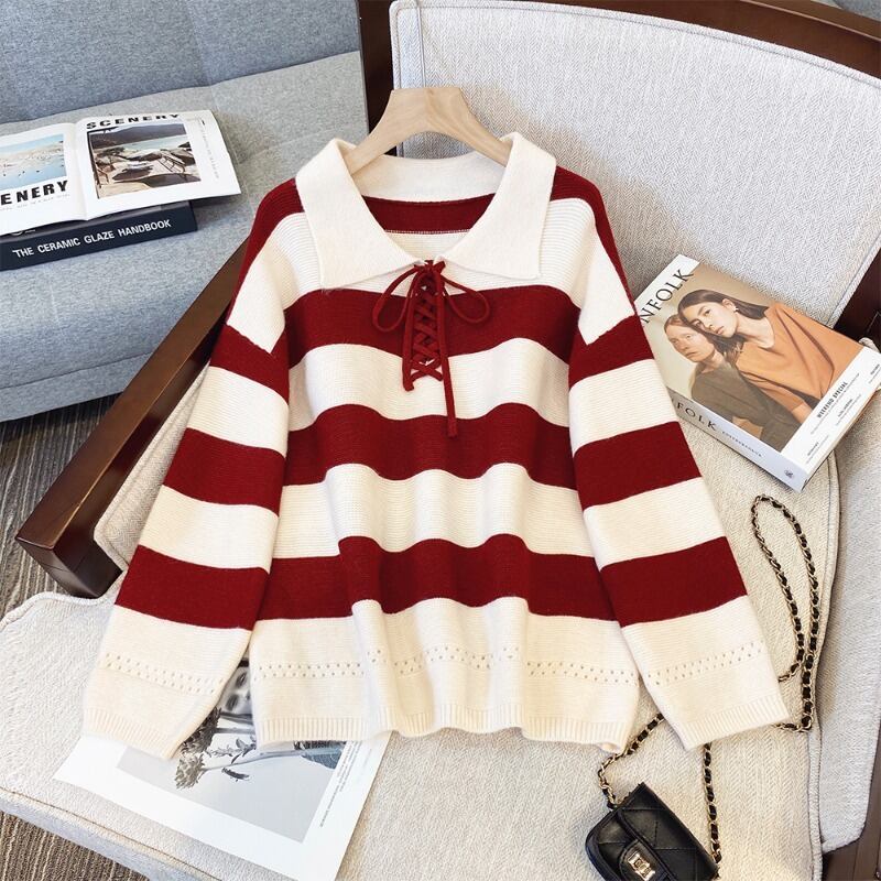 プラスサイズの婦人服 2023 春の新スタイル脂肪姉妹縛ら襟ストライプカラーマッチングデザインカジュアルニットセーター女性 大きめサイズ スプリング 春物 8884131771681578