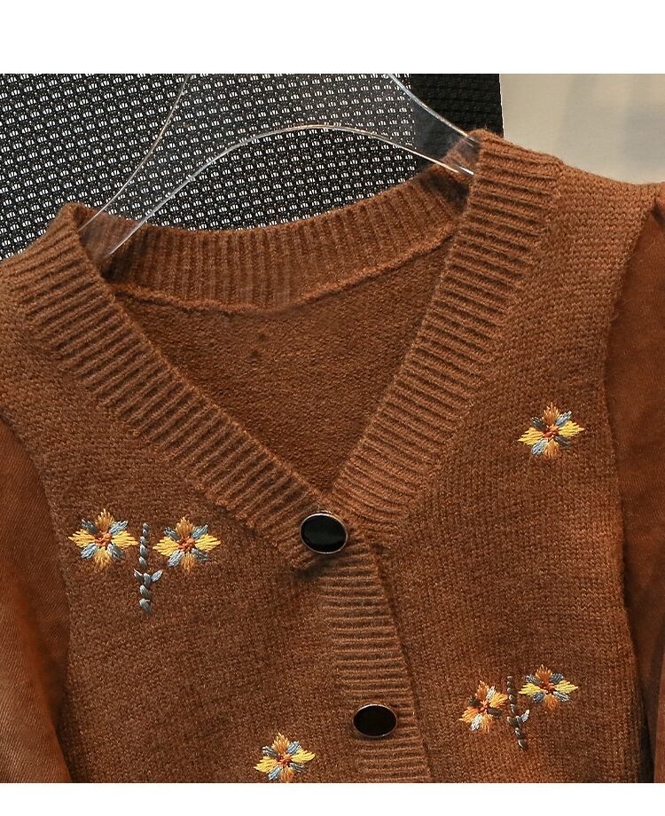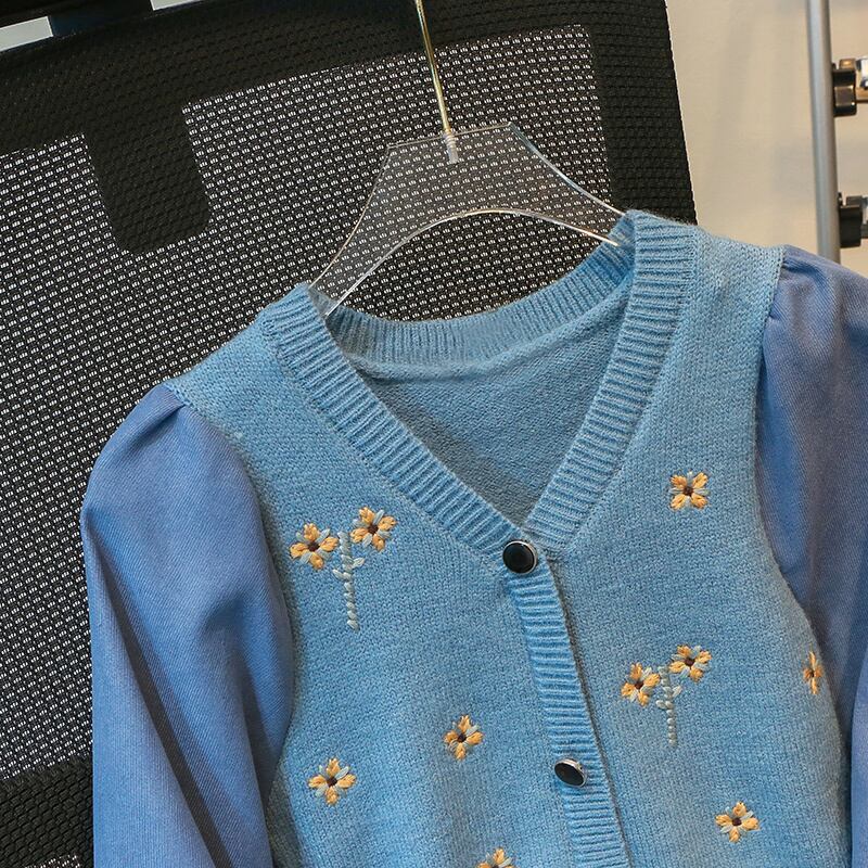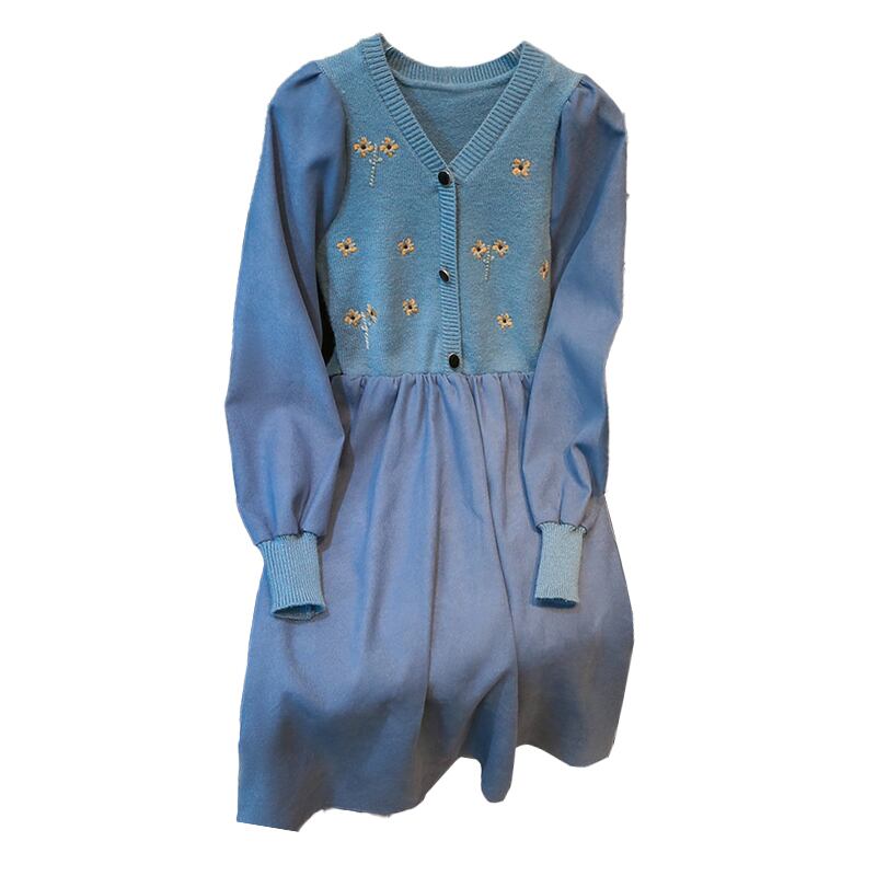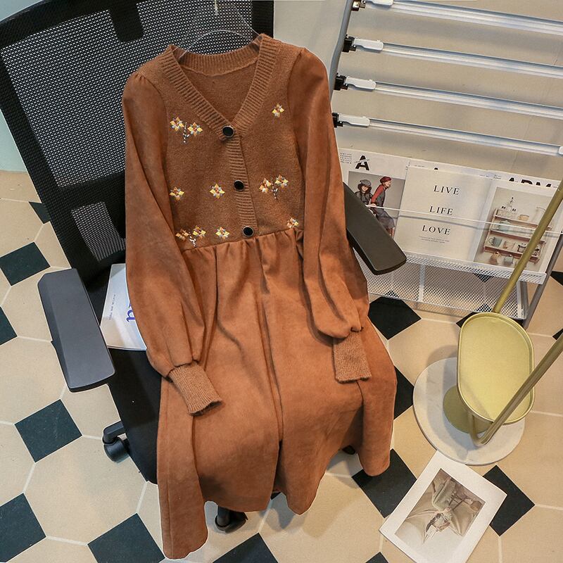 プラスサイズの婦人服 2023 ファットシスター春の新しいウエストラインスリム気質 V ネック花柄ニットステッチドレス 大きめサイズ スプリング 春物 Vネック 8884189291284543