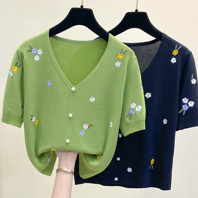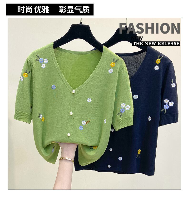 大きいサイズの婦人服 2023 夏の新しい太った姉妹の気質の花柄のデザインのセンス V ネック カジュアルなシックな腹カバー T シャツ 大きめサイズ サマー 夏物 Vネック Tシャツ 8884132522514347