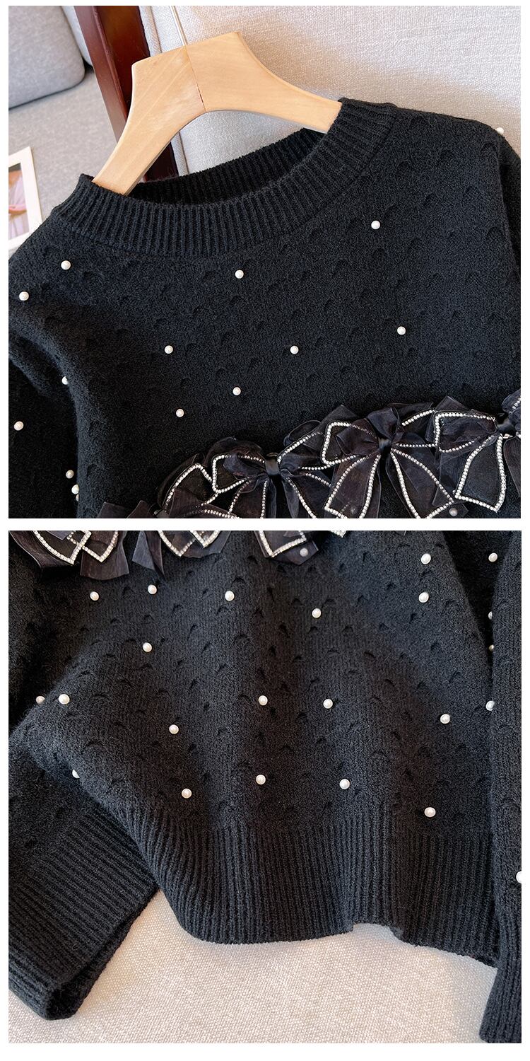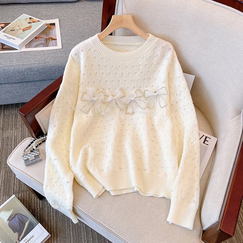 プラスサイズの婦人服 2023 ファットシスター春の新気質ファッションラウンドネック弓セーター eign スタイルニットトップ リボン 大きめサイズ スプリング 春物 Oネック 8884110766387379