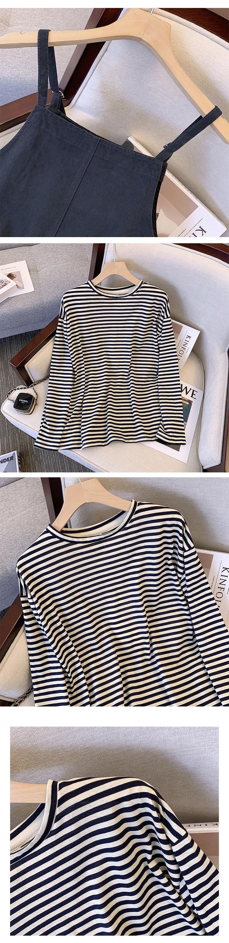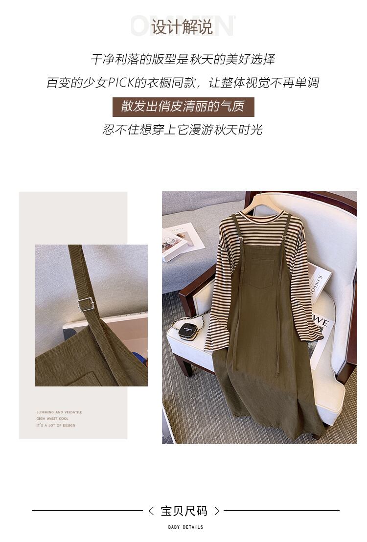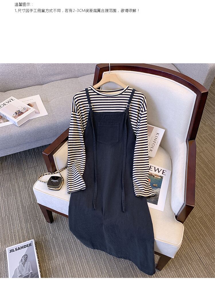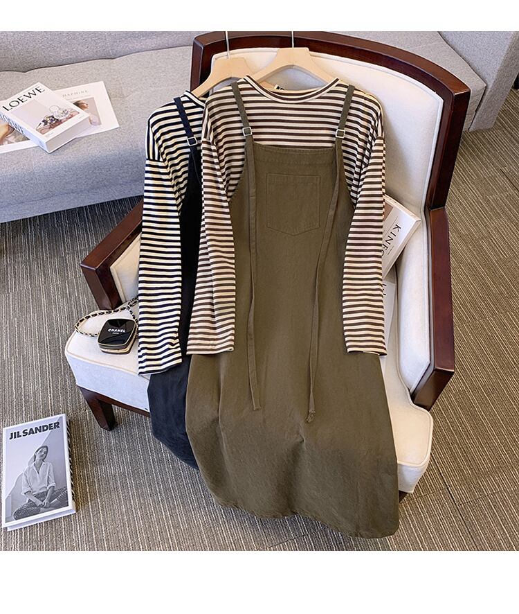 大きいサイズの婦人服 2023 春服 太った姉妹 新しいファッション ゆったり ストライプ 長袖 Tシャツ サスペンダー スカート 2点セット ロング 大きめサイズ スプリング 春物 8884141096671639