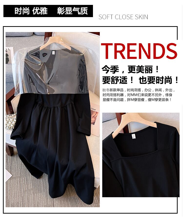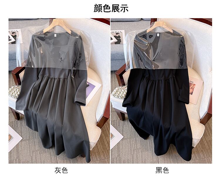 大きいサイズの婦人服 2023 春の新しいファットシスターデザインセンススプライシング受信ウエスト無地腹カバー年齢を減らすドレス 大きめサイズ スプリング 春物 ソリッドカラー 8884185790724705