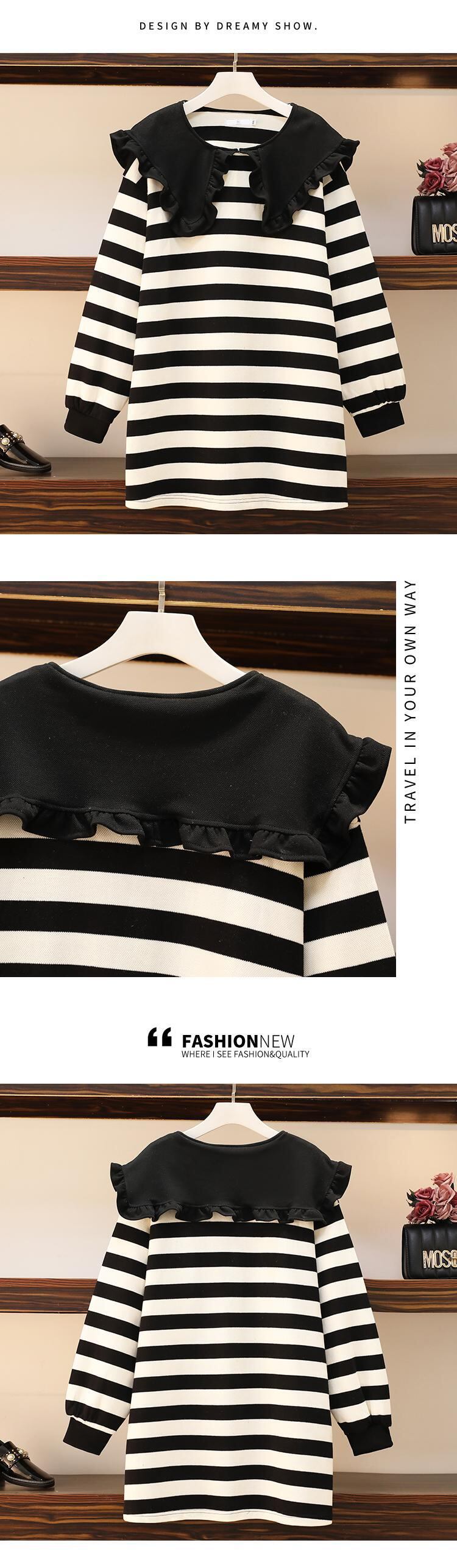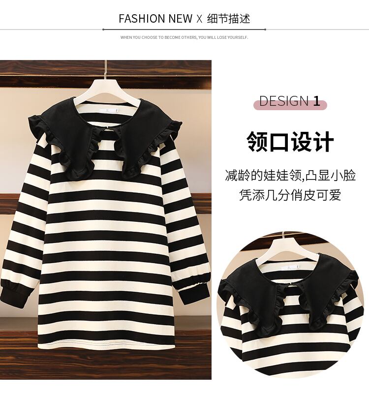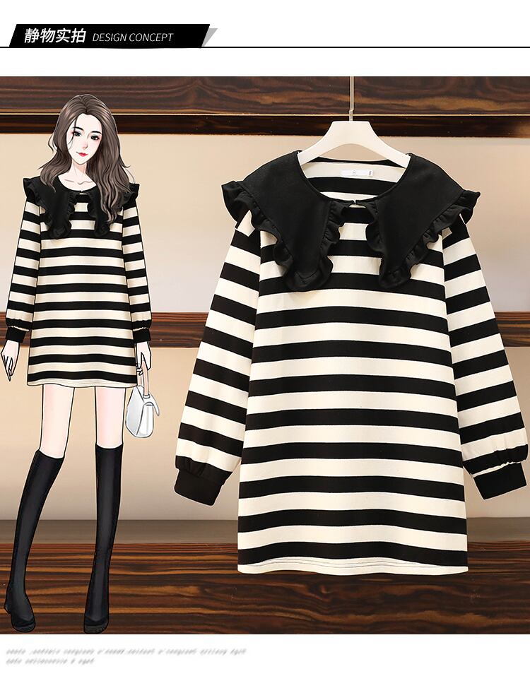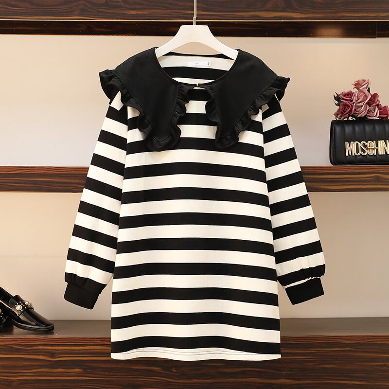 プラスサイズの婦人服 2023 ファットシスター春の新ストライプ人形の襟のセーターミドル丈ルーズ長袖トップ女性 ロング 大きめサイズ スプリング 春物 8884176898093558