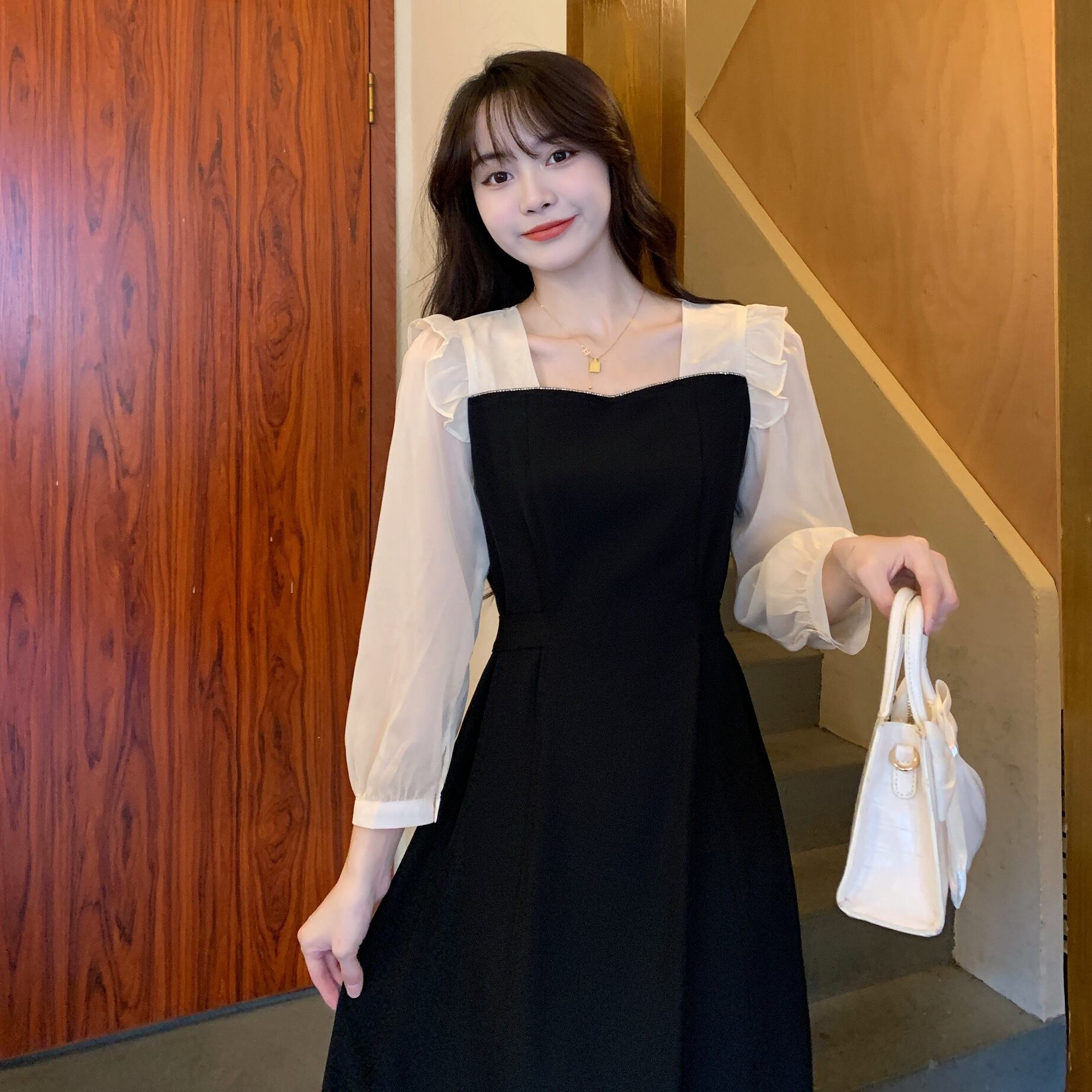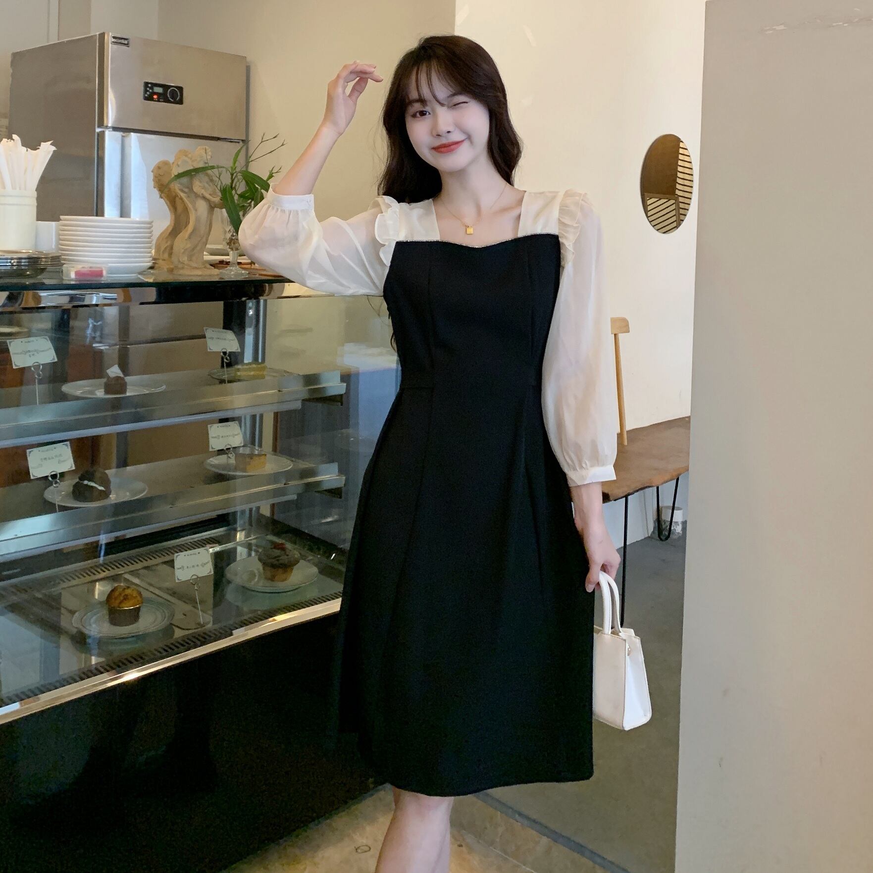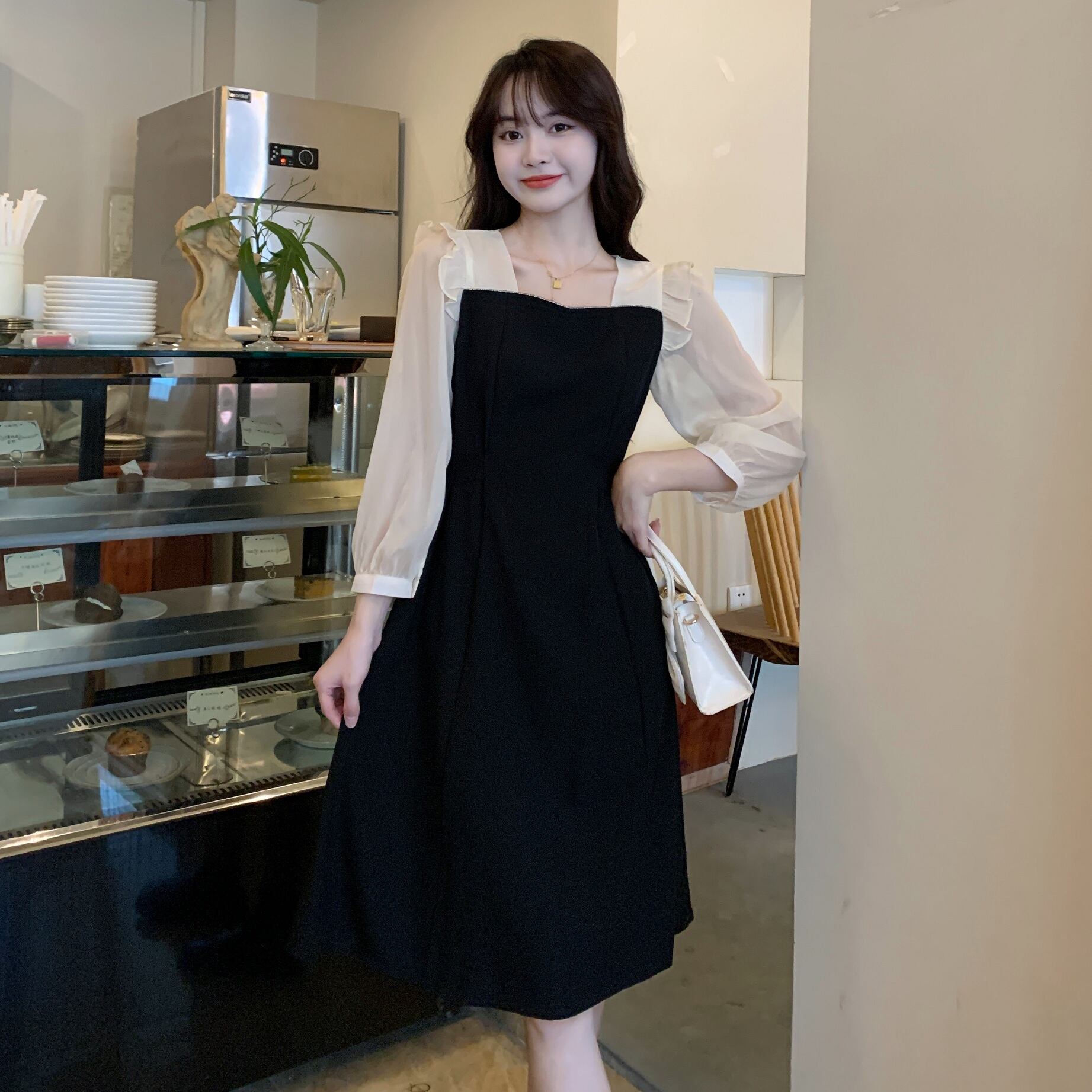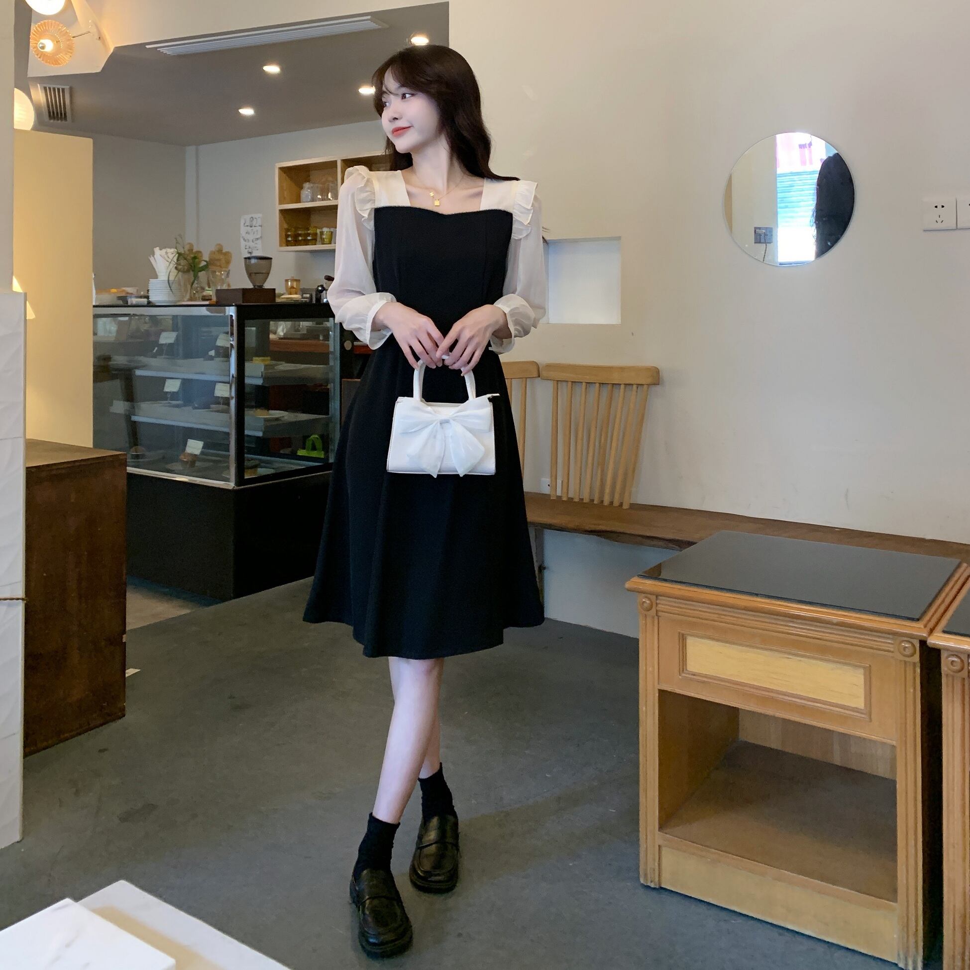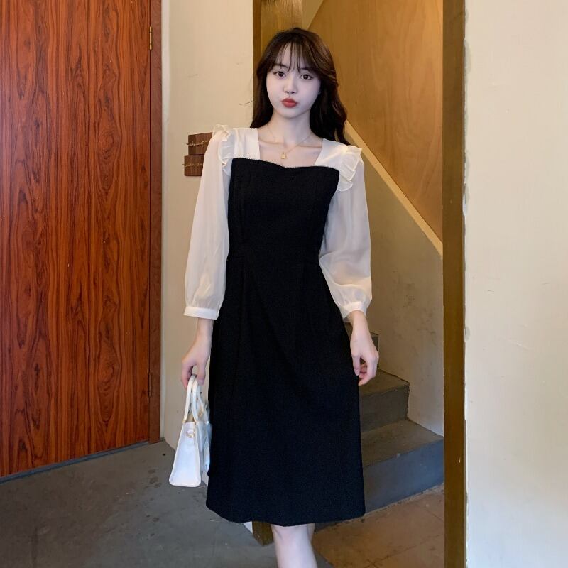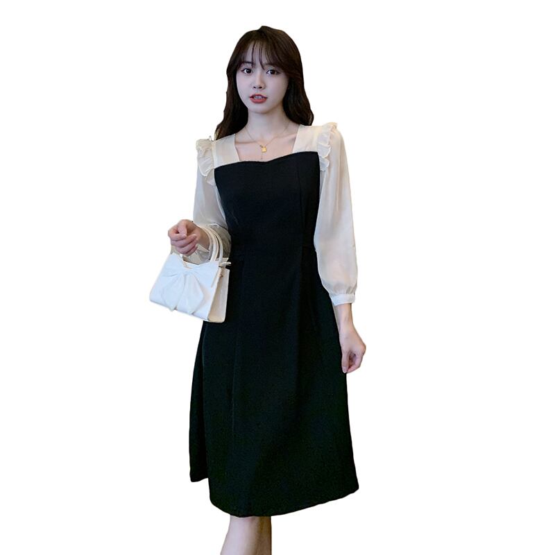 プラスサイズの婦人服 2023 春の新しい太った姉妹スタイルの気質ウエスト ステッチ フェイク ツーピース長袖ドレス ロング 大きめサイズ スプリング 春物 8884152721039743