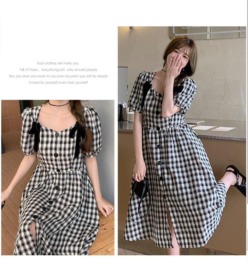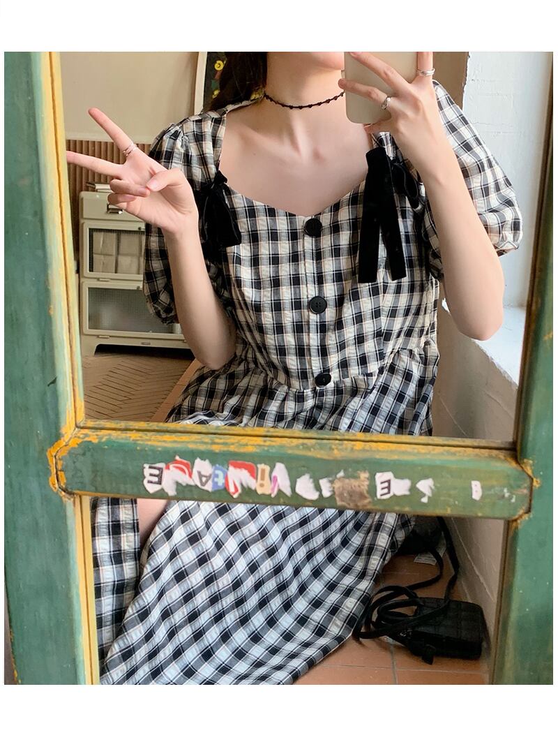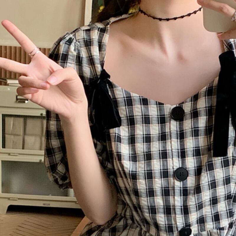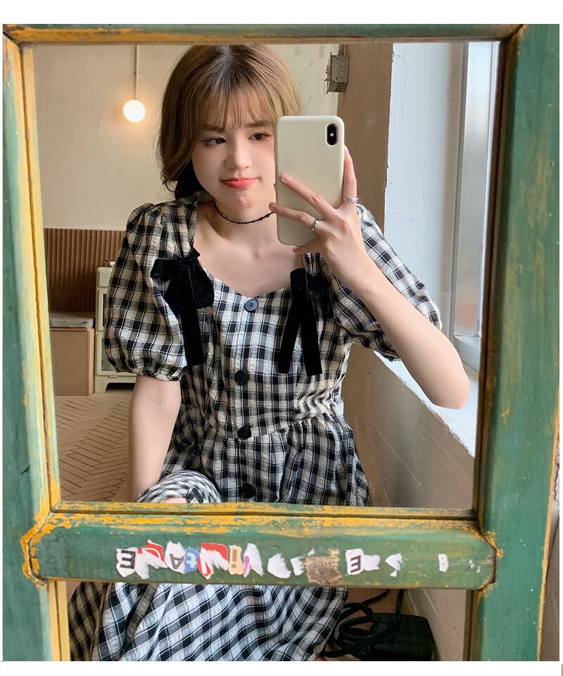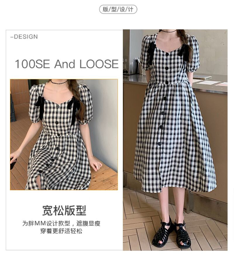 プラスサイズの婦人服 2023 夏の新しいファットシスターファッション格子縞のちょう結びの年齢を減らすスリムなスクエアネックのドレス リボン 大きめサイズ サマー 夏物 スクウェア 8884191209709260