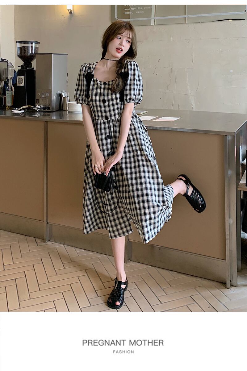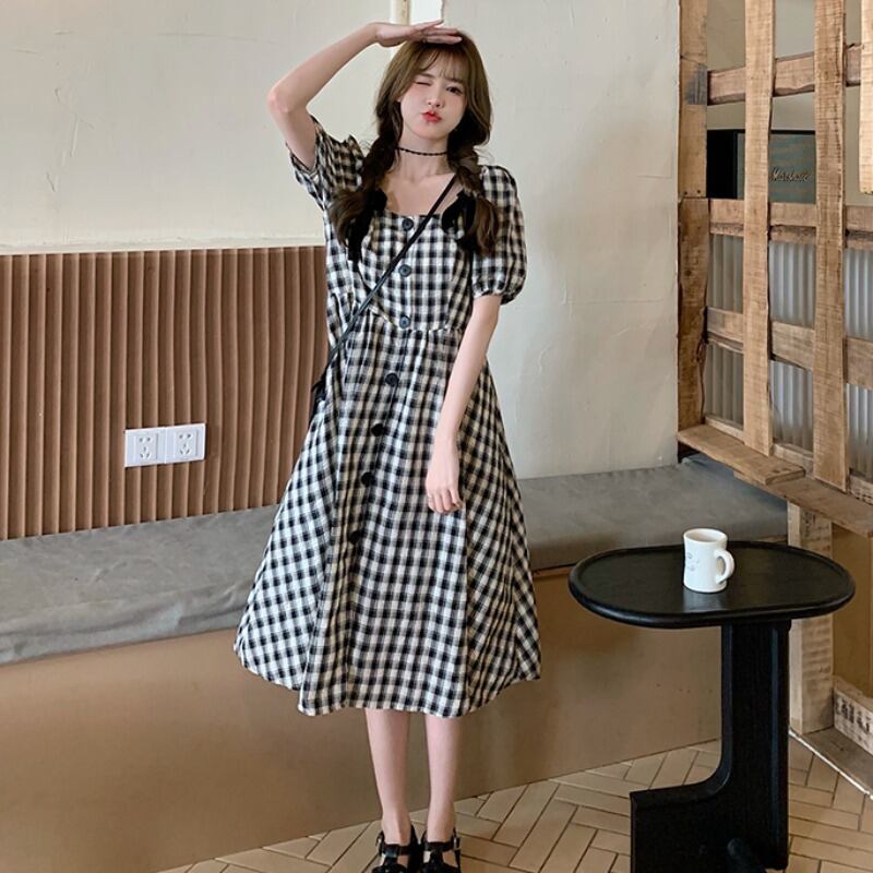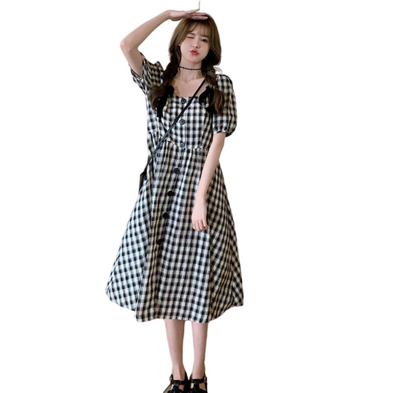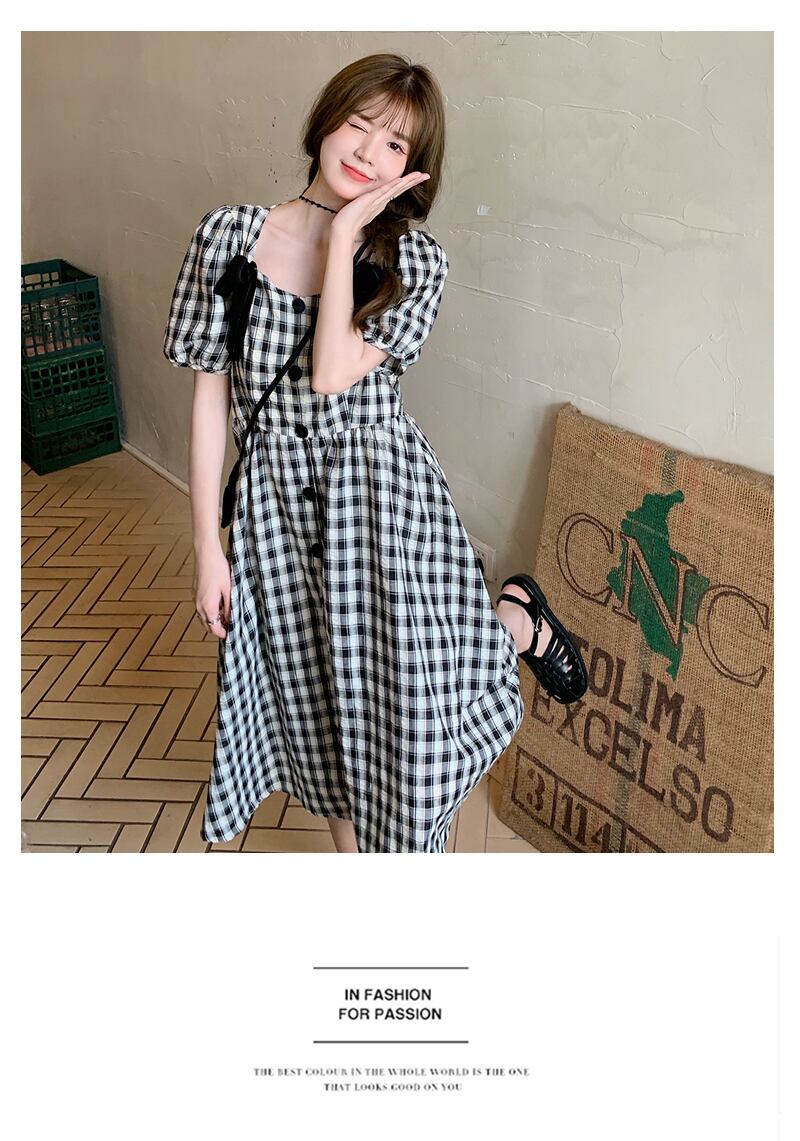 プラスサイズの婦人服 2023 夏の新しいファットシスターファッション格子縞のちょう結びの年齢を減らすスリムなスクエアネックのドレス リボン 大きめサイズ サマー 夏物 スクウェア 8884191209709260