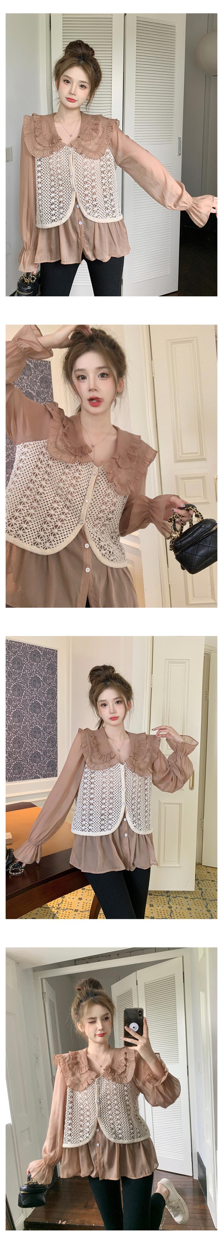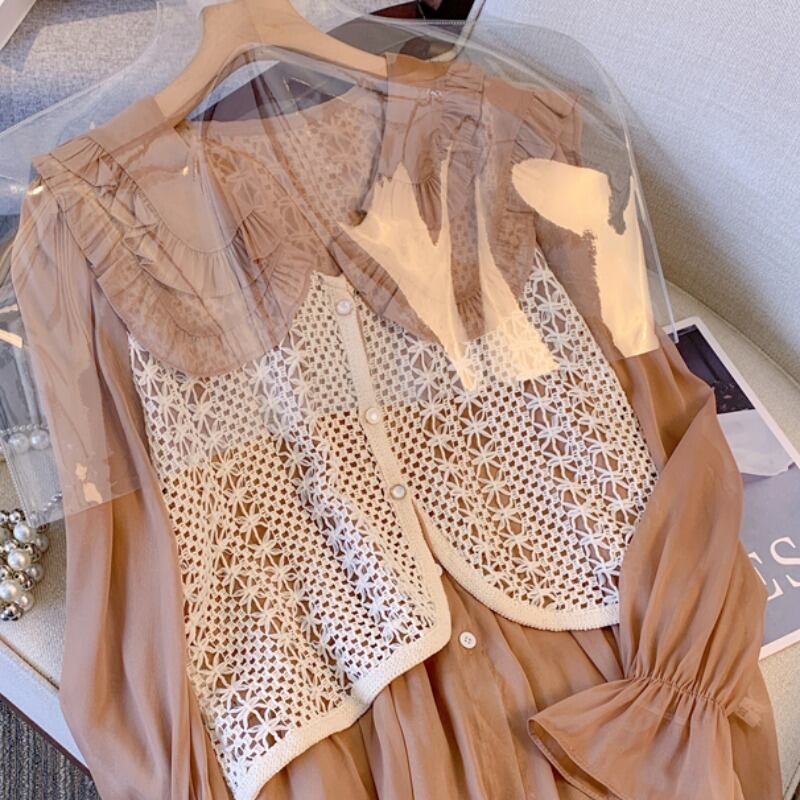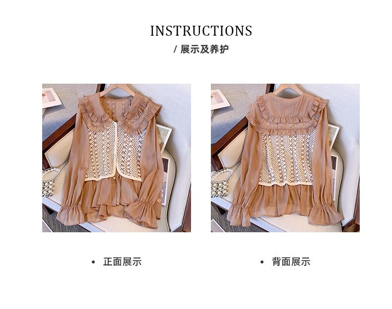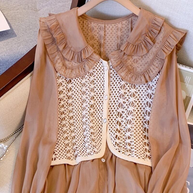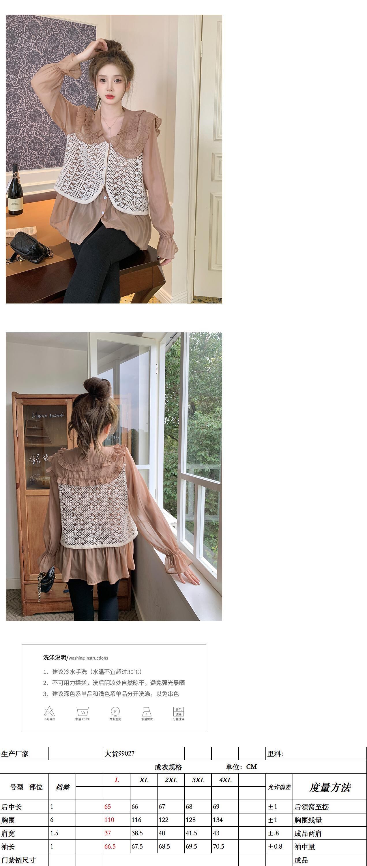 大きいサイズの婦人服 2023 春の新作服 ファットシスターズ 新作 フェイク二枚甘い 引き締め人形の襟 長袖 シフォンシャツ ロング 大きめサイズ 大人ガーリー スウィート キュート カジュアル スプリング 春物 8884129284472290