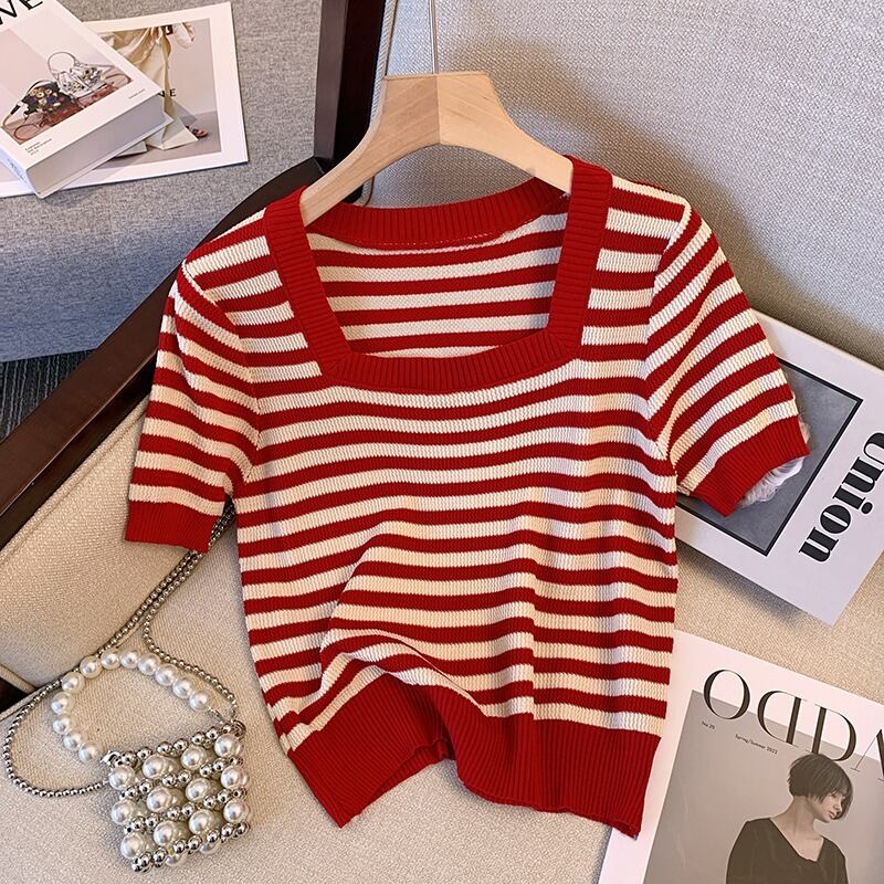 プラスサイズの婦人服2023トレンディな女性の夏の新しいファットシスターファッションスクエアカラーショートストライプオールマッチ半袖トップTシャツ 大きめサイズ サマー 夏物 スクウェア 8884163710176312