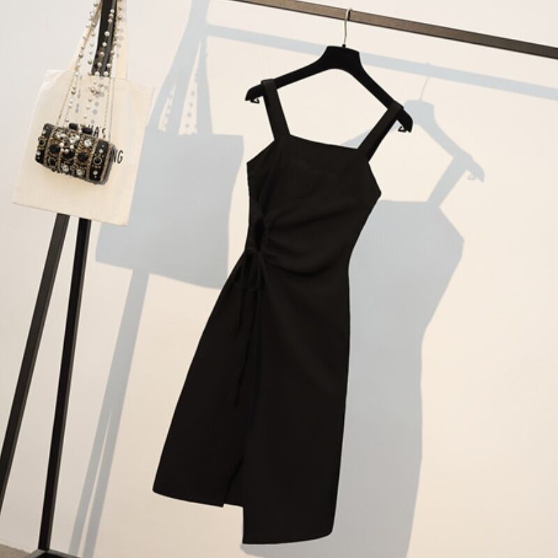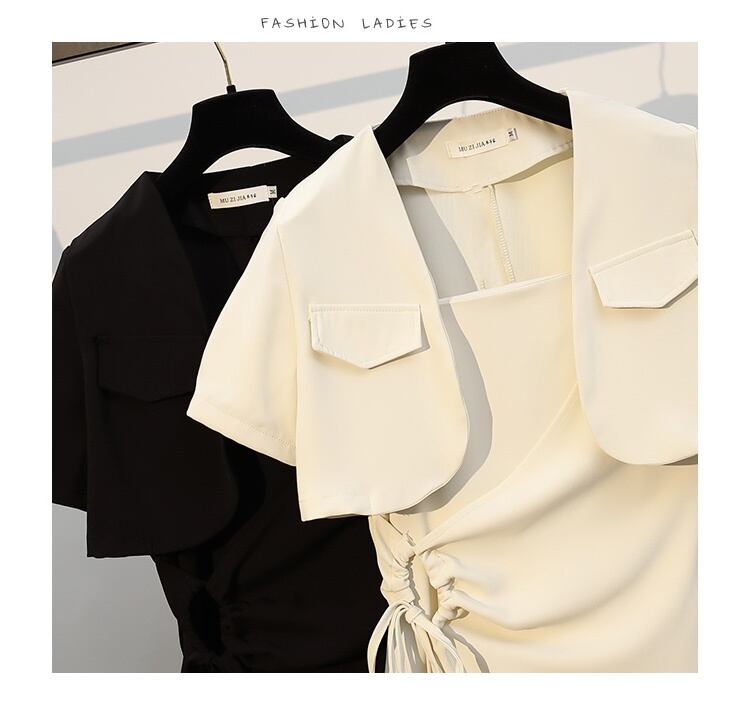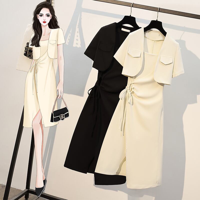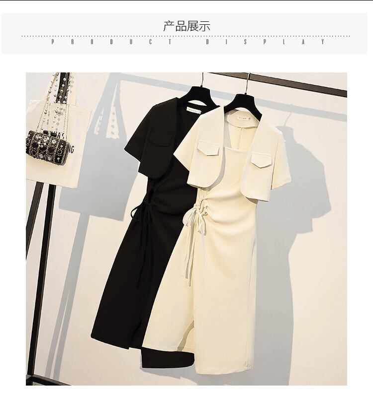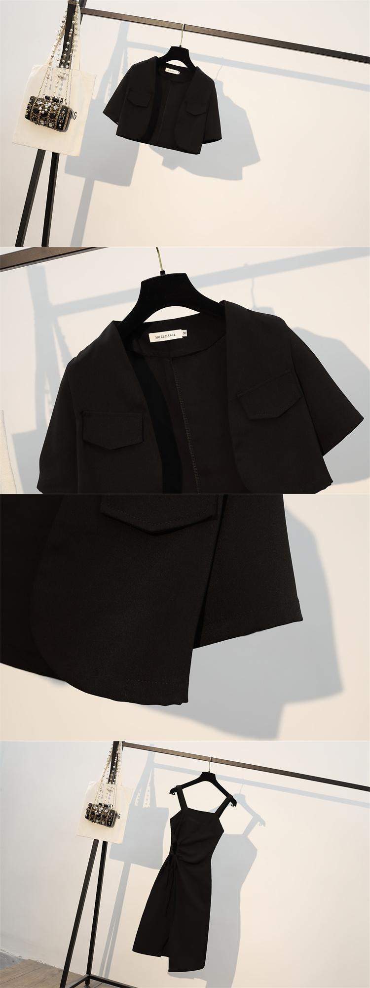 大きいサイズの婦人服 2023 夏の新しい太った姉妹の年齢を減らすショート コート巾着サスペンダー ドレス 2 点セット 大きめサイズ サマー 夏物 8884185991116007