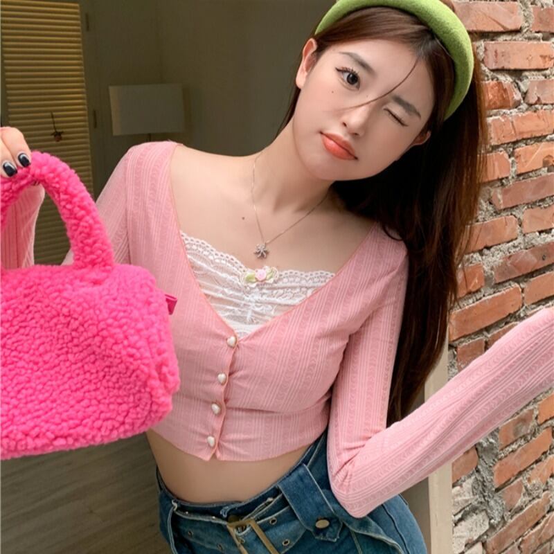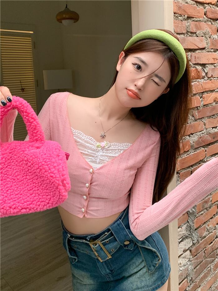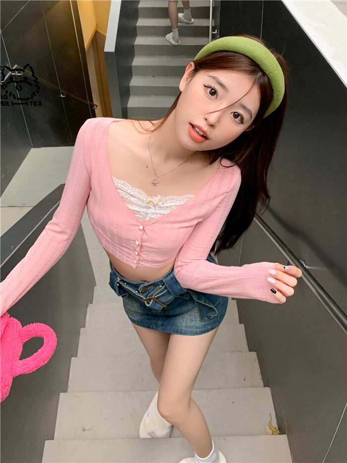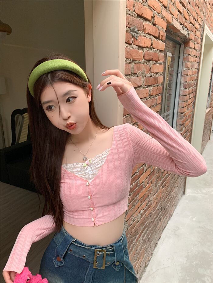 プラスサイズの婦人服 2023 ファットシスター春の新フェイクツーピース Tシャツピンクのレースのステッチ底入れシャツ痩身トップ 大きめサイズ スプリング 春物 8884167419858012