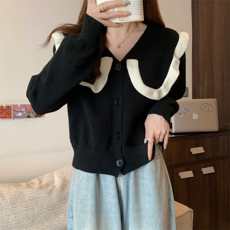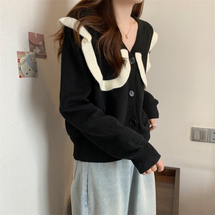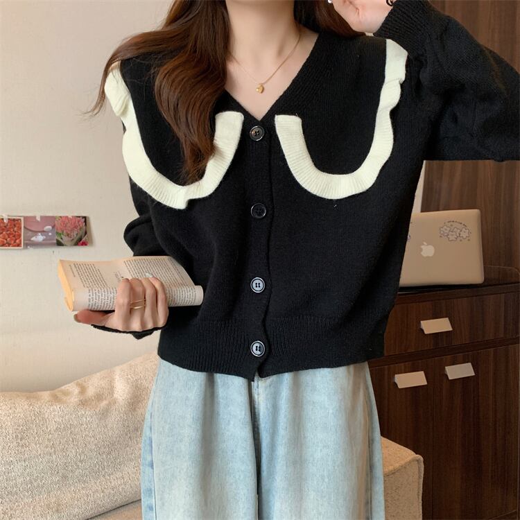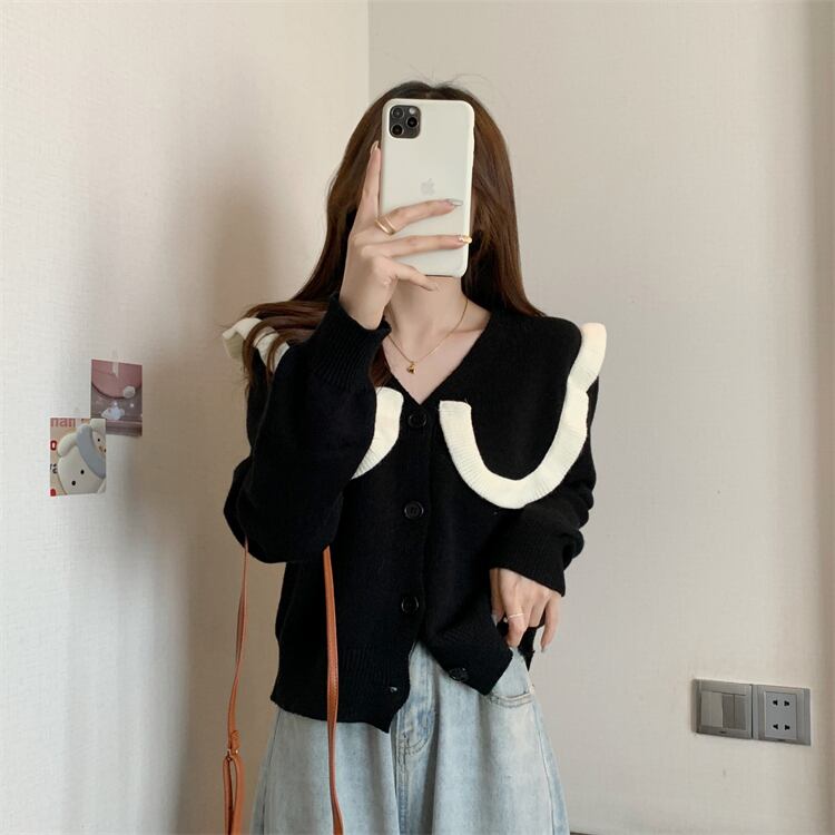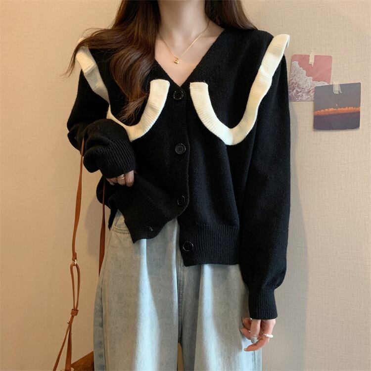 大きいサイズの婦人服 2023 トレンディな女性の春の新しい太った姉妹フレンチ カラー コントラスト カラー人形の襟緩い怠惰なスタイル ニット セーター 大きめサイズ スプリング 春物 888417381530990
