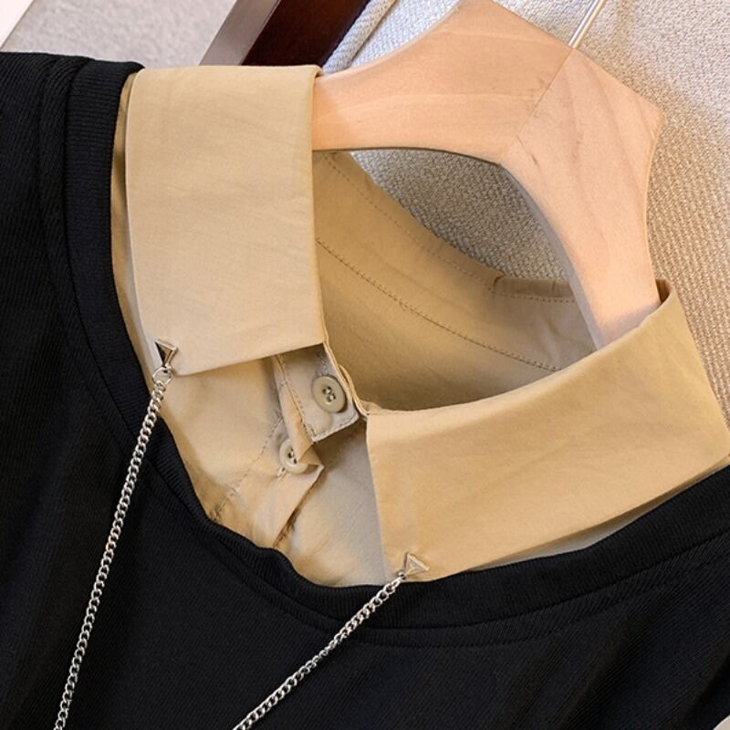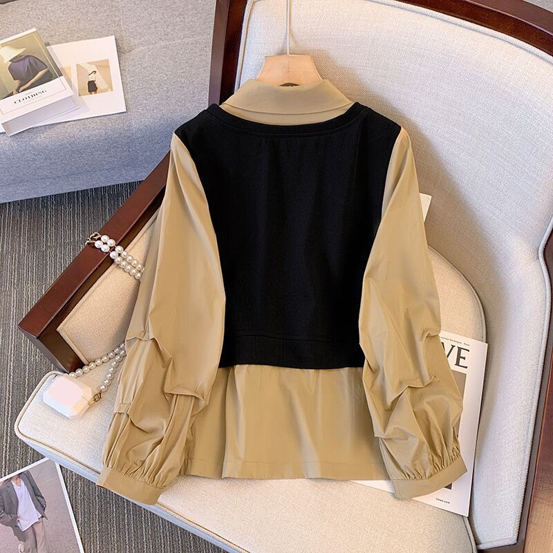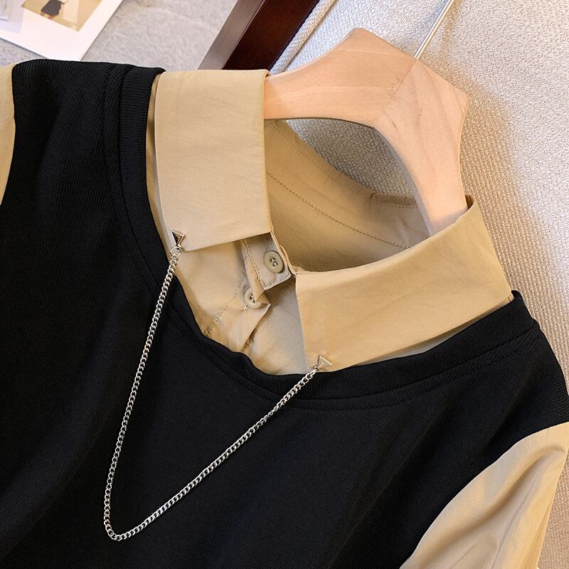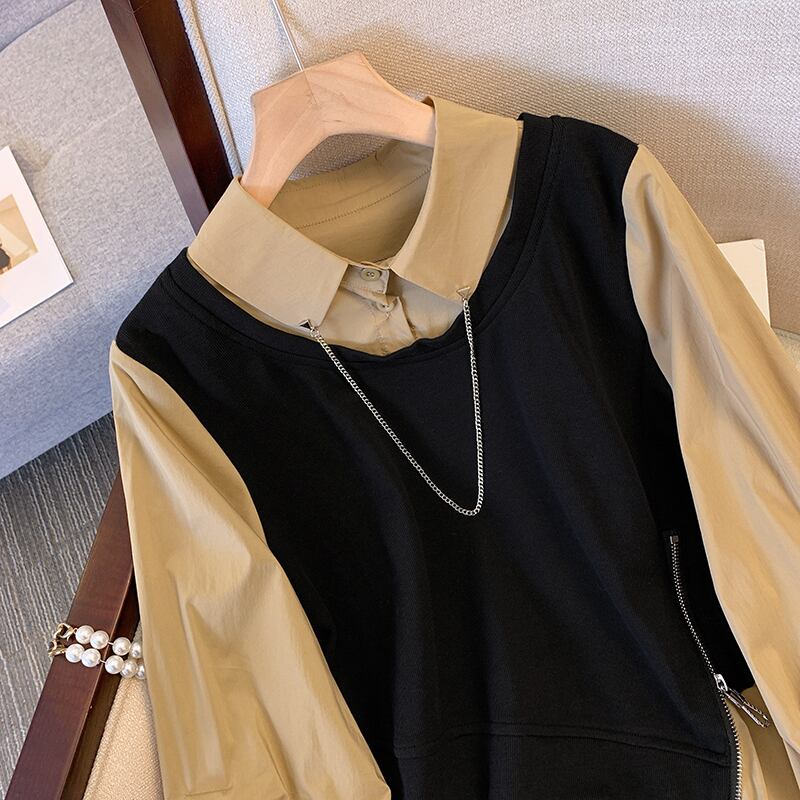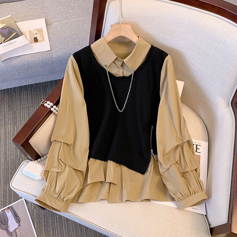 大きいサイズの婦人服 2023 春の新しいスタイルの太った姉妹ルーズで薄いチェーン チェーン年齢減少スプライシング偽のツーピース肉カバー シャツ 大きめサイズ スプリング 春物 8884121121051620