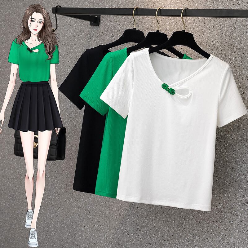 プラスサイズの婦人服2023夏の新しいファットシスターは、薄いレトロな気質のソリッドカラーのオールマッチ半袖カジュアルTシャツに見えます 大きめサイズ サマー 夏物 8884120576952378
