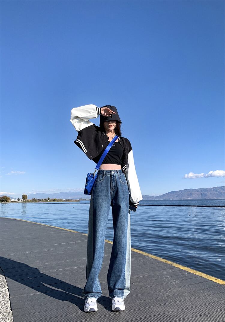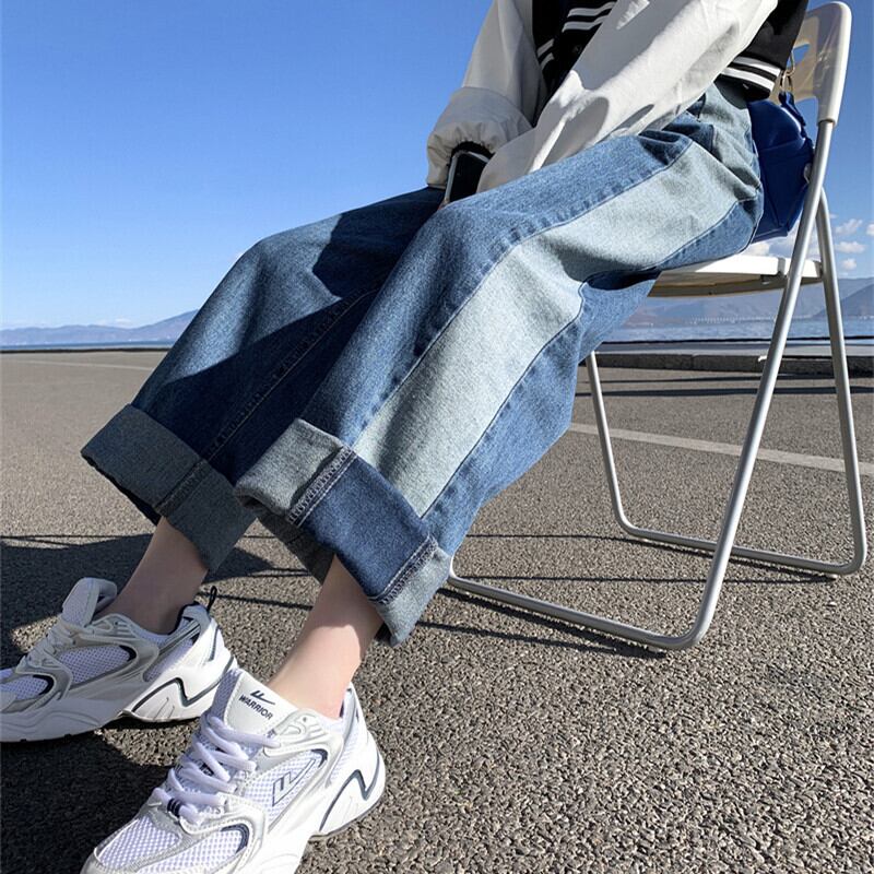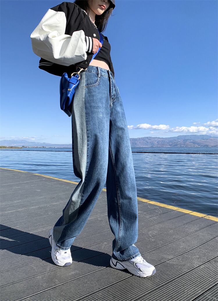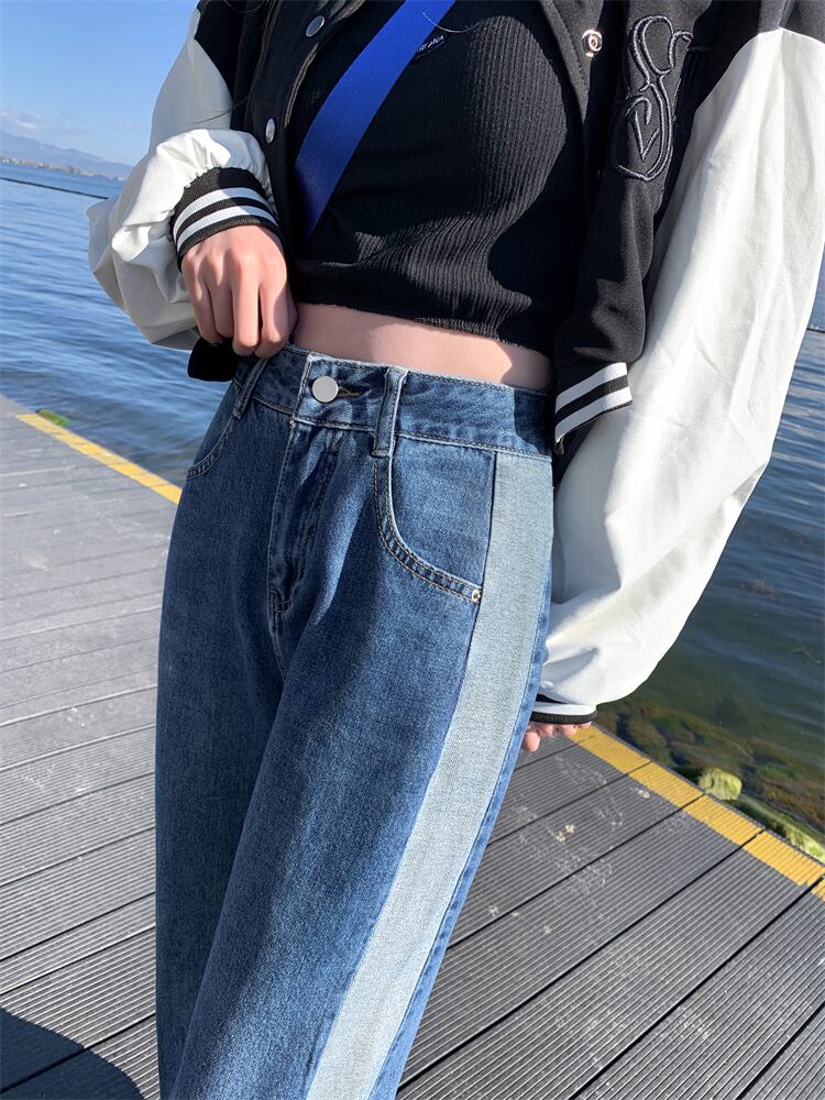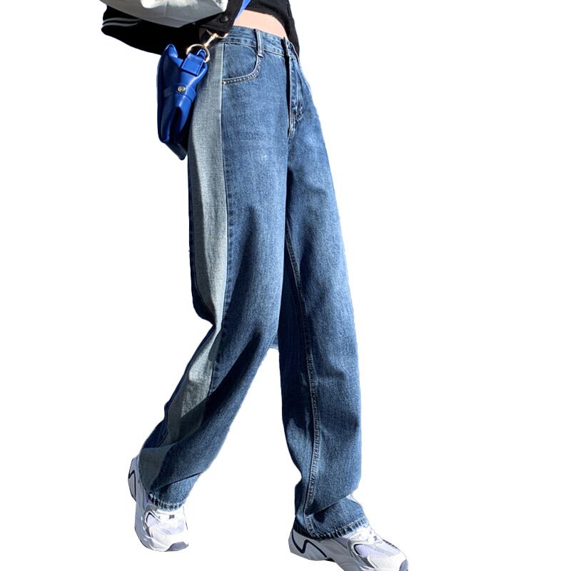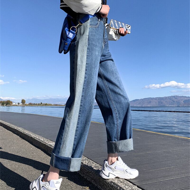 プラスサイズの婦人服 2023 春服脂肪姉妹新しいサイドステッチコントラストカラージーンズストレートレッグワイドレッグパンツ 大きめサイズ スプリング 春物 8884157295314070