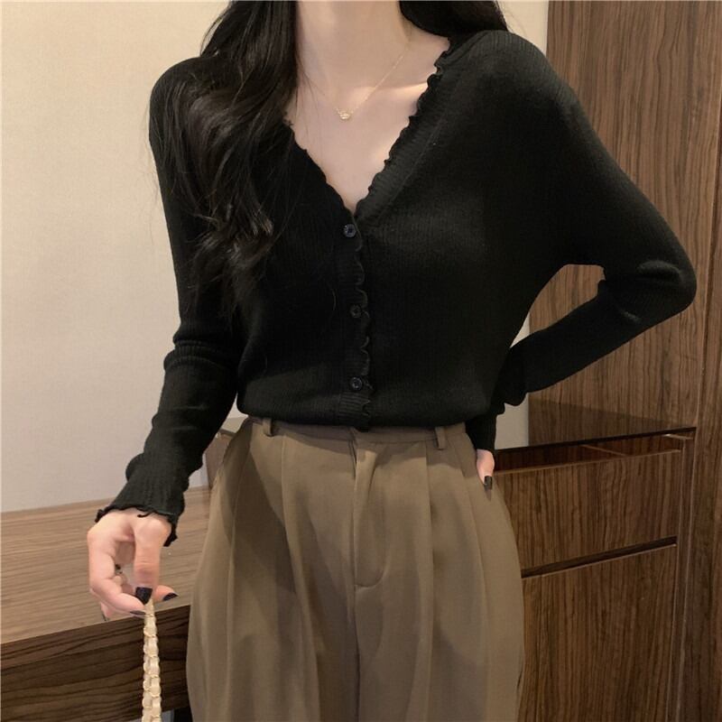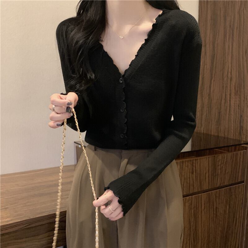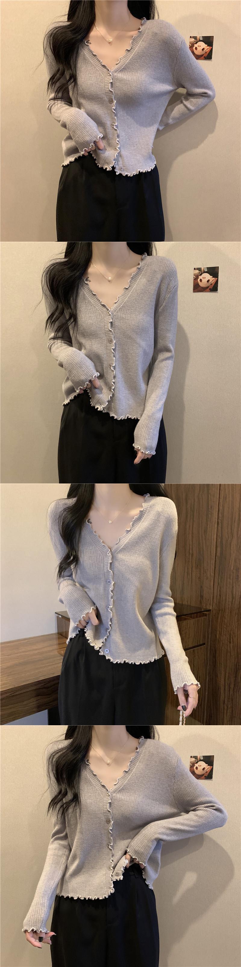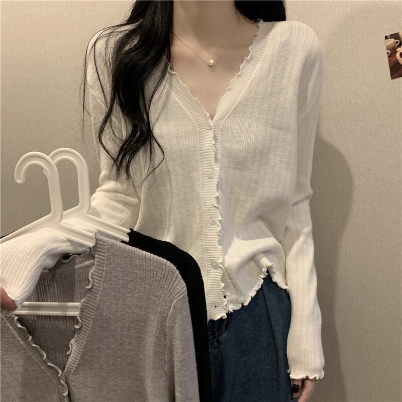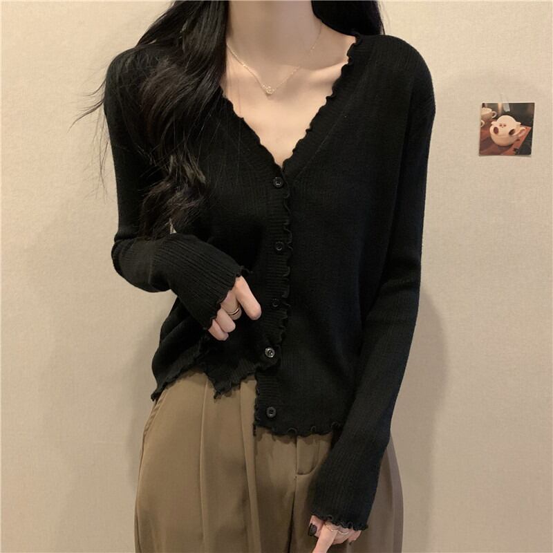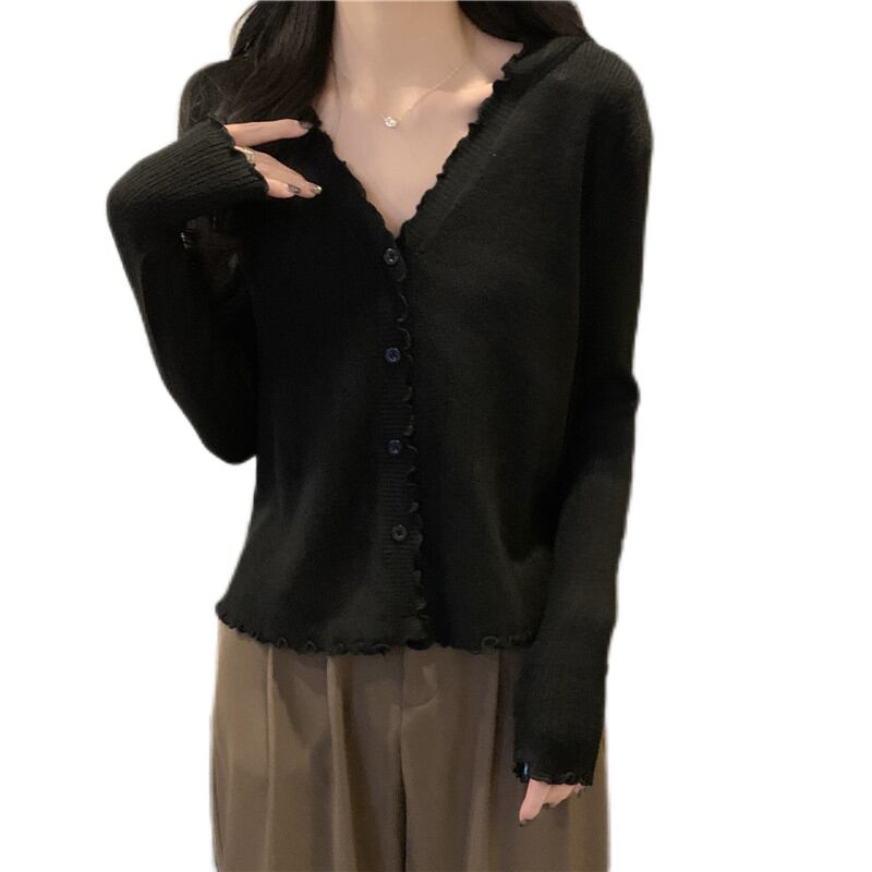 大きいサイズの婦人服 2023 トレンディな女性の春の新しい太った姉妹に見える薄い長袖の木耳縁 V ネック カーディガン底入れニット ロング 大きめサイズ スプリング 春物 Vネック 888419565170052