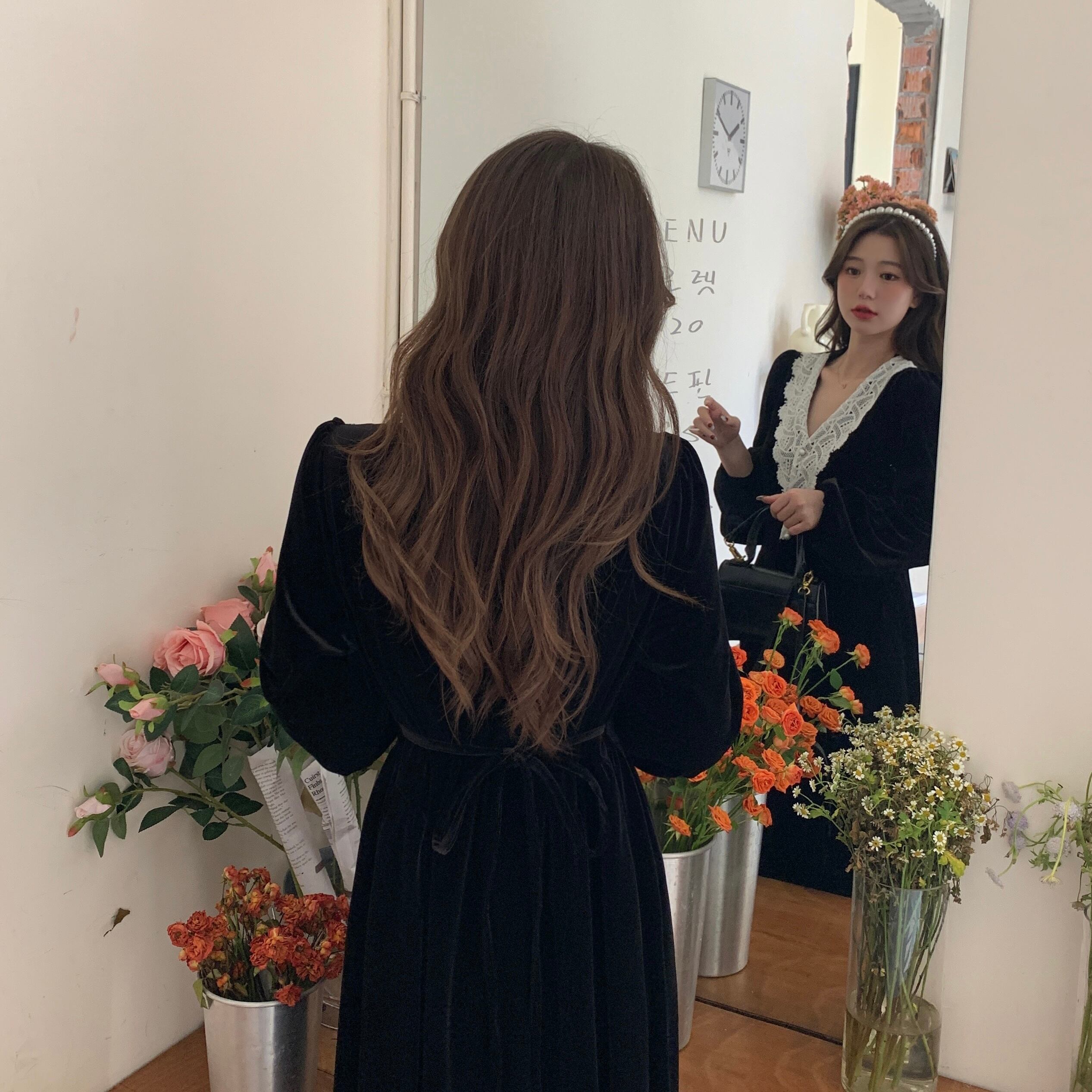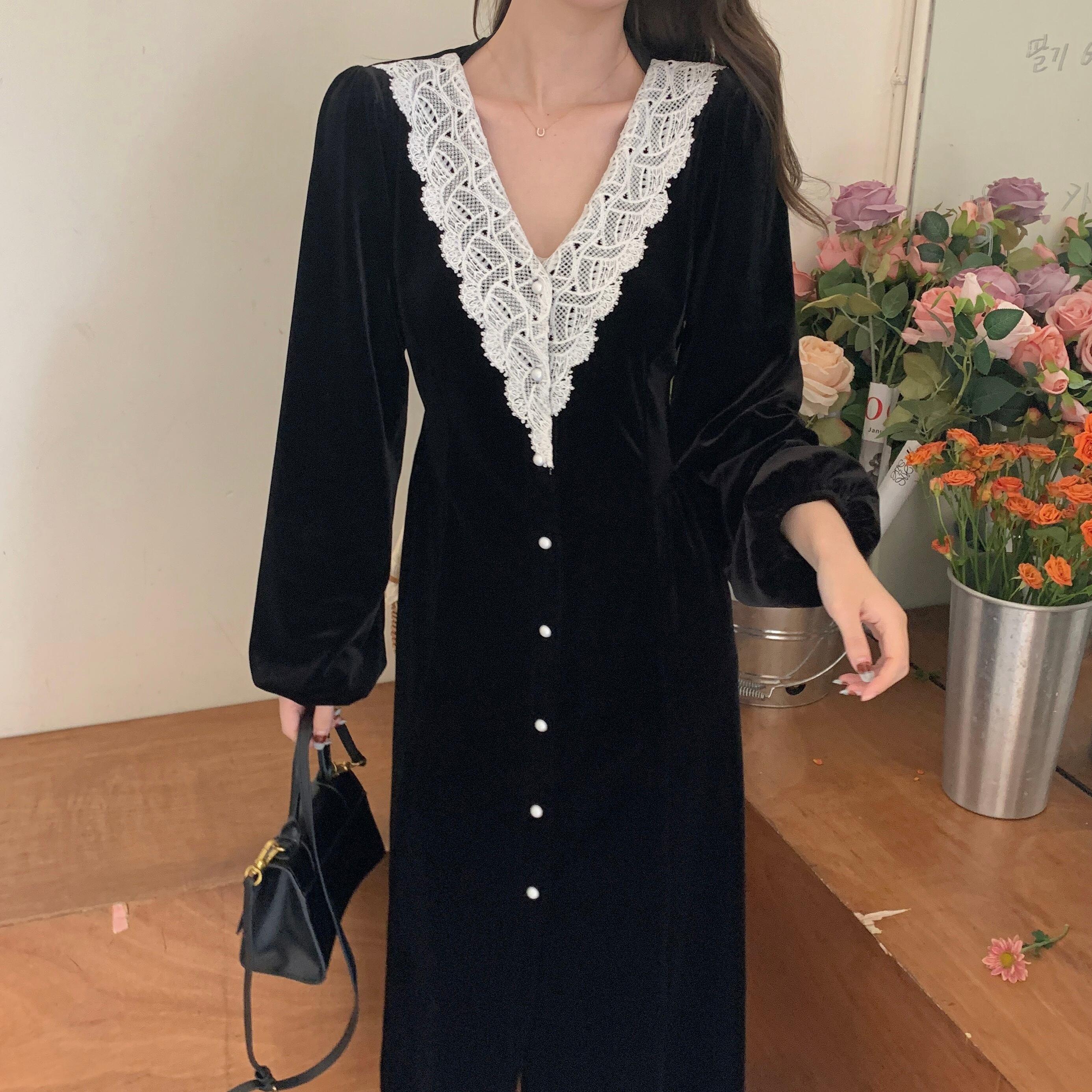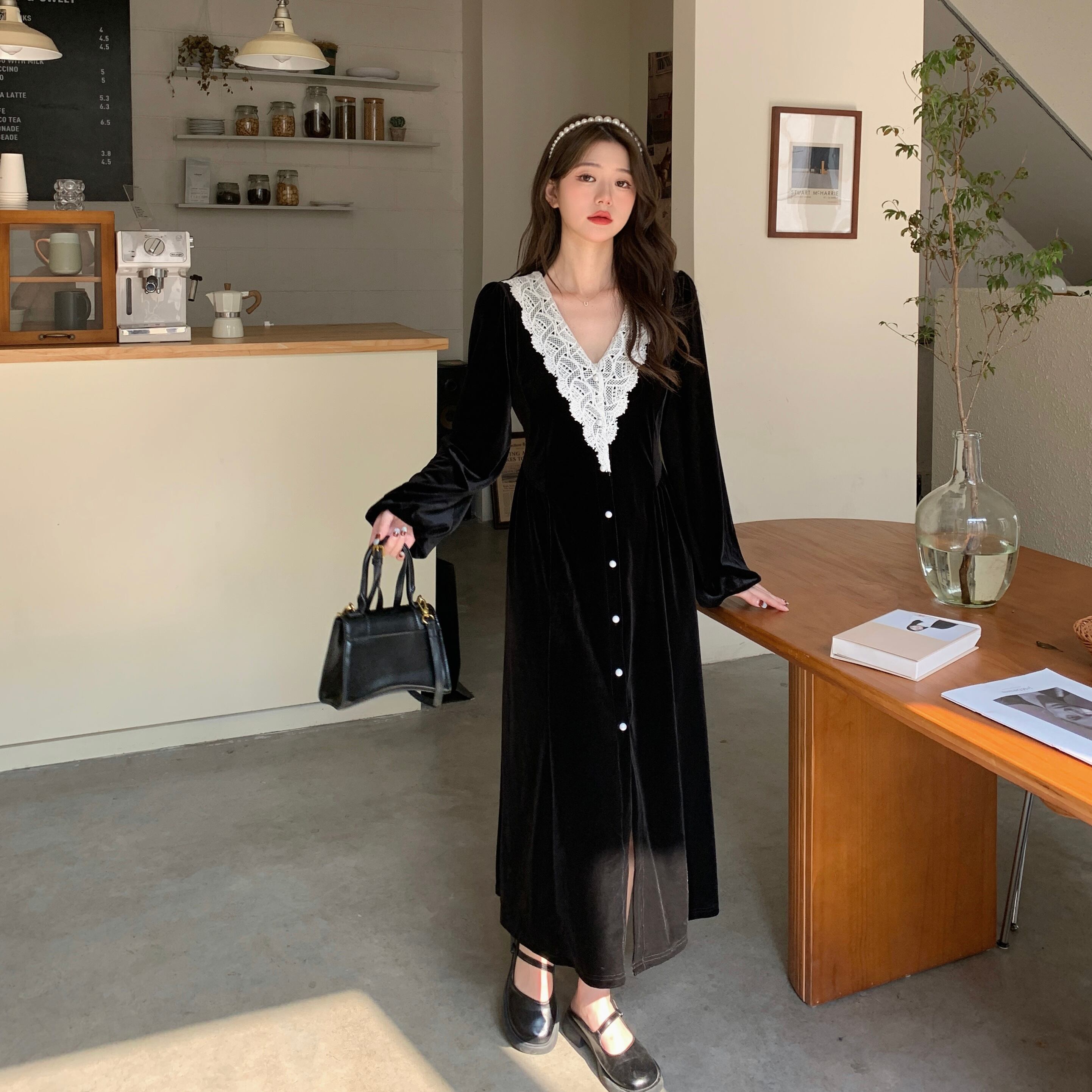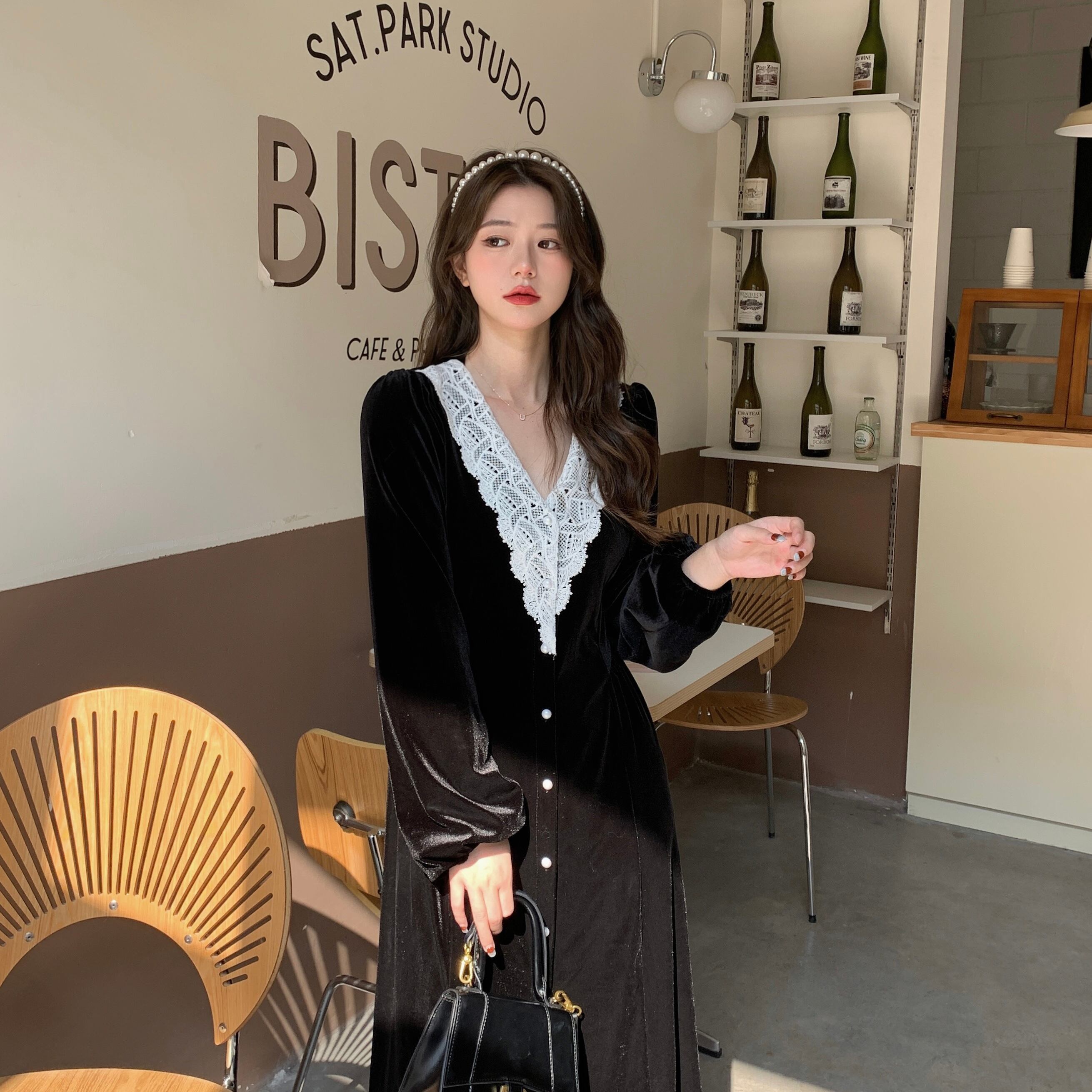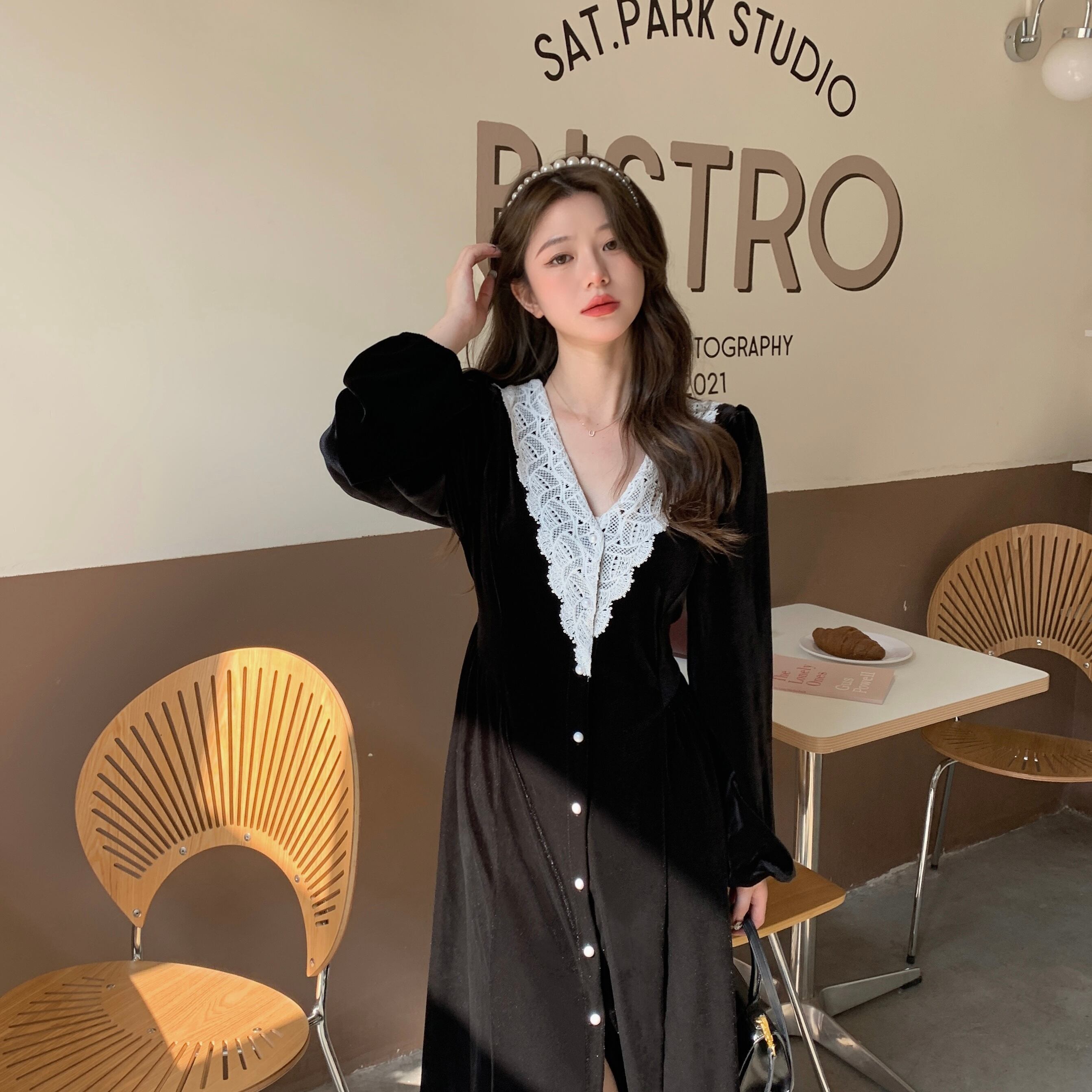 プラスサイズの婦人服2023ファットシスター春の新しいフレンチスタイルのレトロな薄いドレスとレースエッジのベルベットのドレス 大きめサイズ スプリング 春物 8884155746019961