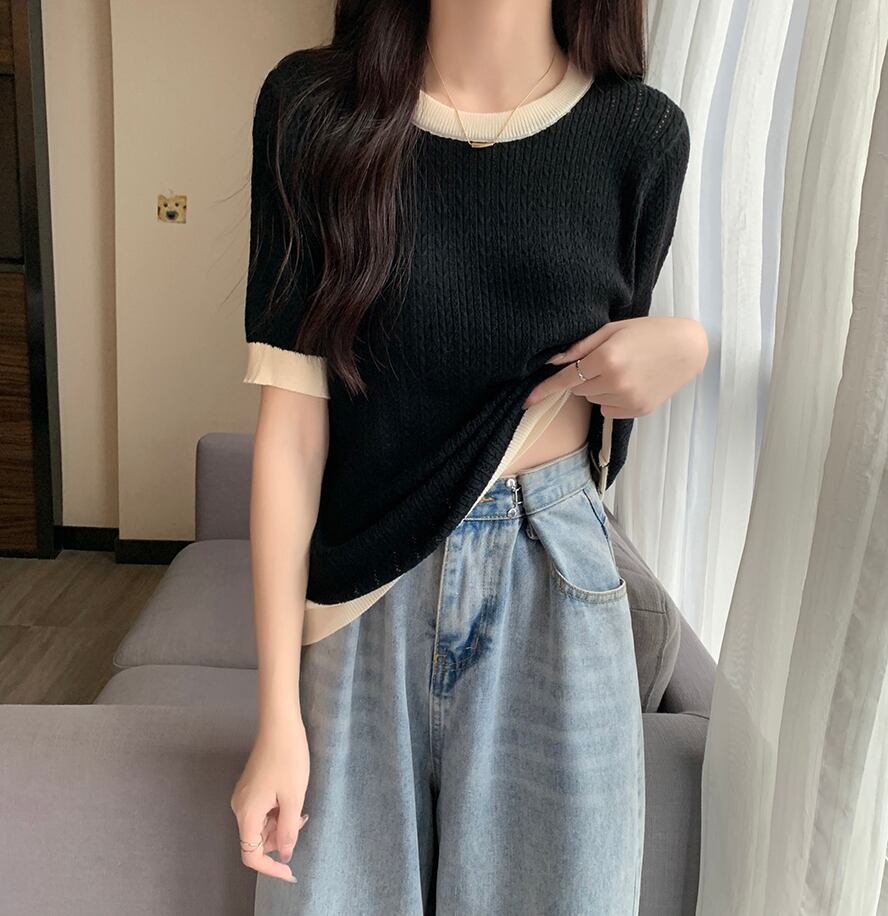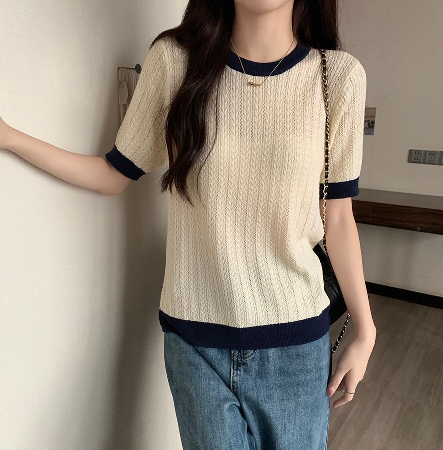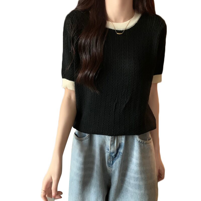 大きいサイズの婦人服 2023 夏の新しいファット シスター ファッション コントラスト カラー ラウンド ネック シックなスリム カジュアル セーター 大きめサイズ サマー 夏物 Oネック 888419426491128
