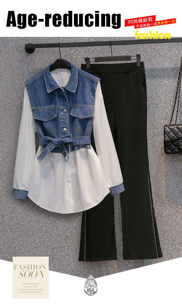 プラスサイズの婦人服 2023 ファットシスター春の新作デニムスプライシングシャツ表示薄いボディカバーカジュアルパンツ 2 点セット 大きめサイズ スプリング 春物 8884166485182611