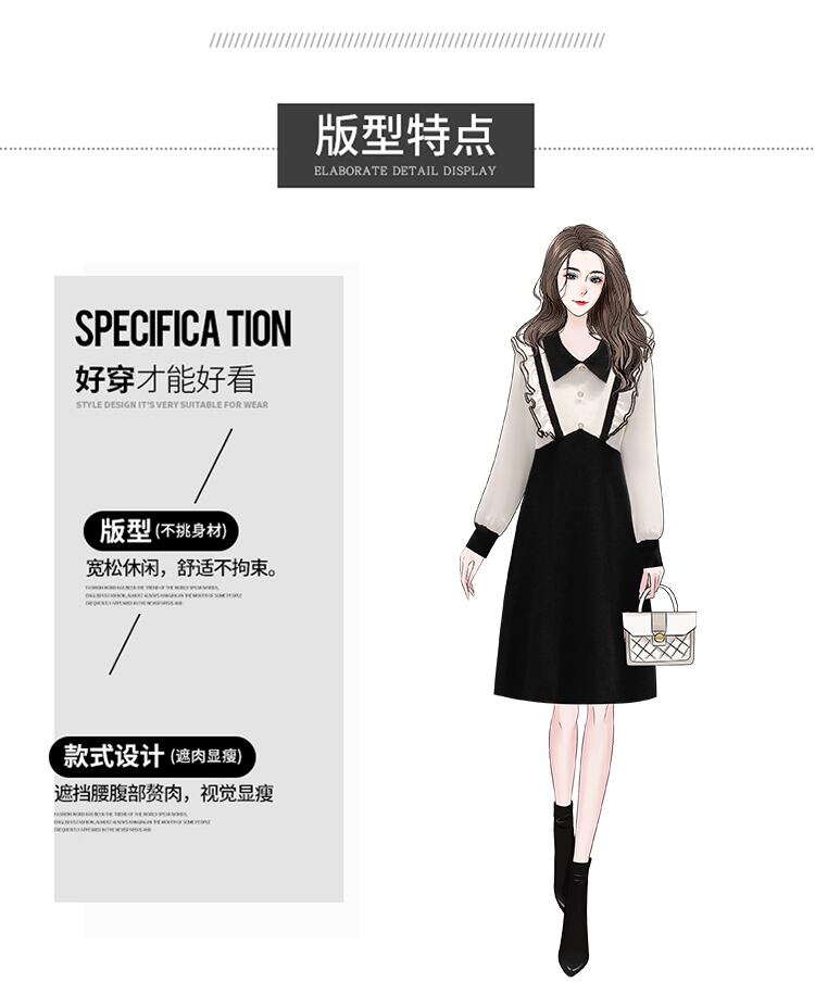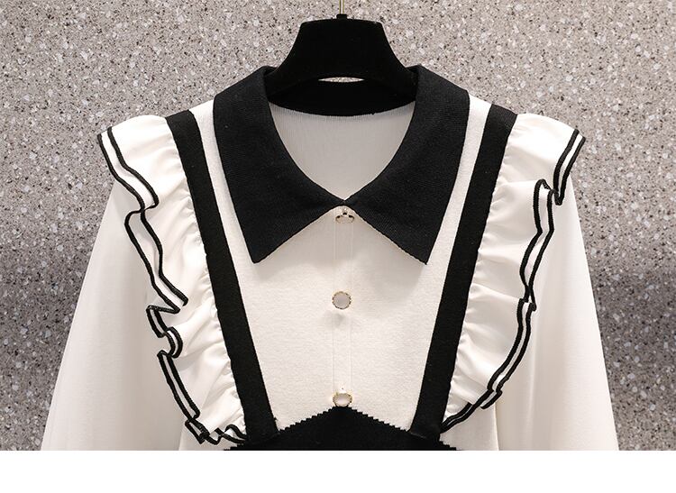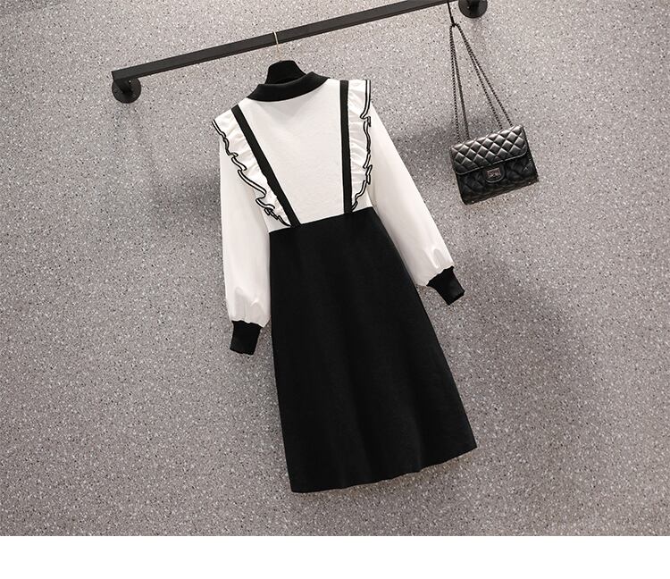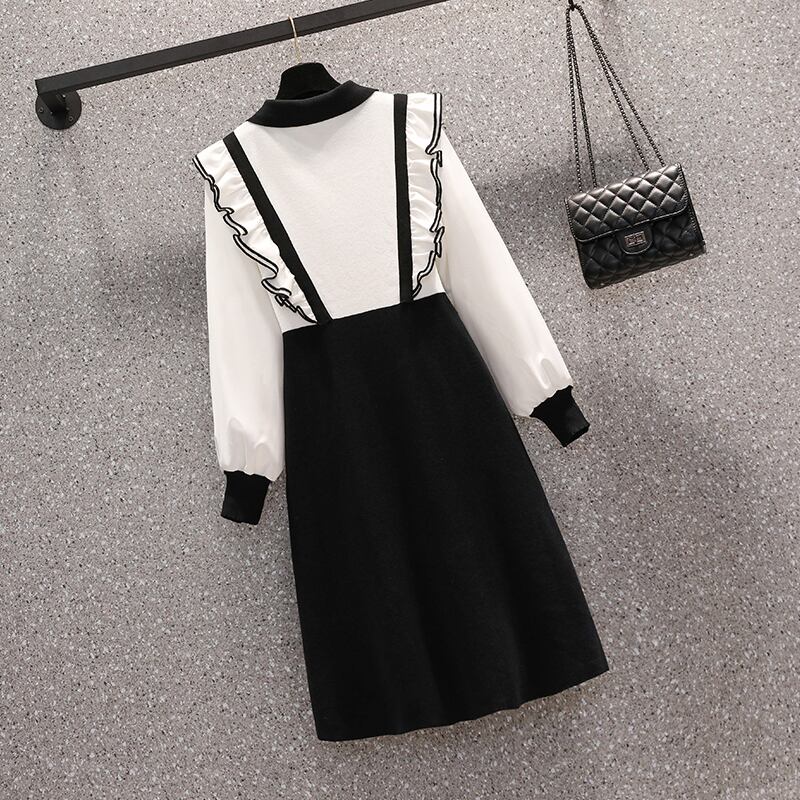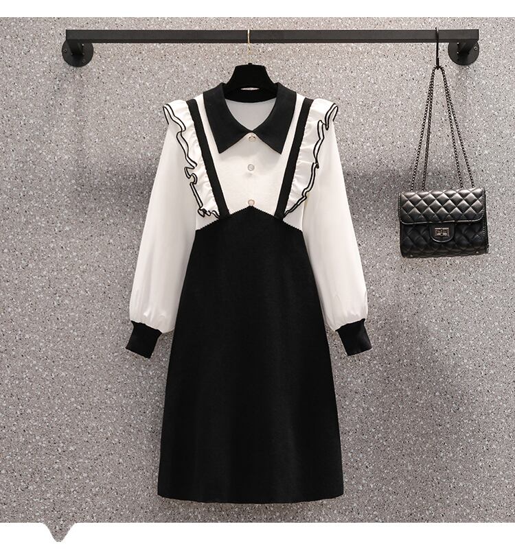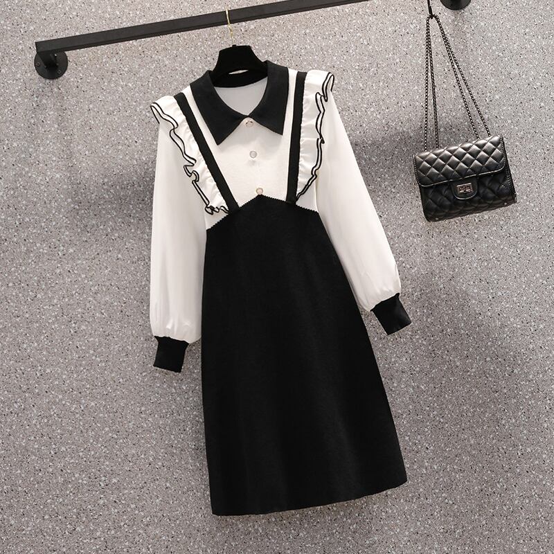 プラスサイズの婦人服 2023 ファットシスター春の新しいヘップバーンスタイルのフェイクツーピース黒ニット長袖ドレス女性 ロング ブラック 大きめサイズ スプリング 春物 888415394876507