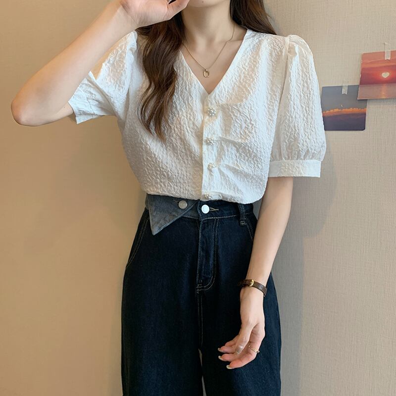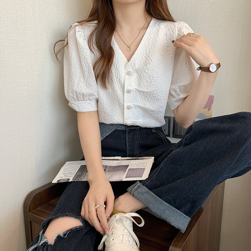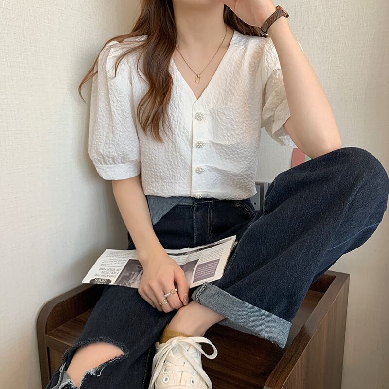 プラスサイズの婦人服 2023 ファットシスター夏新フレンチ全試合トップスパフスリーブ V ネック薄型シャツ女性 大きめサイズ サマー 夏物 Vネック 8884153642913297