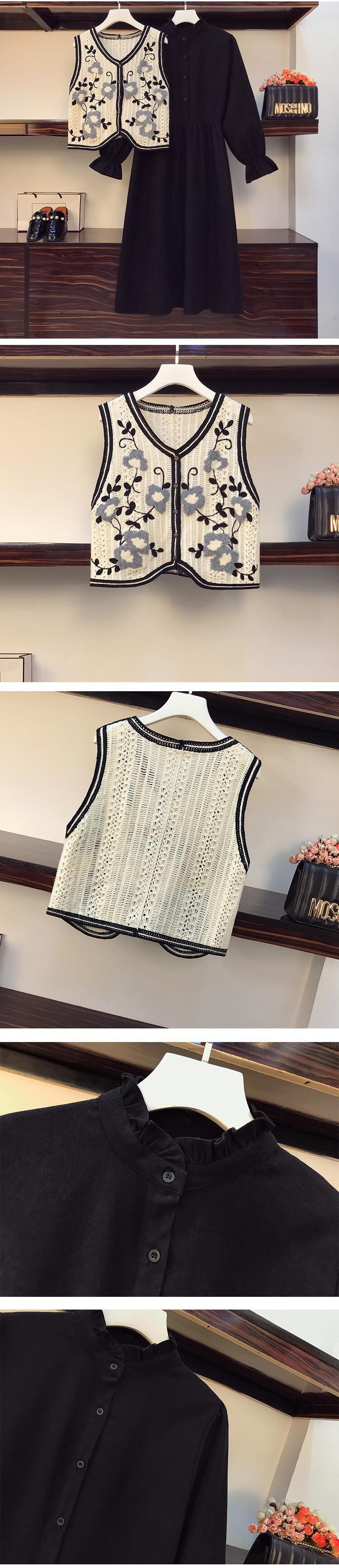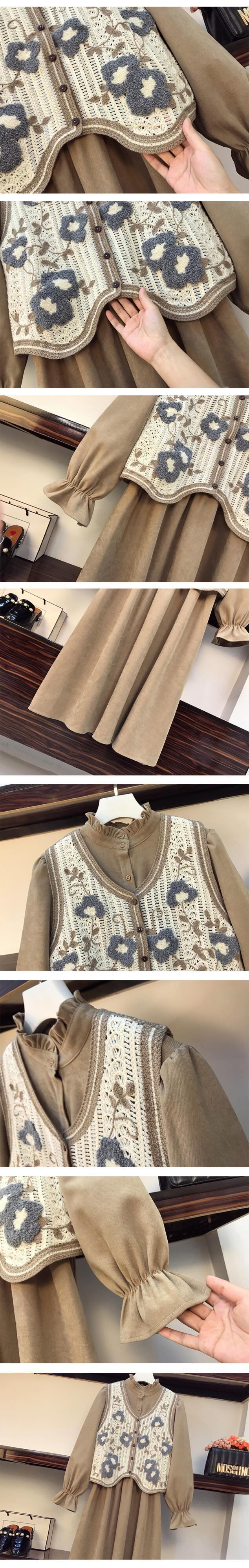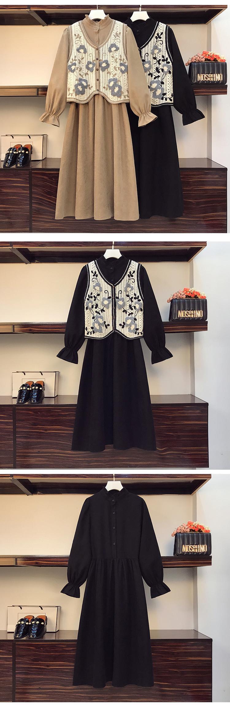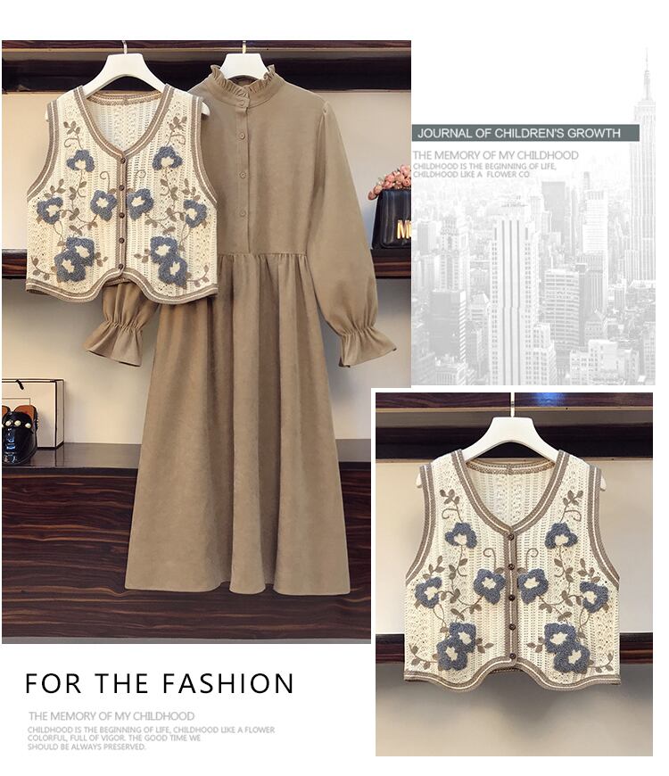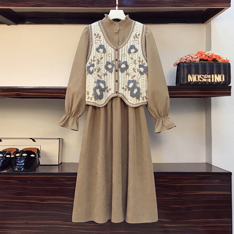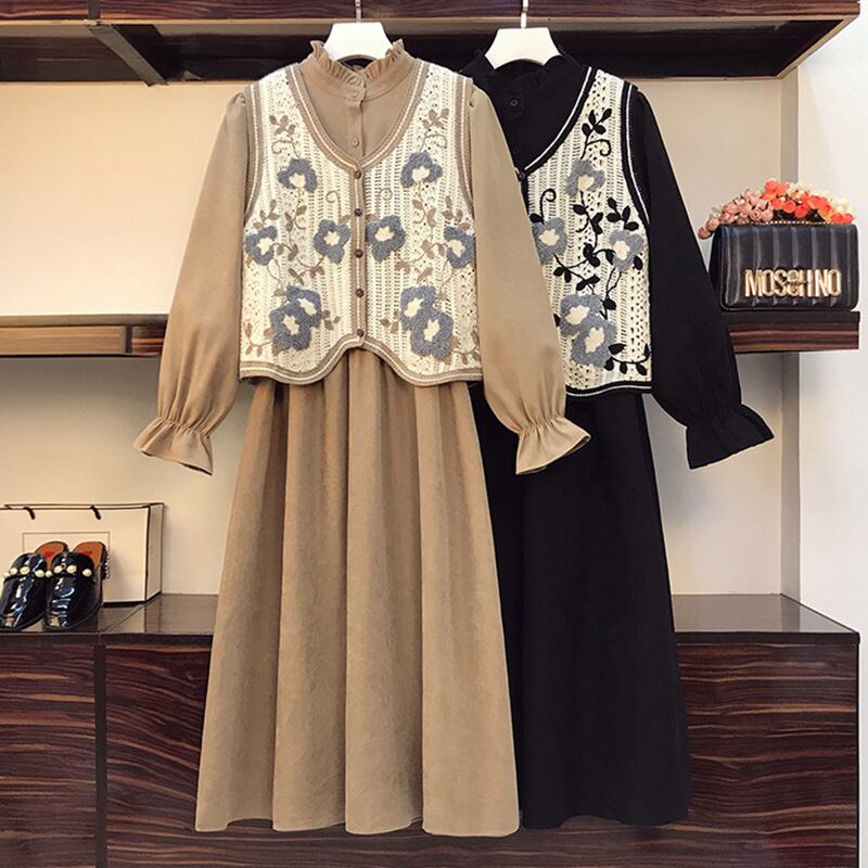 プラスサイズの婦人服 2023 トレンディな女性の春の新しい太った姉妹に見える薄いレトロなニットベストミドル丈のドレス 2 点セット 大きめサイズ スプリング 春物 8884124721219255
