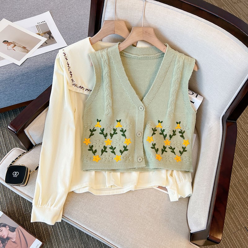大きいサイズの婦人服太った妹に見える薄いファッション シャツ トップ スーツ人形襟ニット ベスト シャツ 2 点セット 大きめサイズ 8884135456497604