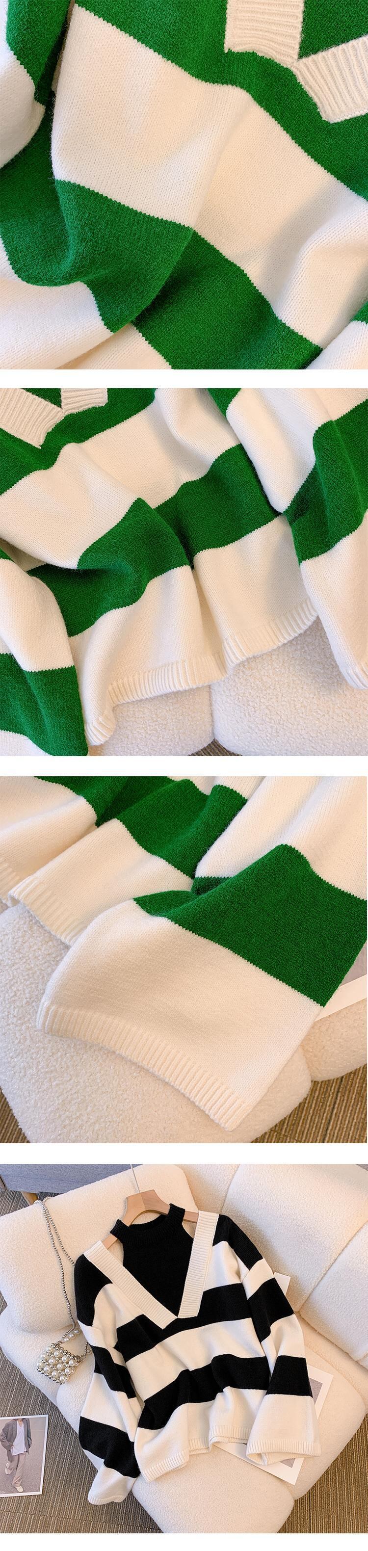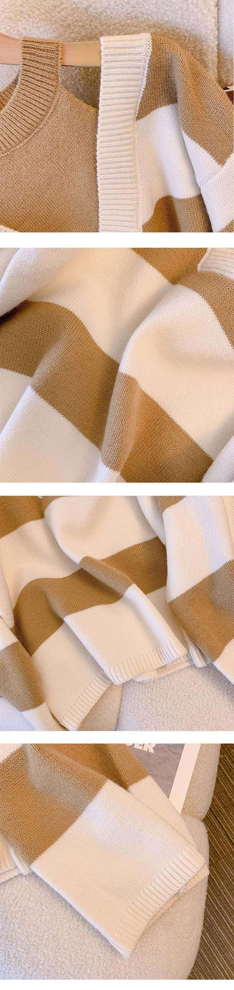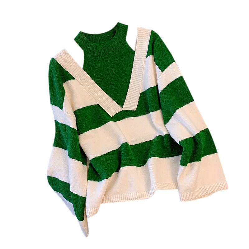 プラスサイズの婦人服 2023 春の新しいスタイルの太った姉妹は薄くて気質の縞模様の配色の継ぎ合わせの偽のツーピースのニットのセーターの女性に見えます 大きめサイズ スプリング 春物 ストライプ 888411569720489