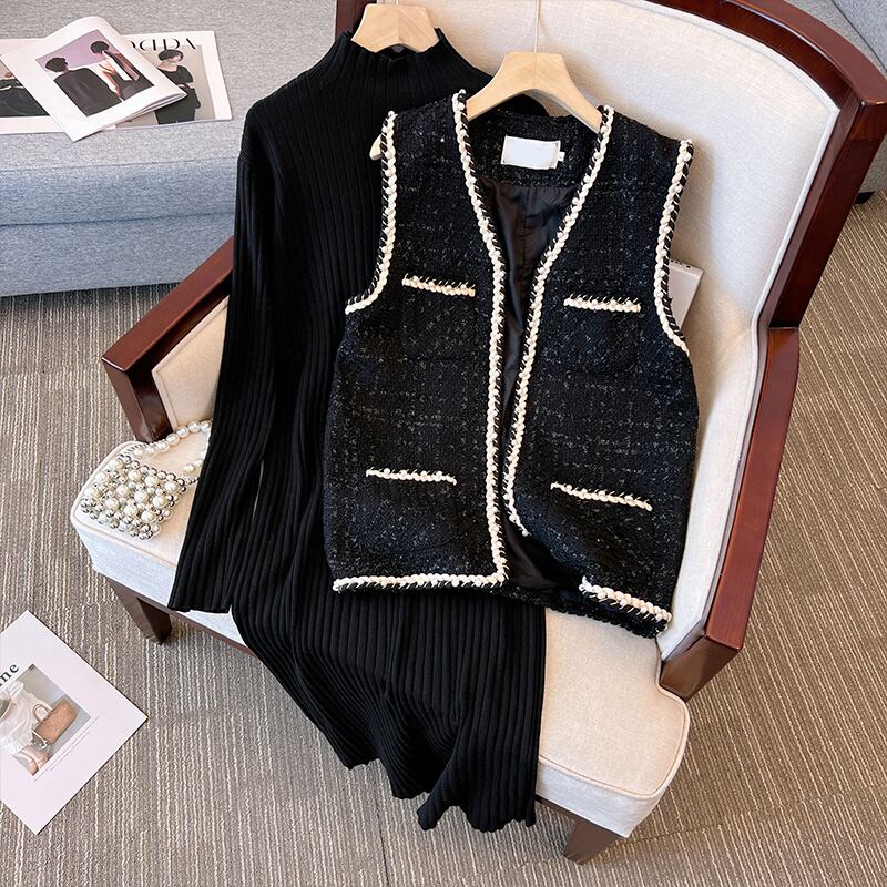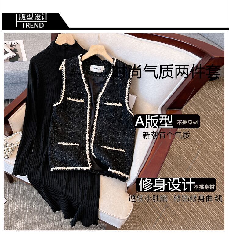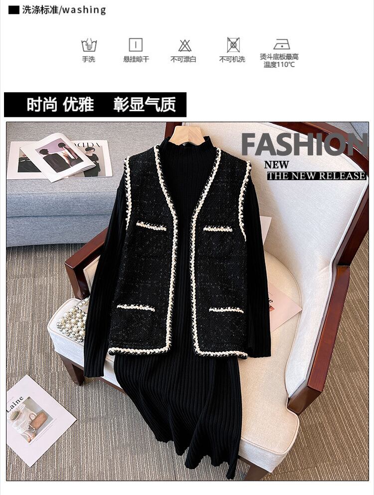 プラスサイズの婦人服 2023 ファットシスター春の新ファッションツイードベストニットドレスツーピースセット 大きめサイズ スプリング 春物 8884167978319840