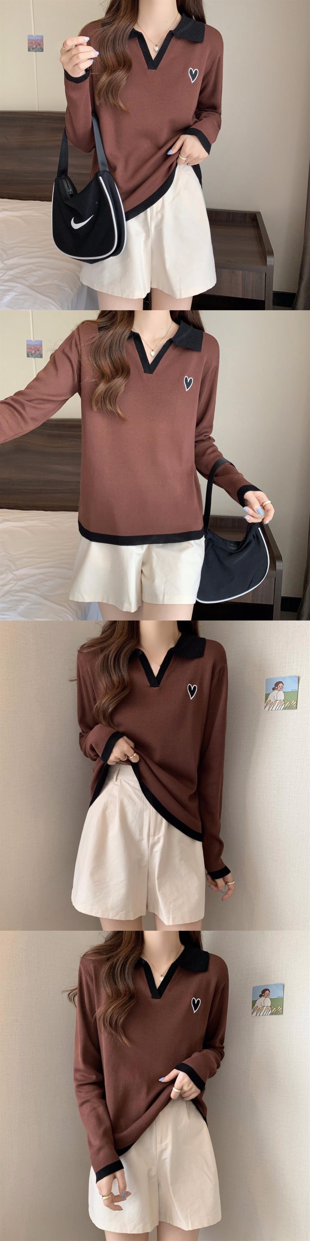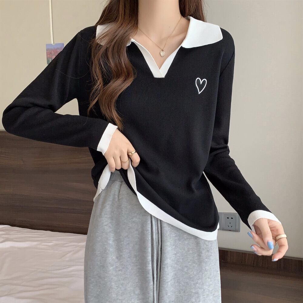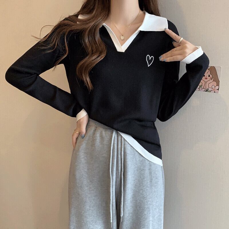 大きいサイズの婦人服 2023 春服脂肪姉妹新しい痩身コントラストカラー刺繍ポロ襟長袖ニットトップ女性 ロング 大きめサイズ スプリング 春物 8884110817143779