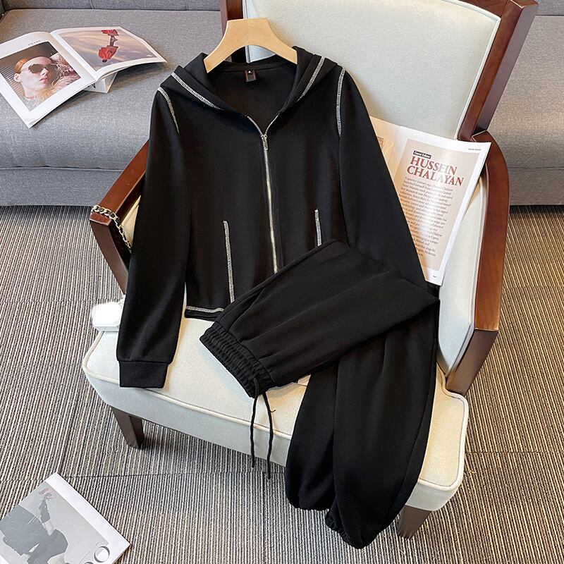 大きいサイズの婦人服 2023 トレンディな女性の春の新しい太った姉妹に見える薄いカジュアル ファン フード付きトップ カジュアル パンツ ツーピース スーツ 大きめサイズ スプリング 春物 8884142534177642