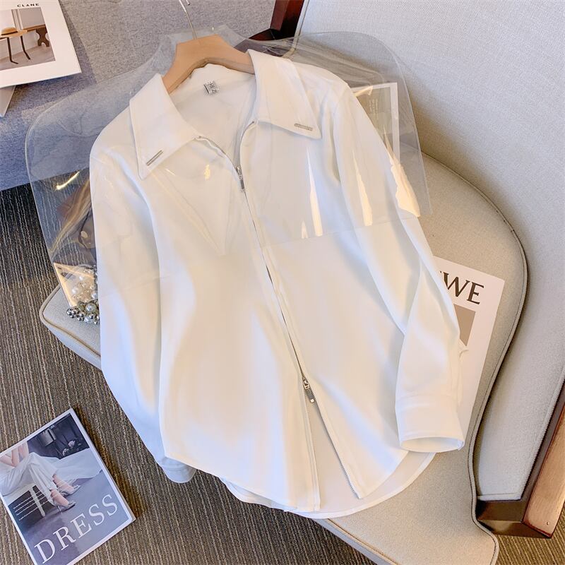 プラスサイズの婦人服 2023 春の新しいスタイルの太った姉妹のシックなデザインの気質の気質のジッパー カジュアルなカバー肉無地トップ 大きめサイズ スプリング 春物 ソリッドカラー 8884150417602365