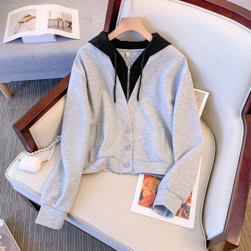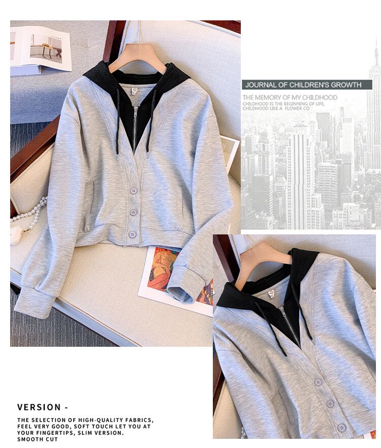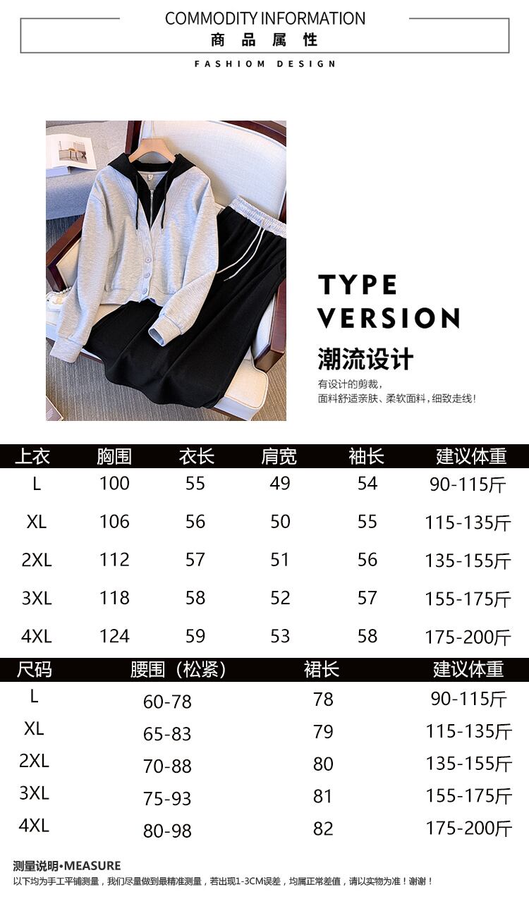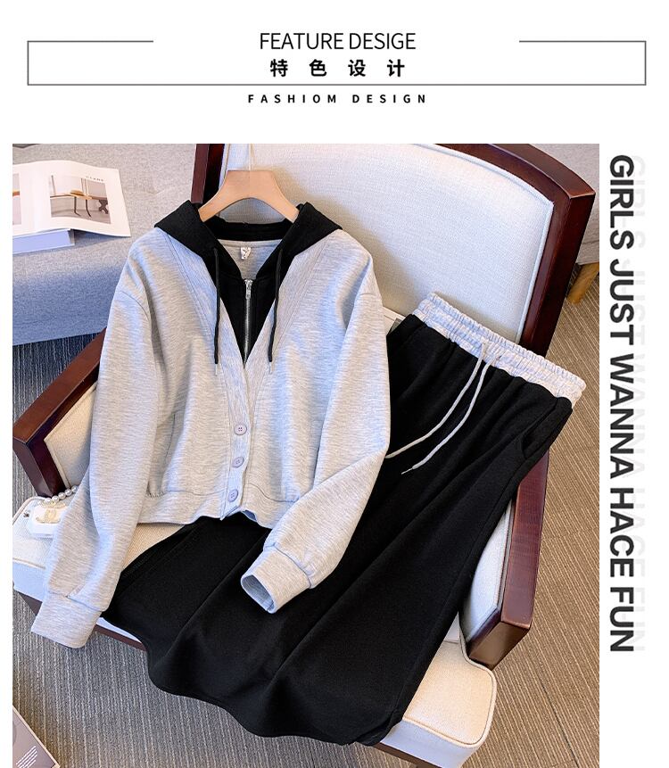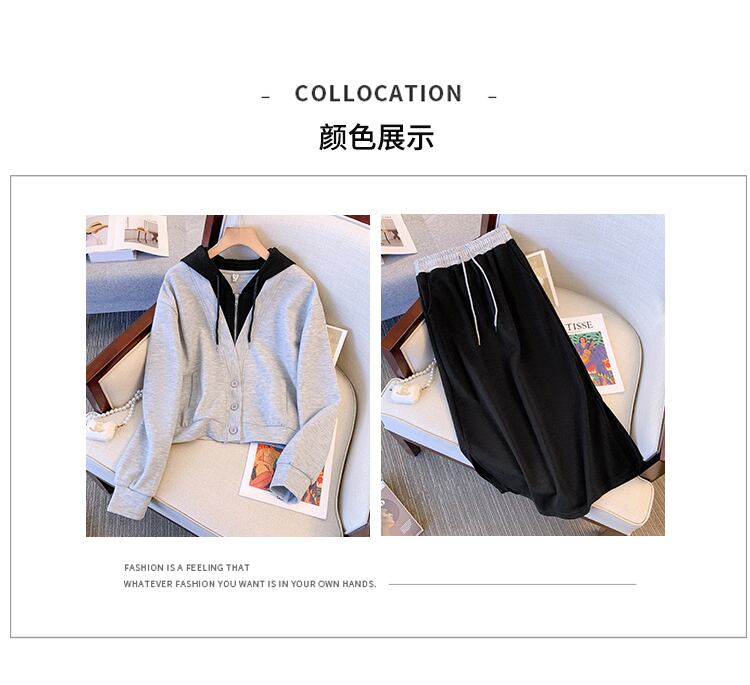 プラスサイズの婦人服 2023 春の新作服脂肪姉妹新しい偽ツーピースフード付きセータースリットスカートツーピーススーツ 大きめサイズ スプリング 春物 88841745469695